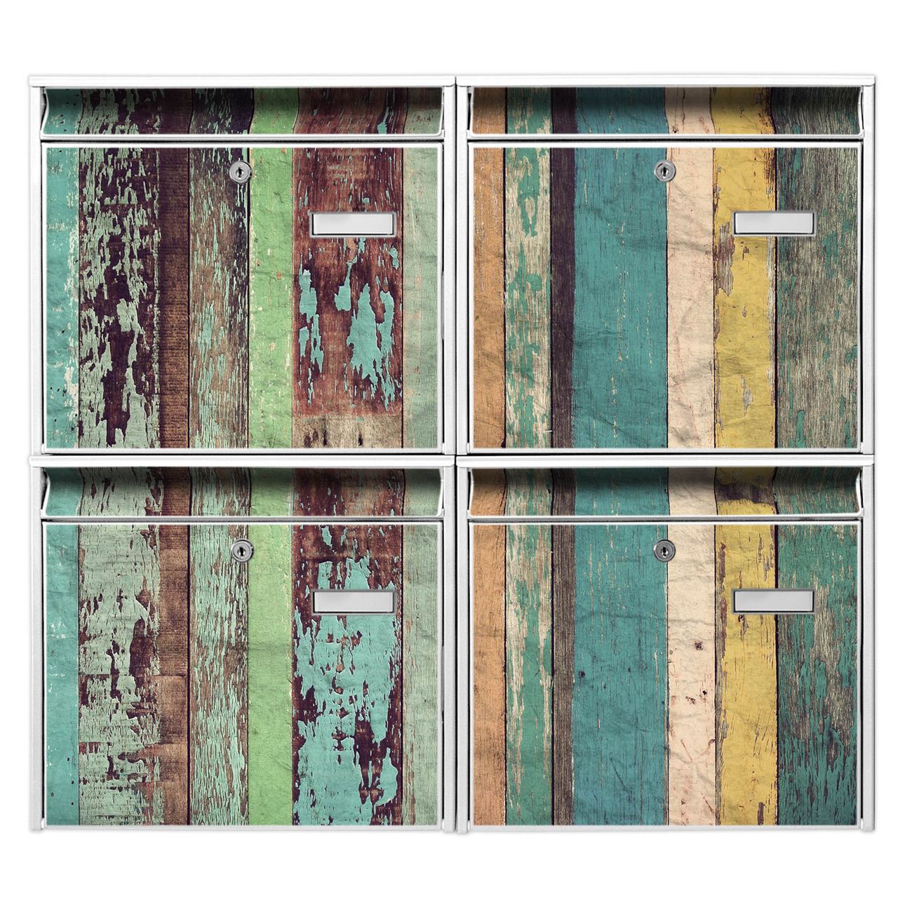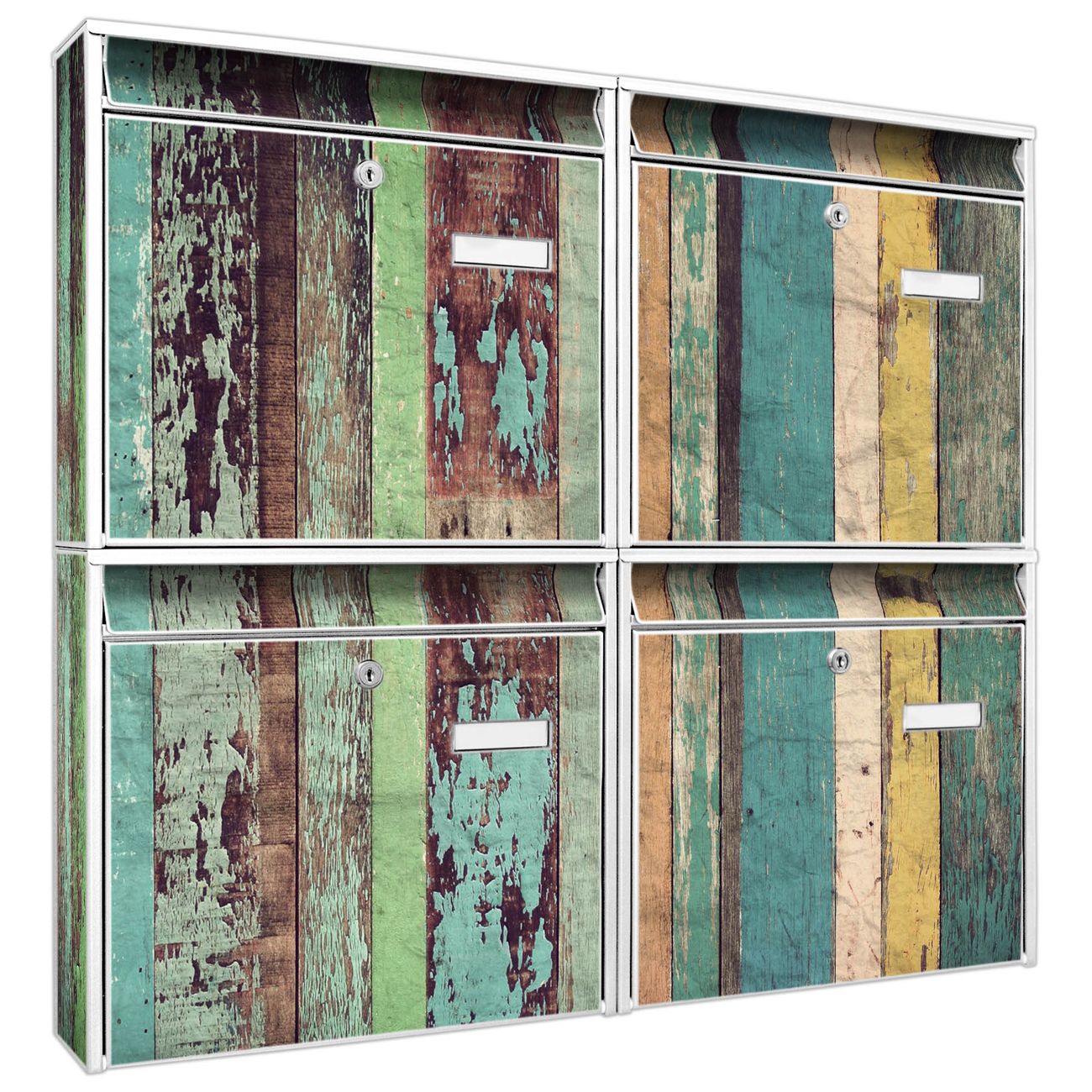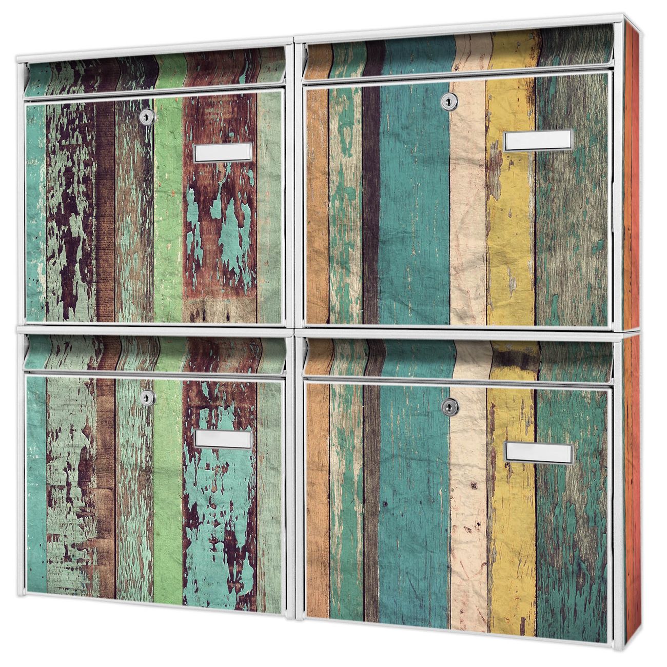 FUNKTION: Die Burg-Wächter Briefkastenanlage mit Motiv Bunte Bretterwand bietet Ihnen ausreichend Fassungsvermögen um auch A4 und C4 Sendungen zu empfangen. Das integrierte Namensschild lässt sich individuell beschriften. Wählen Sie aus den Grundfarben weiß, silber und schwarz. DESIGN: Die 4 Briefkästen haben ein ansprechendes und zeitloses Design, ohne dabei auf Funktionalität zu verzichten. Das Material ist sehr stabil, wetterfest und rostfrei. Durch das Motiv Bunte Bretterwand werden die Postkästen zu einem Blickfang. DETAILS: Die Postkästen bestehen aus verzinktem Stahl der zusätzlich mit Klarlack versiegelt wurde. Die Kästen sind gesamt 64,5cm hoch, 72,5cm breit und 10cm tief. Das Motiv besteht aus einer wetter- und UV-festen Folie, die Ihren Briefkasten zusätzlich vor Kratzern schützt. Die Postkästen werden mit Montagematerial, je einem Namensschild und je zwei Schlüsseln geliefert. NUTZEN: Das Briefkastenset eignet sich für die Wandmontage, die Größe bietet genügend Platz für Sendungen aller Art. Das zeitlose Design sowie die stabile Bauart bieten Ihnen einen treuen Begleiter für Ihre Post. BANJADO: