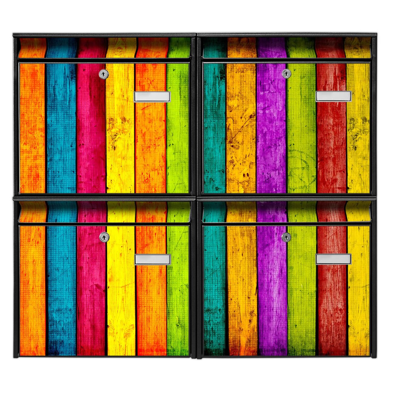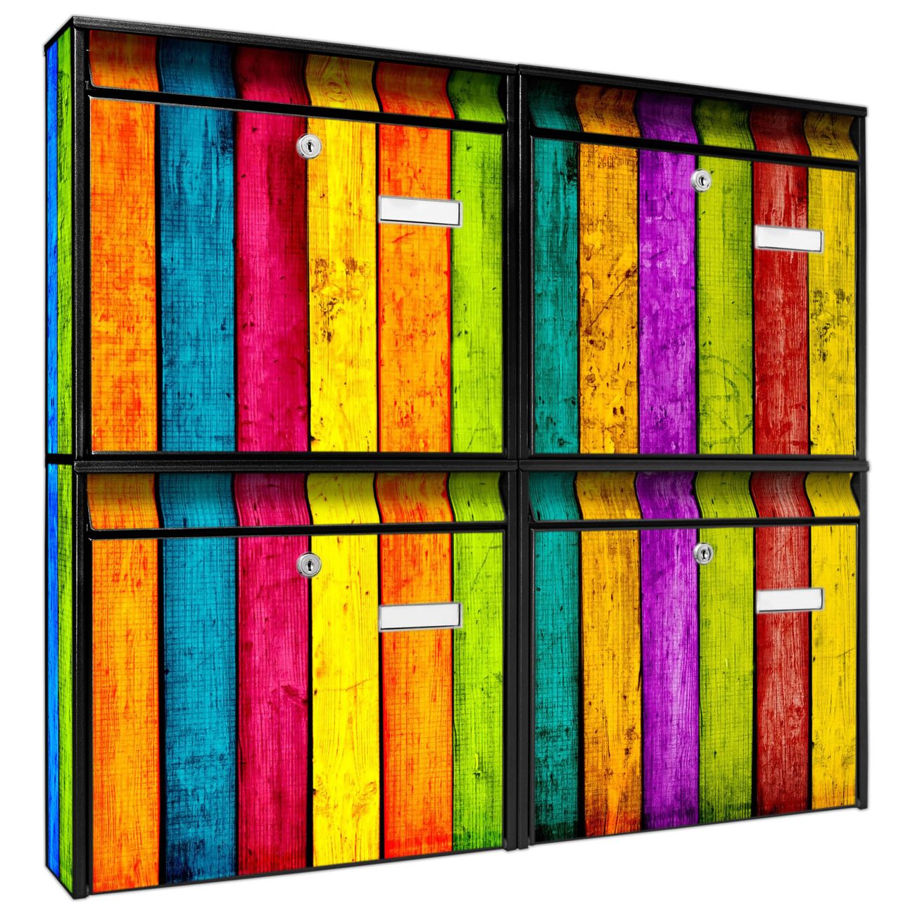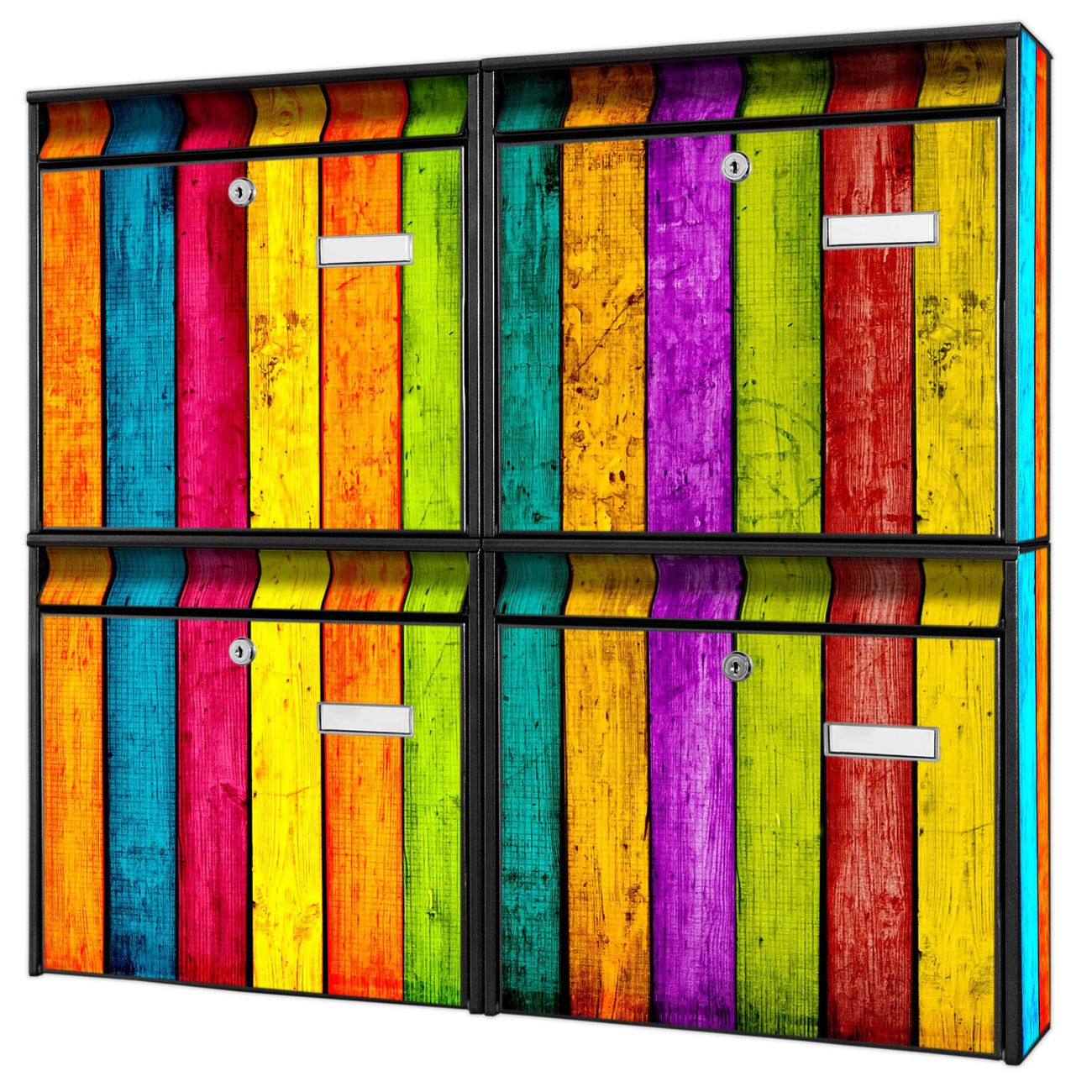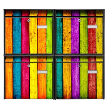 FUNKTION: Die Burg-Wächter Briefkastenanlage mit Motiv Bunte Holzlatten bietet Ihnen ausreichend Fassungsvermögen um auch A4 und C4 Sendungen zu empfangen. Das integrierte Namensschild lässt sich individuell beschriften. Wählen Sie aus den Grundfarben weiß, silber und schwarz. DESIGN: Die 4 Briefkästen haben ein ansprechendes und zeitloses Design, ohne dabei auf Funktionalität zu verzichten. Das Material ist sehr stabil, wetterfest und rostfrei. Durch das Motiv Bunte Holzlatten werden die Postkästen zu einem Blickfang. DETAILS: Die Postkästen bestehen aus verzinktem Stahl der zusätzlich mit Klarlack versiegelt wurde. Die Kästen sind gesamt 64,5cm hoch, 72,5cm breit und 10cm tief. Das Motiv besteht aus einer wetter- und UV-festen Folie, die Ihren Briefkasten zusätzlich vor Kratzern schützt. Die Postkästen werden mit Montagematerial, je einem Namensschild und je zwei Schlüsseln geliefert. NUTZEN: Das Briefkastenset eignet sich für die Wandmontage, die Größe bietet genügend Platz für Sendungen aller Art. Das zeitlose Design sowie die stabile Bauart bieten Ihnen einen treuen Begleiter für Ihre Post. BANJADO: