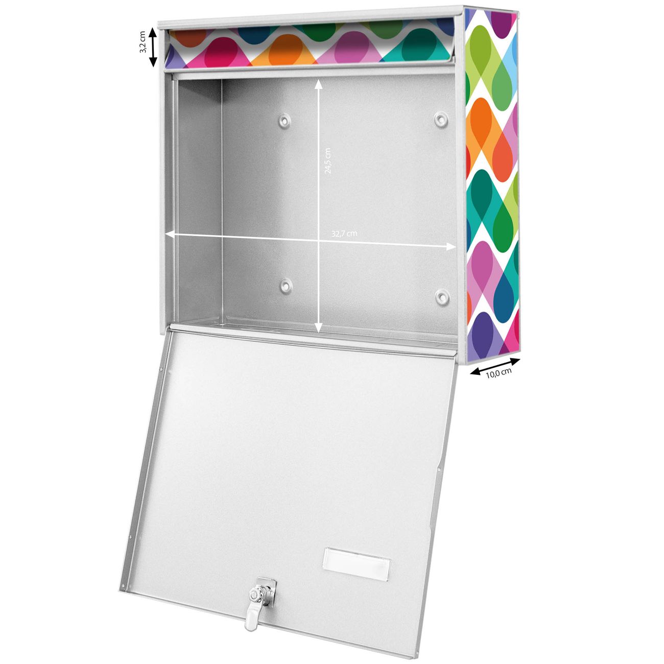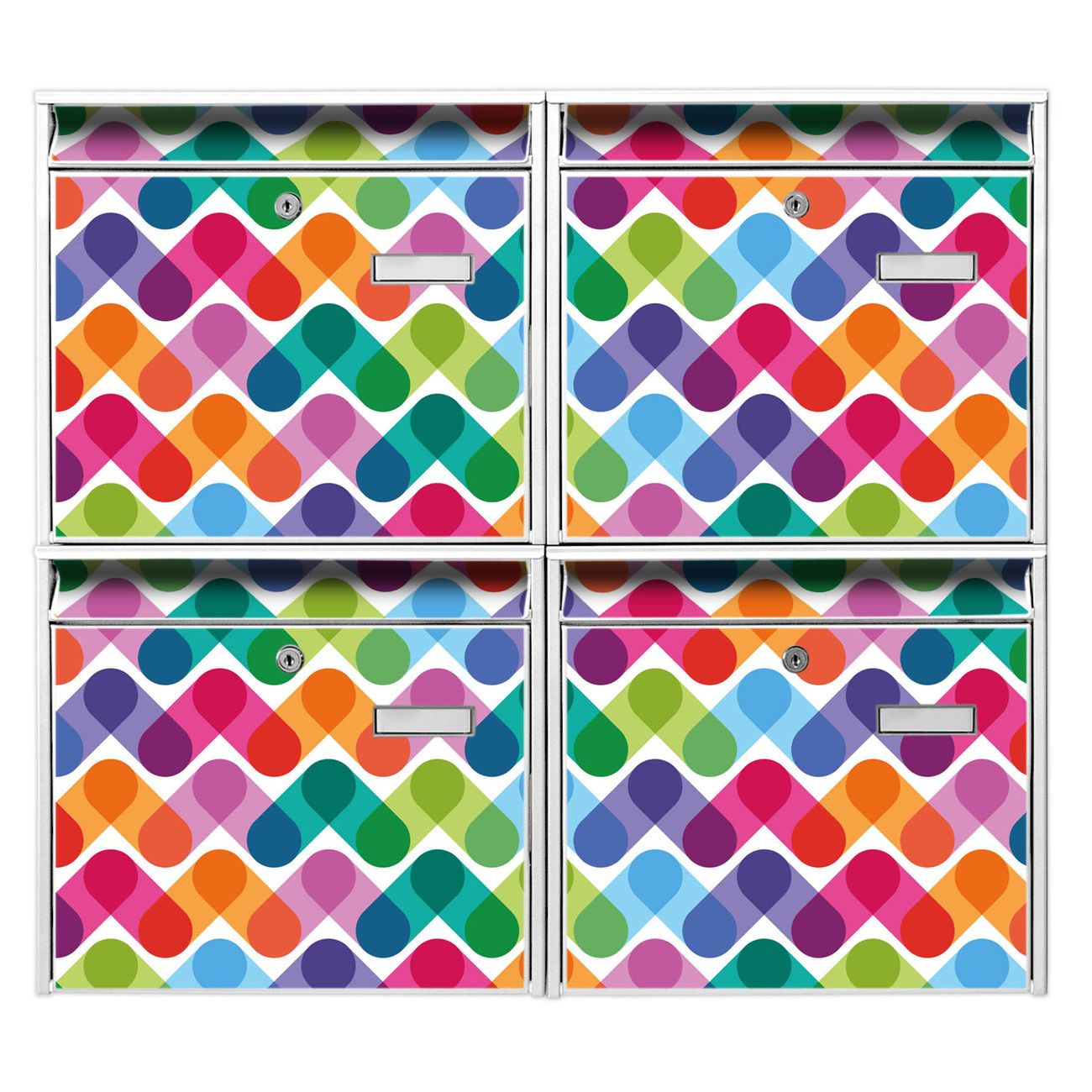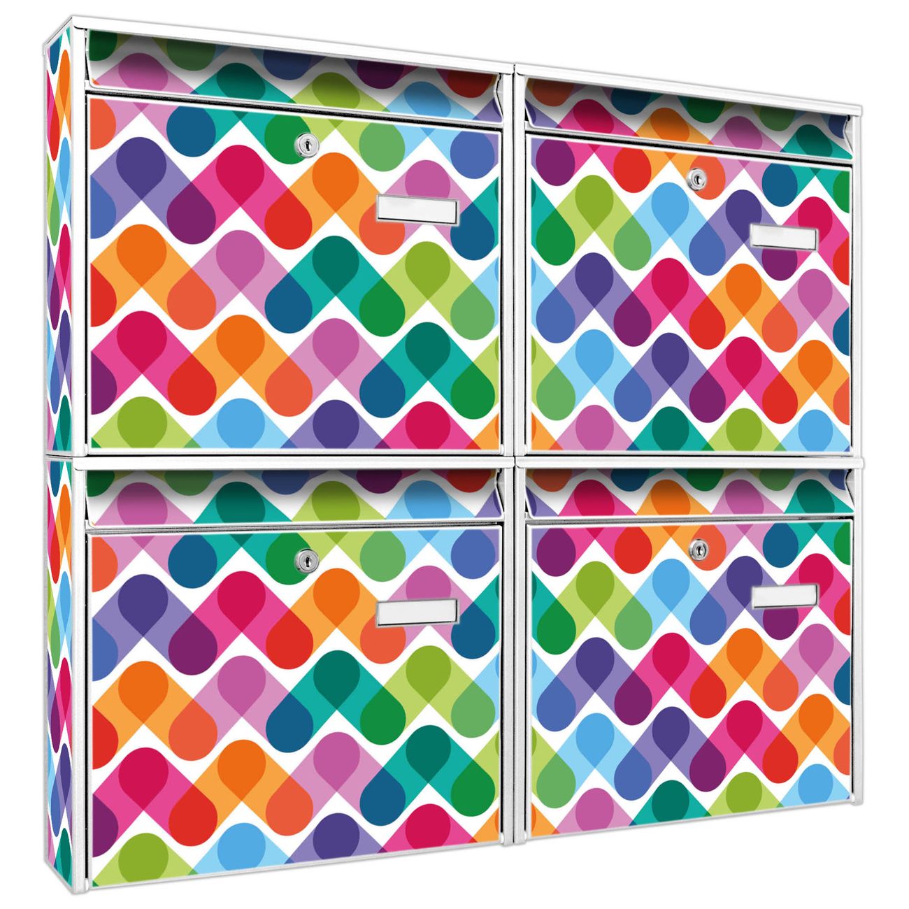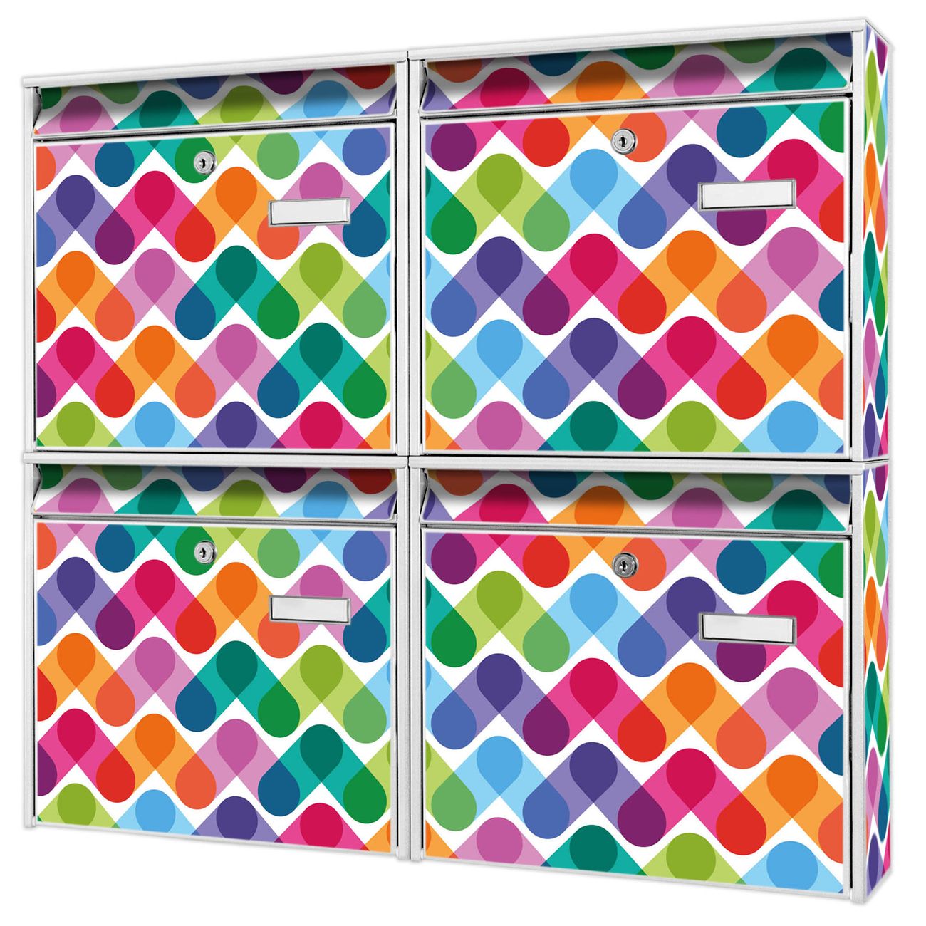 FUNKTION: Die Burg-Wächter Briefkastenanlage mit Motiv Bunte Ketten bietet Ihnen ausreichend Fassungsvermögen um auch A4 und C4 Sendungen zu empfangen. Das integrierte Namensschild lässt sich individuell beschriften. Wählen Sie aus den Grundfarben weiß, silber und schwarz. DESIGN: Die 4 Briefkästen haben ein ansprechendes und zeitloses Design, ohne dabei auf Funktionalität zu verzichten. Das Material ist sehr stabil, wetterfest und rostfrei. Durch das Motiv Bunte Ketten werden die Postkästen zu einem Blickfang. DETAILS: Die Postkästen bestehen aus verzinktem Stahl der zusätzlich mit Klarlack versiegelt wurde. Die Kästen sind gesamt 64,5cm hoch, 72,5cm breit und 10cm tief. Das Motiv besteht aus einer wetter- und UV-festen Folie, die Ihren Briefkasten zusätzlich vor Kratzern schützt. Die Postkästen werden mit Montagematerial, je einem Namensschild und je zwei Schlüsseln geliefert. NUTZEN: Das Briefkastenset eignet sich für die Wandmontage, die Größe bietet genügend Platz für Sendungen aller Art. Das zeitlose Design sowie die stabile Bauart bieten Ihnen einen treuen Begleiter für Ihre Post. BANJADO: