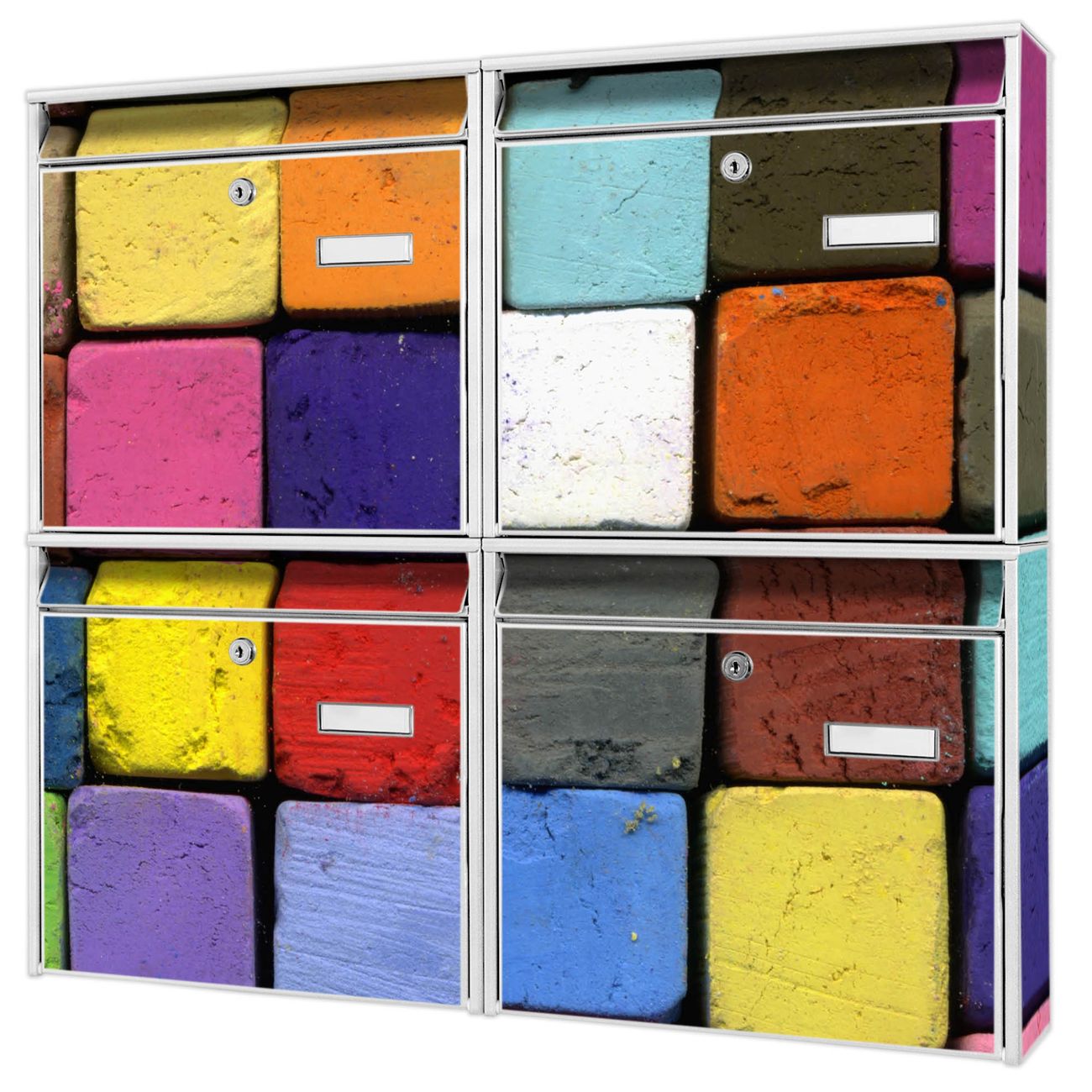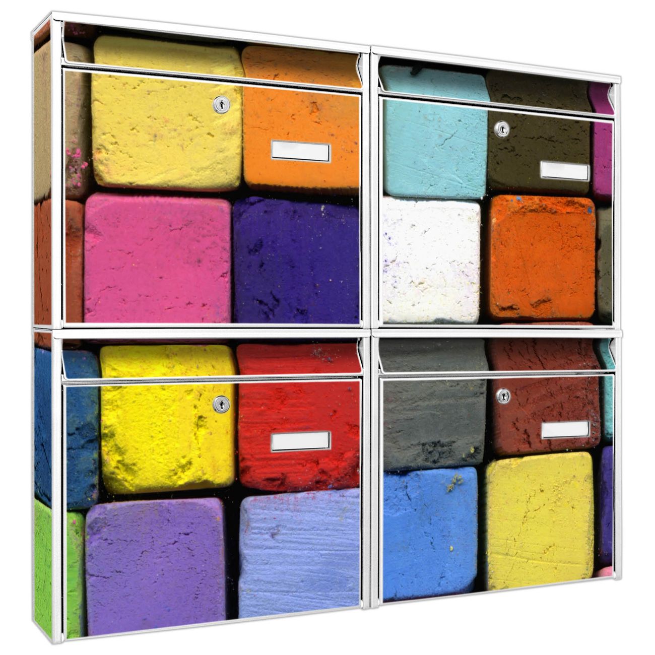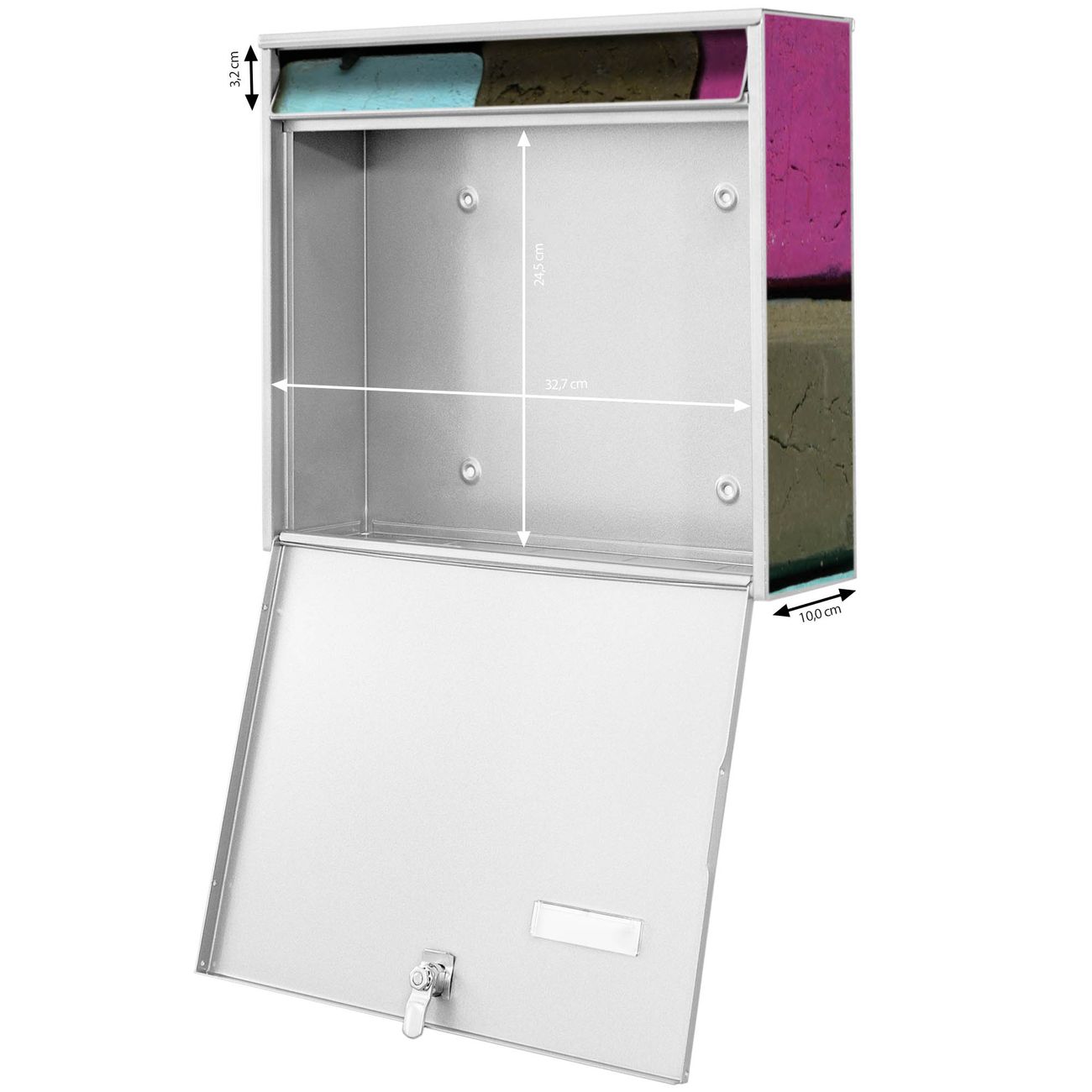 FUNKTION: Die Burg-Wächter Briefkastenanlage mit Motiv Bunte Kreide bietet Ihnen ausreichend Fassungsvermögen um auch A4 und C4 Sendungen zu empfangen. Das integrierte Namensschild lässt sich individuell beschriften. Wählen Sie aus den Grundfarben weiß, silber und schwarz. DESIGN: Die 4 Briefkästen haben ein ansprechendes und zeitloses Design, ohne dabei auf Funktionalität zu verzichten. Das Material ist sehr stabil, wetterfest und rostfrei. Durch das Motiv Bunte Kreide werden die Postkästen zu einem Blickfang. DETAILS: Die Postkästen bestehen aus verzinktem Stahl der zusätzlich mit Klarlack versiegelt wurde. Die Kästen sind gesamt 64,5cm hoch, 72,5cm breit und 10cm tief. Das Motiv besteht aus einer wetter- und UV-festen Folie, die Ihren Briefkasten zusätzlich vor Kratzern schützt. Die Postkästen werden mit Montagematerial, je einem Namensschild und je zwei Schlüsseln geliefert. NUTZEN: Das Briefkastenset eignet sich für die Wandmontage, die Größe bietet genügend Platz für Sendungen aller Art. Das zeitlose Design sowie die stabile Bauart bieten Ihnen einen treuen Begleiter für Ihre Post. BANJADO: