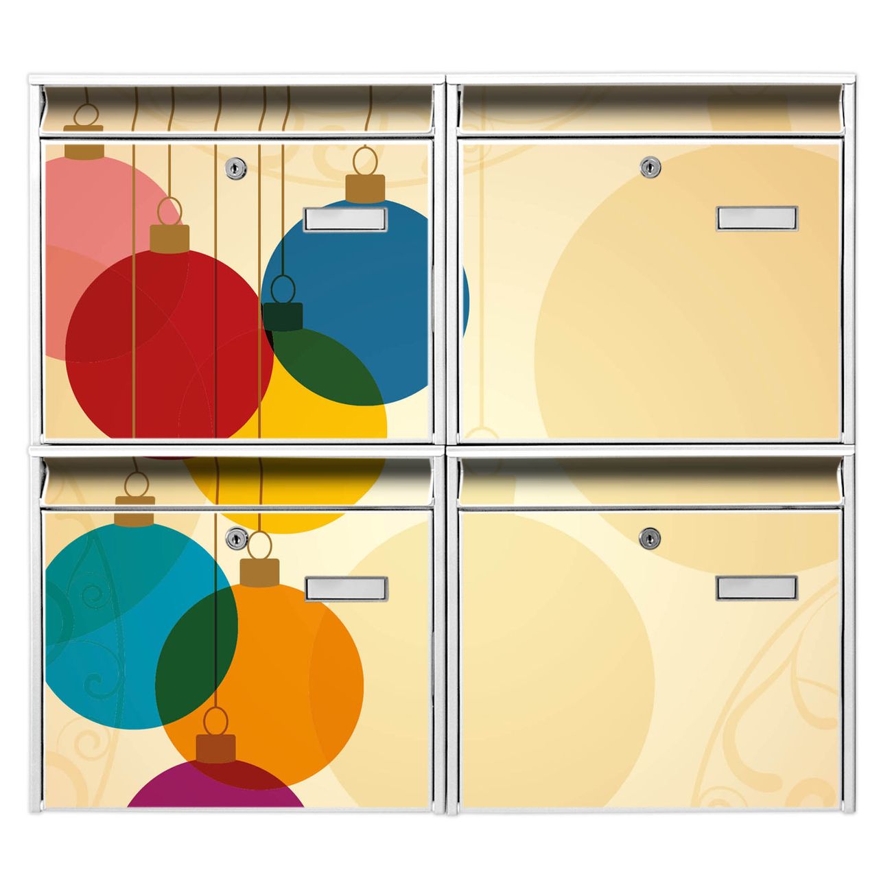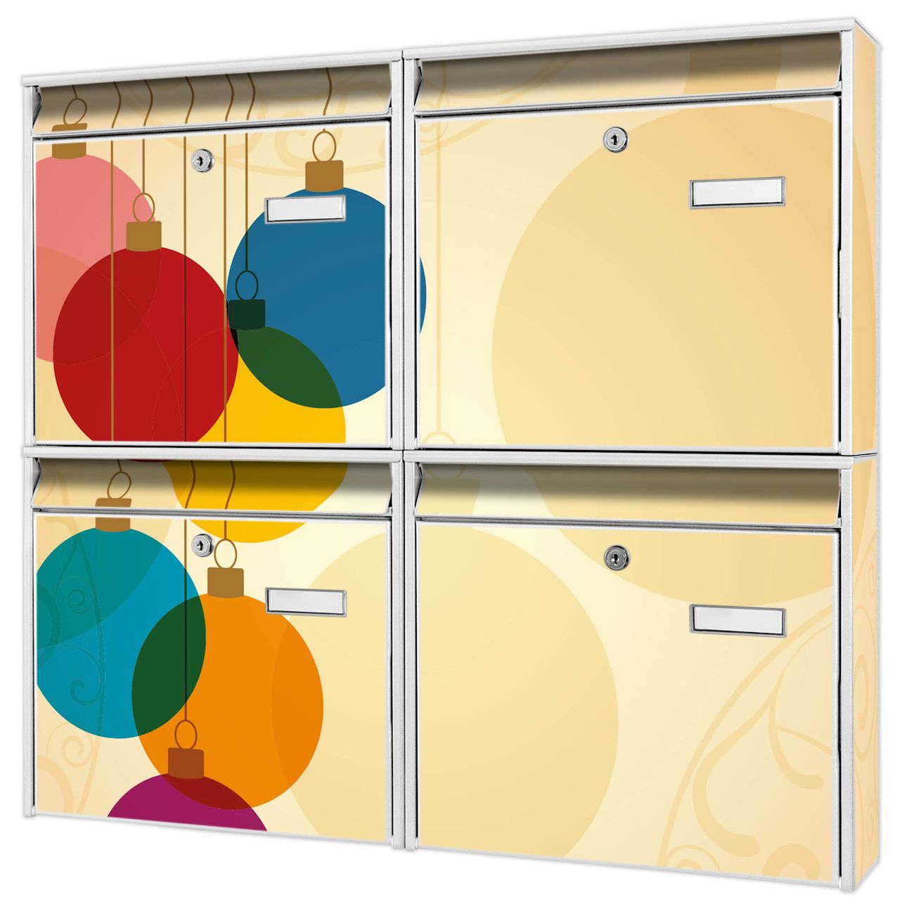 FUNKTION: Die Burg-Wächter Briefkastenanlage mit Motiv Bunte Kugeln bietet Ihnen ausreichend Fassungsvermögen um auch A4 und C4 Sendungen zu empfangen. Das integrierte Namensschild lässt sich individuell beschriften. Wählen Sie aus den Grundfarben weiß, silber und schwarz. DESIGN: Die 4 Briefkästen haben ein ansprechendes und zeitloses Design, ohne dabei auf Funktionalität zu verzichten. Das Material ist sehr stabil, wetterfest und rostfrei. Durch das Motiv Bunte Kugeln werden die Postkästen zu einem Blickfang. DETAILS: Die Postkästen bestehen aus verzinktem Stahl der zusätzlich mit Klarlack versiegelt wurde. Die Kästen sind gesamt 64,5cm hoch, 72,5cm breit und 10cm tief. Das Motiv besteht aus einer wetter- und UV-festen Folie, die Ihren Briefkasten zusätzlich vor Kratzern schützt. Die Postkästen werden mit Montagematerial, je einem Namensschild und je zwei Schlüsseln geliefert. NUTZEN: Das Briefkastenset eignet sich für die Wandmontage, die Größe bietet genügend Platz für Sendungen aller Art. Das zeitlose Design sowie die stabile Bauart bieten Ihnen einen treuen Begleiter für Ihre Post. BANJADO: