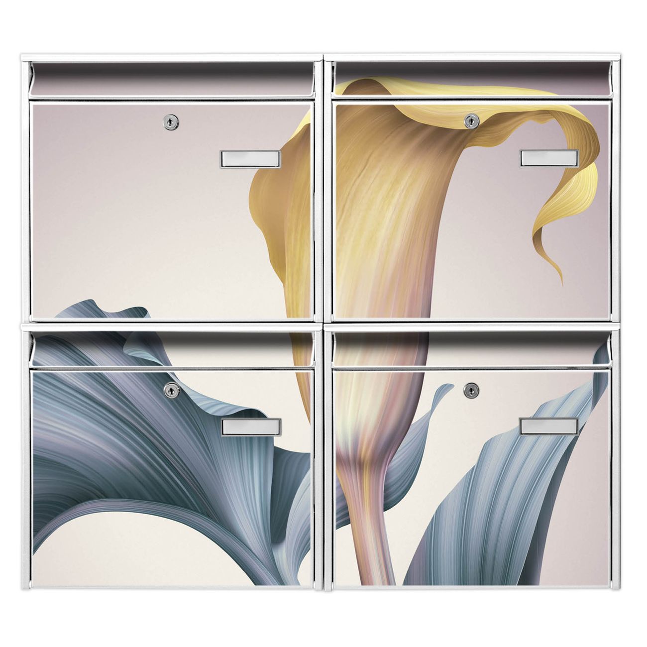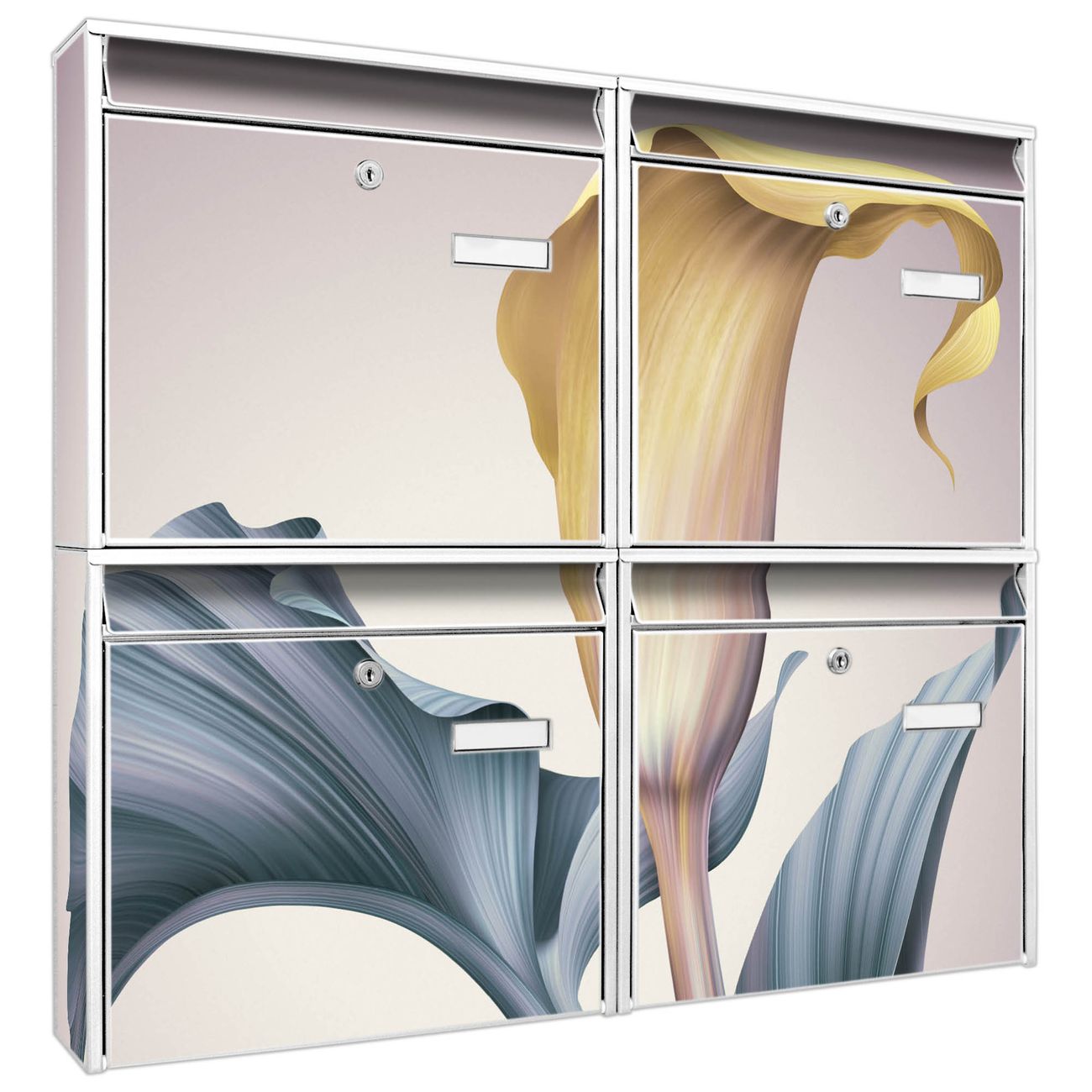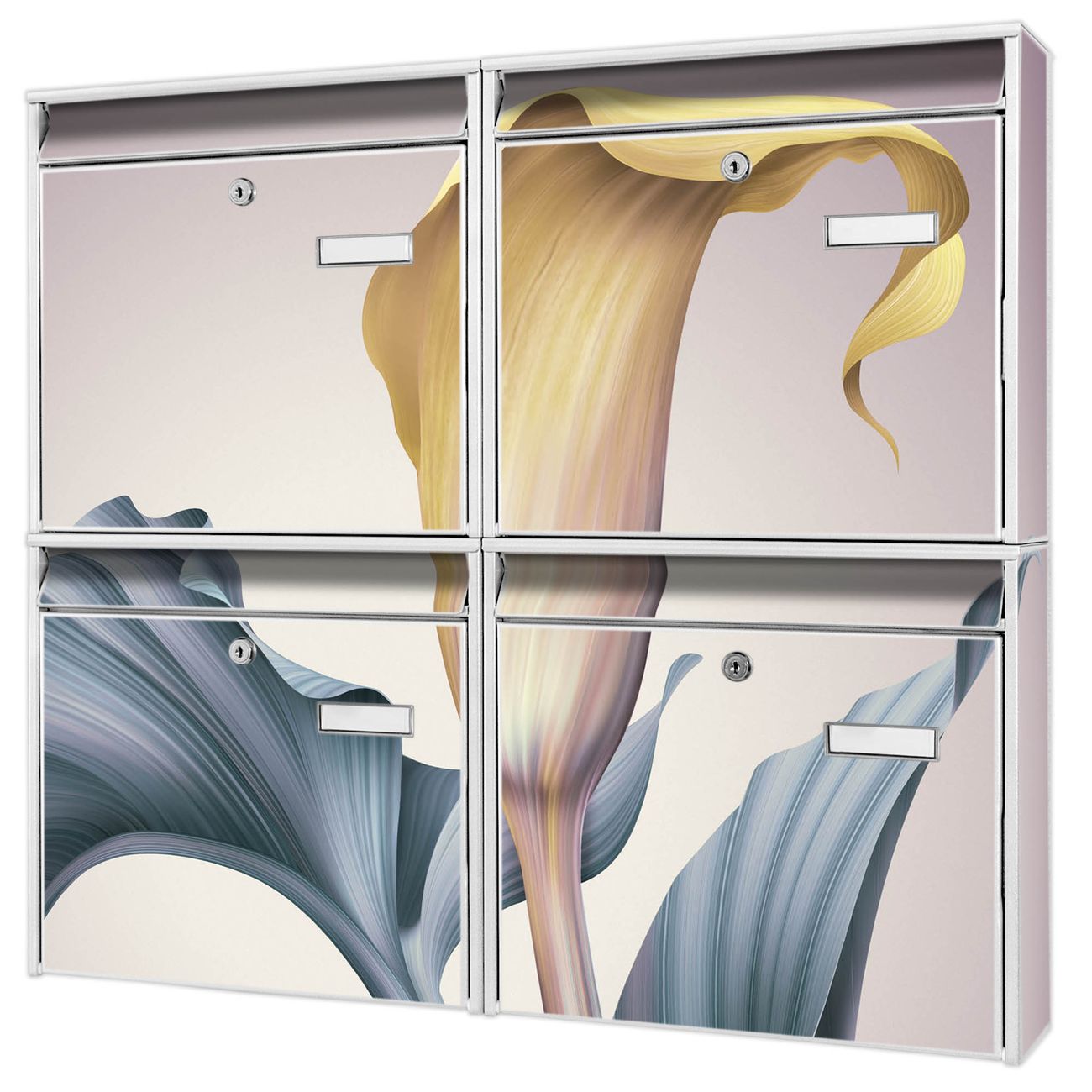 FUNKTION: Die Burg-Wächter Briefkastenanlage mit Motiv Calla bietet Ihnen ausreichend Fassungsvermögen um auch A4 und C4 Sendungen zu empfangen. Das integrierte Namensschild lässt sich individuell beschriften. Wählen Sie aus den Grundfarben weiß, silber und schwarz. DESIGN: Die 4 Briefkästen haben ein ansprechendes und zeitloses Design, ohne dabei auf Funktionalität zu verzichten. Das Material ist sehr stabil, wetterfest und rostfrei. Durch das Motiv Calla werden die Postkästen zu einem Blickfang. DETAILS: Die Postkästen bestehen aus verzinktem Stahl der zusätzlich mit Klarlack versiegelt wurde. Die Kästen sind gesamt 64,5cm hoch, 72,5cm breit und 10cm tief. Das Motiv besteht aus einer wetter- und UV-festen Folie, die Ihren Briefkasten zusätzlich vor Kratzern schützt. Die Postkästen werden mit Montagematerial, je einem Namensschild und je zwei Schlüsseln geliefert. NUTZEN: Das Briefkastenset eignet sich für die Wandmontage, die Größe bietet genügend Platz für Sendungen aller Art. Das zeitlose Design sowie die stabile Bauart bieten Ihnen einen treuen Begleiter für Ihre Post. BANJADO: