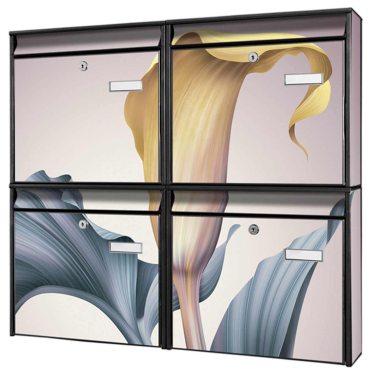 FUNKTION: Die Burg-Wächter Briefkastenanlage mit Motiv Calla bietet Ihnen ausreichend Fassungsvermögen um auch A4 und C4 Sendungen zu empfangen. Das integrierte Namensschild lässt sich individuell beschriften. Wählen Sie aus den Grundfarben weiß, silber und schwarz. DESIGN: Die 4 Briefkästen haben ein ansprechendes und zeitloses Design, ohne dabei auf Funktionalität zu verzichten. Das Material ist sehr stabil, wetterfest und rostfrei. Durch das Motiv Calla werden die Postkästen zu einem Blickfang. DETAILS: Die Postkästen bestehen aus verzinktem Stahl der zusätzlich mit Klarlack versiegelt wurde. Die Kästen sind gesamt 64,5cm hoch, 72,5cm breit und 10cm tief. Das Motiv besteht aus einer wetter- und UV-festen Folie, die Ihren Briefkasten zusätzlich vor Kratzern schützt. Die Postkästen werden mit Montagematerial, je einem Namensschild und je zwei Schlüsseln geliefert. NUTZEN: Das Briefkastenset eignet sich für die Wandmontage, die Größe bietet genügend Platz für Sendungen aller Art. Das zeitlose Design sowie die stabile Bauart bieten Ihnen einen treuen Begleiter für Ihre Post. BANJADO: