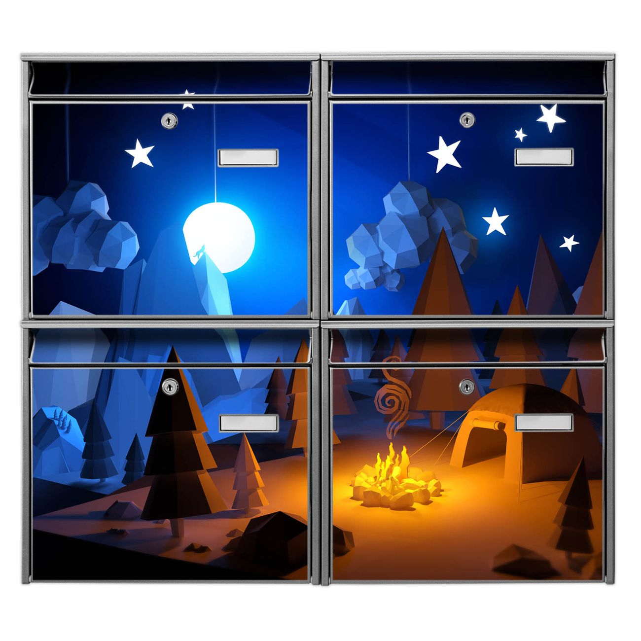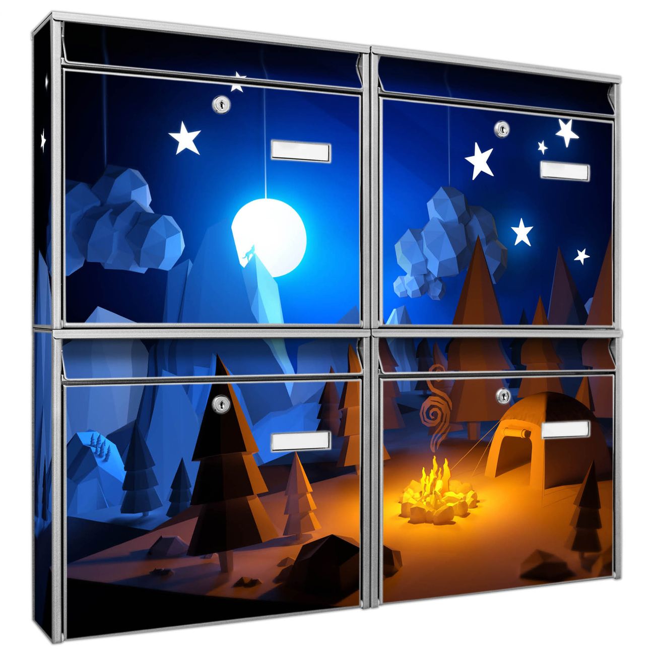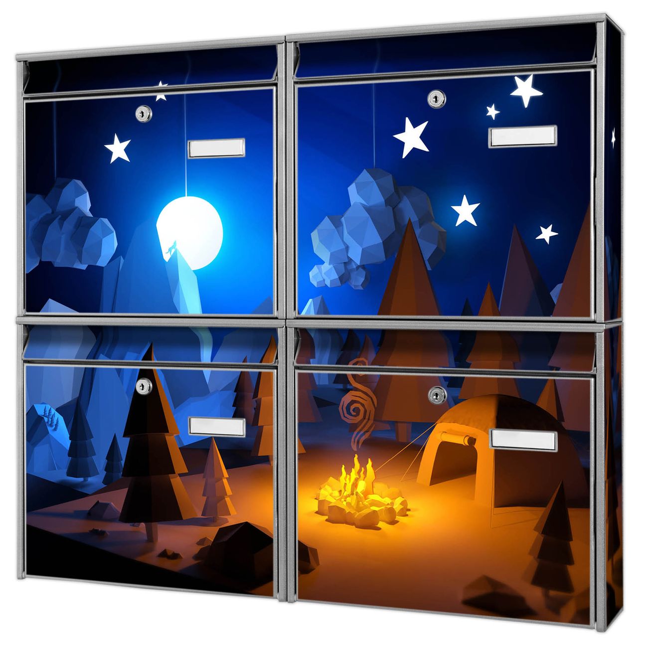 FUNKTION: Die Burg-Wächter Briefkastenanlage mit Motiv Camping 2 bietet Ihnen ausreichend Fassungsvermögen um auch A4 und C4 Sendungen zu empfangen. Das integrierte Namensschild lässt sich individuell beschriften. Wählen Sie aus den Grundfarben weiß, silber und schwarz. DESIGN: Die 4 Briefkästen haben ein ansprechendes und zeitloses Design, ohne dabei auf Funktionalität zu verzichten. Das Material ist sehr stabil, wetterfest und rostfrei. Durch das Motiv Camping 2 werden die Postkästen zu einem Blickfang. DETAILS: Die Postkästen bestehen aus verzinktem Stahl der zusätzlich mit Klarlack versiegelt wurde. Die Kästen sind gesamt 64,5cm hoch, 72,5cm breit und 10cm tief. Das Motiv besteht aus einer wetter- und UV-festen Folie, die Ihren Briefkasten zusätzlich vor Kratzern schützt. Die Postkästen werden mit Montagematerial, je einem Namensschild und je zwei Schlüsseln geliefert. NUTZEN: Das Briefkastenset eignet sich für die Wandmontage, die Größe bietet genügend Platz für Sendungen aller Art. Das zeitlose Design sowie die stabile Bauart bieten Ihnen einen treuen Begleiter für Ihre Post. BANJADO:
