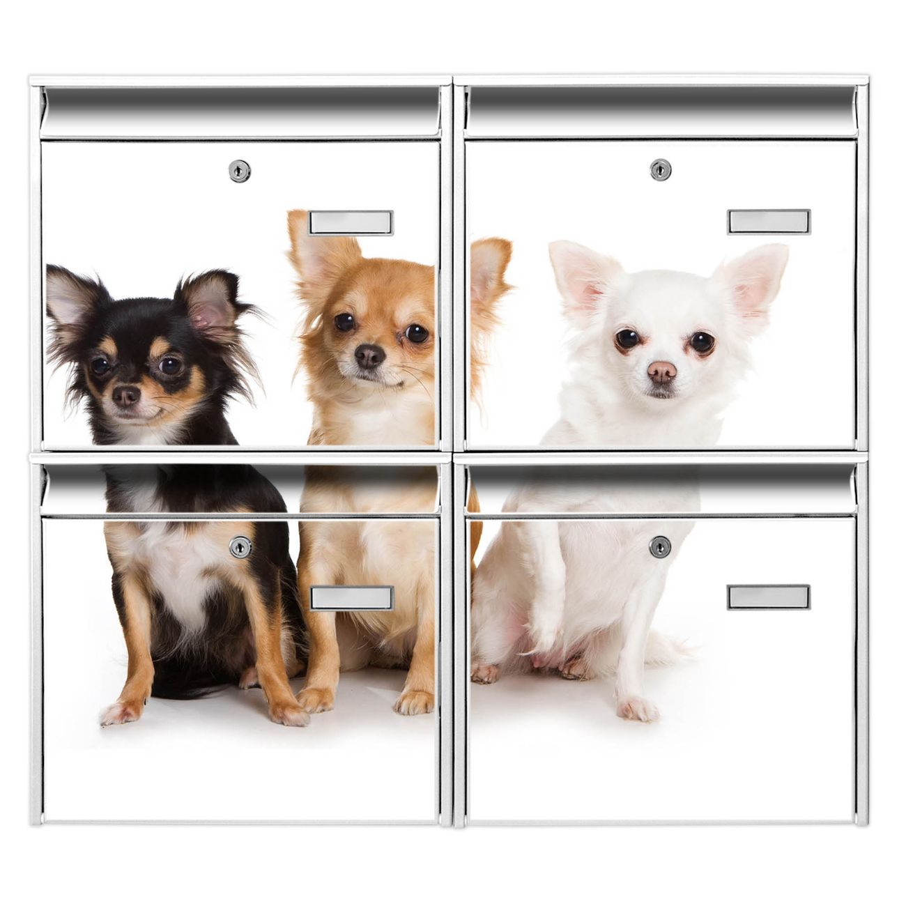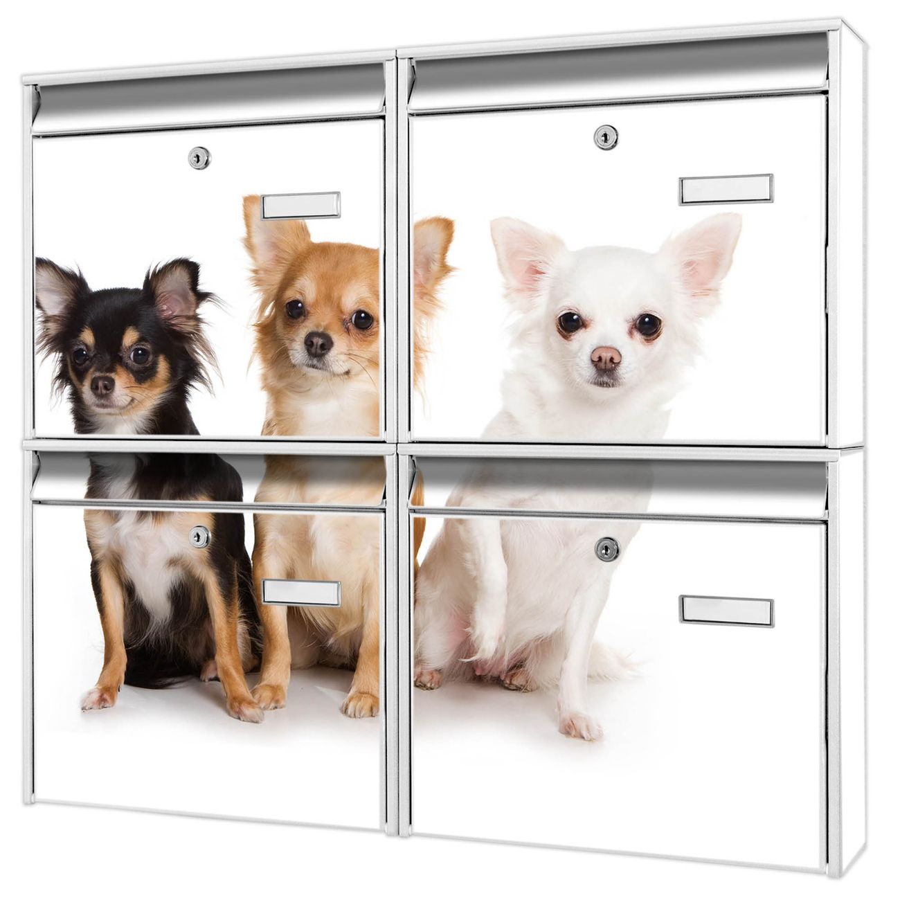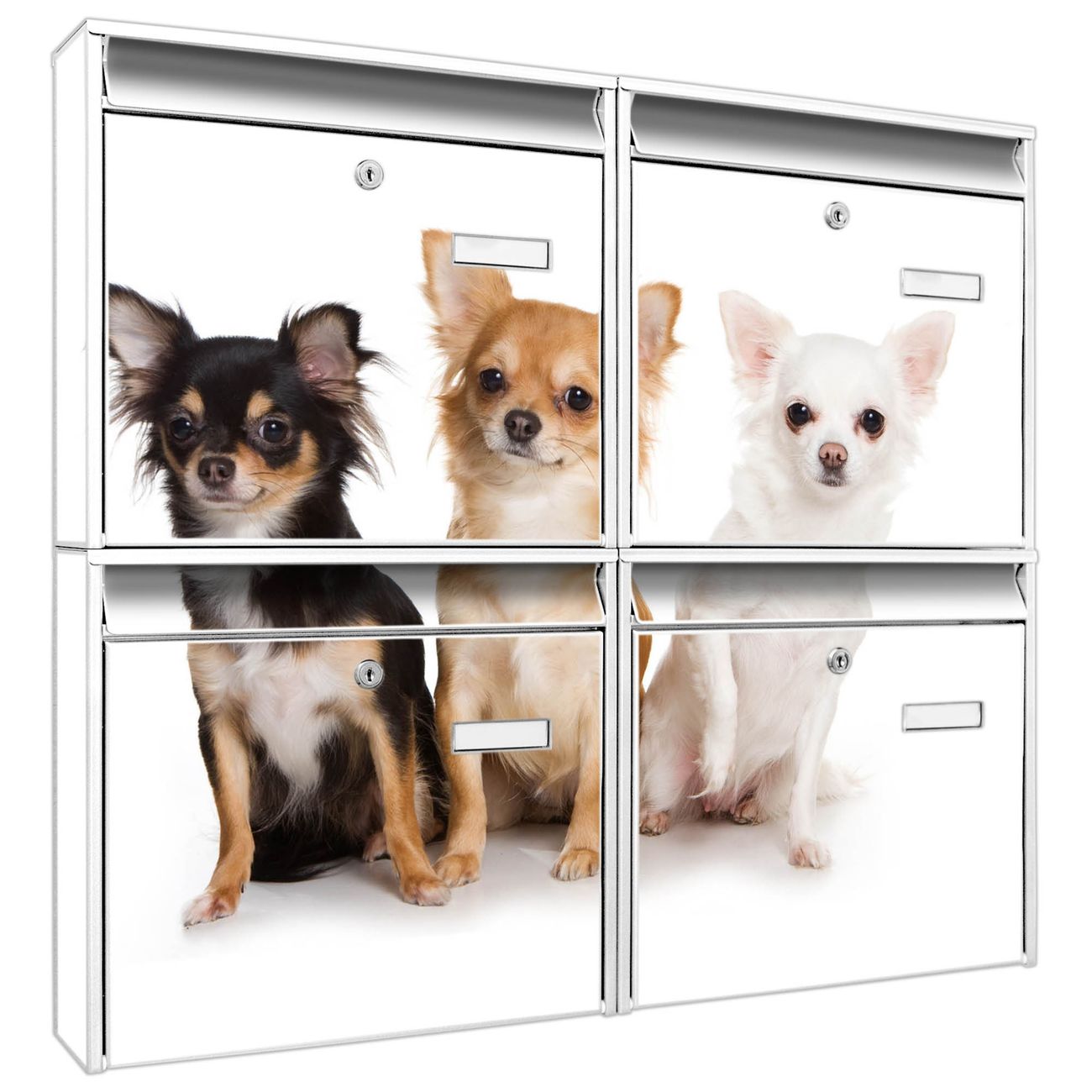 FUNKTION: Die Burg-Wächter Briefkastenanlage mit Motiv Chihuahua bietet Ihnen ausreichend Fassungsvermögen um auch A4 und C4 Sendungen zu empfangen. Das integrierte Namensschild lässt sich individuell beschriften. Wählen Sie aus den Grundfarben weiß, silber und schwarz. DESIGN: Die 4 Briefkästen haben ein ansprechendes und zeitloses Design, ohne dabei auf Funktionalität zu verzichten. Das Material ist sehr stabil, wetterfest und rostfrei. Durch das Motiv Chihuahua werden die Postkästen zu einem Blickfang. DETAILS: Die Postkästen bestehen aus verzinktem Stahl der zusätzlich mit Klarlack versiegelt wurde. Die Kästen sind gesamt 64,5cm hoch, 72,5cm breit und 10cm tief. Das Motiv besteht aus einer wetter- und UV-festen Folie, die Ihren Briefkasten zusätzlich vor Kratzern schützt. Die Postkästen werden mit Montagematerial, je einem Namensschild und je zwei Schlüsseln geliefert. NUTZEN: Das Briefkastenset eignet sich für die Wandmontage, die Größe bietet genügend Platz für Sendungen aller Art. Das zeitlose Design sowie die stabile Bauart bieten Ihnen einen treuen Begleiter für Ihre Post. BANJADO: