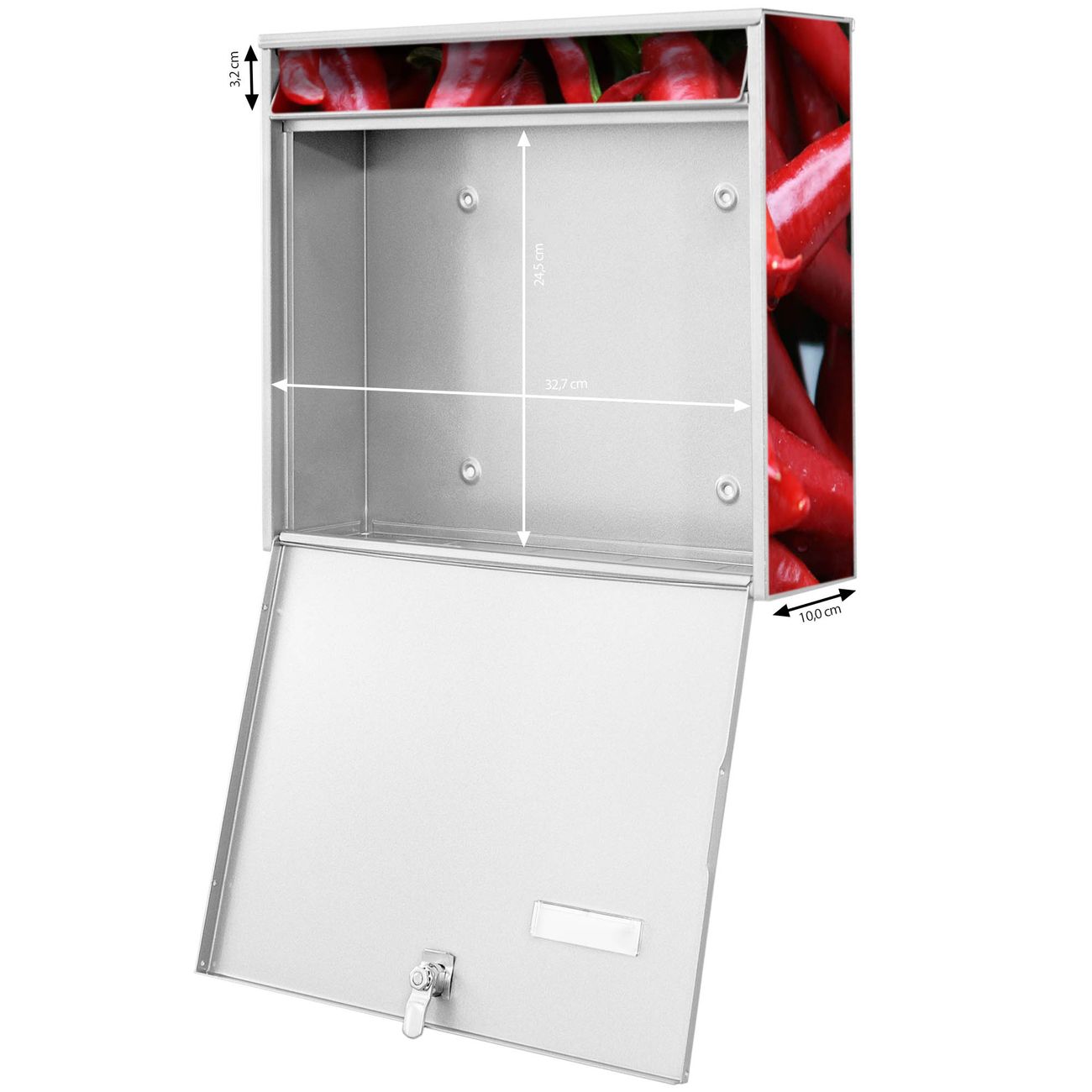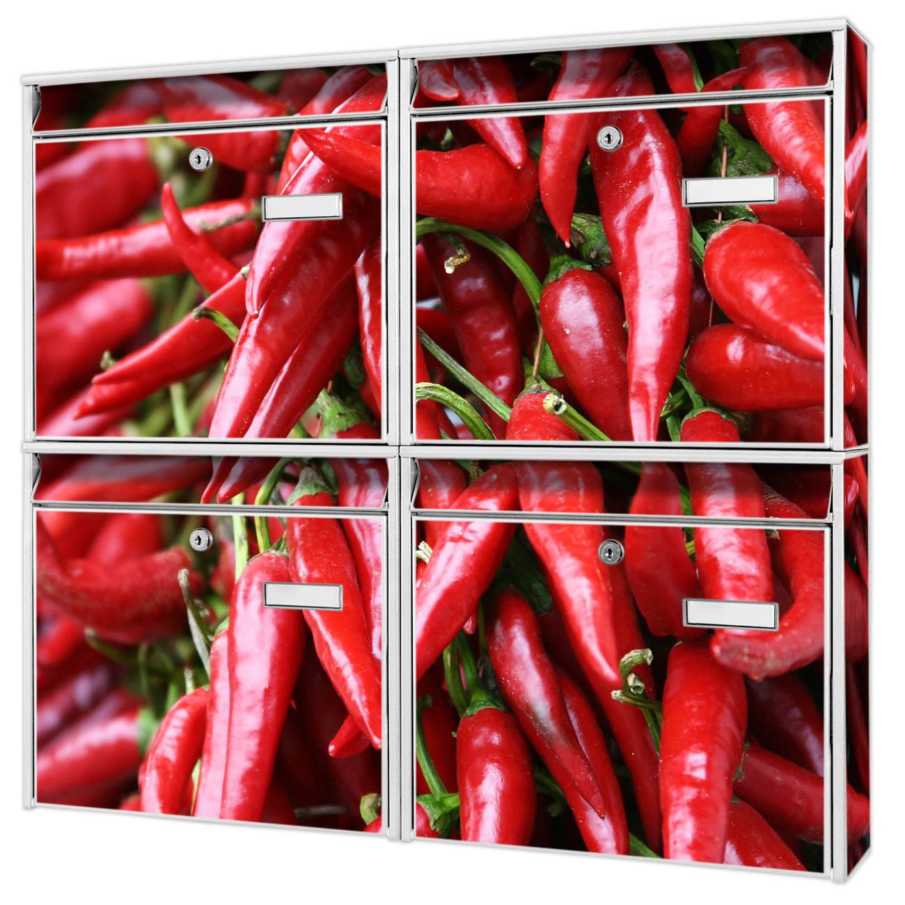 FUNKTION: Die Burg-Wächter Briefkastenanlage mit Motiv Chilli bietet Ihnen ausreichend Fassungsvermögen um auch A4 und C4 Sendungen zu empfangen. Das integrierte Namensschild lässt sich individuell beschriften. Wählen Sie aus den Grundfarben weiß, silber und schwarz. DESIGN: Die 4 Briefkästen haben ein ansprechendes und zeitloses Design, ohne dabei auf Funktionalität zu verzichten. Das Material ist sehr stabil, wetterfest und rostfrei. Durch das Motiv Chilli werden die Postkästen zu einem Blickfang. DETAILS: Die Postkästen bestehen aus verzinktem Stahl der zusätzlich mit Klarlack versiegelt wurde. Die Kästen sind gesamt 64,5cm hoch, 72,5cm breit und 10cm tief. Das Motiv besteht aus einer wetter- und UV-festen Folie, die Ihren Briefkasten zusätzlich vor Kratzern schützt. Die Postkästen werden mit Montagematerial, je einem Namensschild und je zwei Schlüsseln geliefert. NUTZEN: Das Briefkastenset eignet sich für die Wandmontage, die Größe bietet genügend Platz für Sendungen aller Art. Das zeitlose Design sowie die stabile Bauart bieten Ihnen einen treuen Begleiter für Ihre Post. BANJADO: