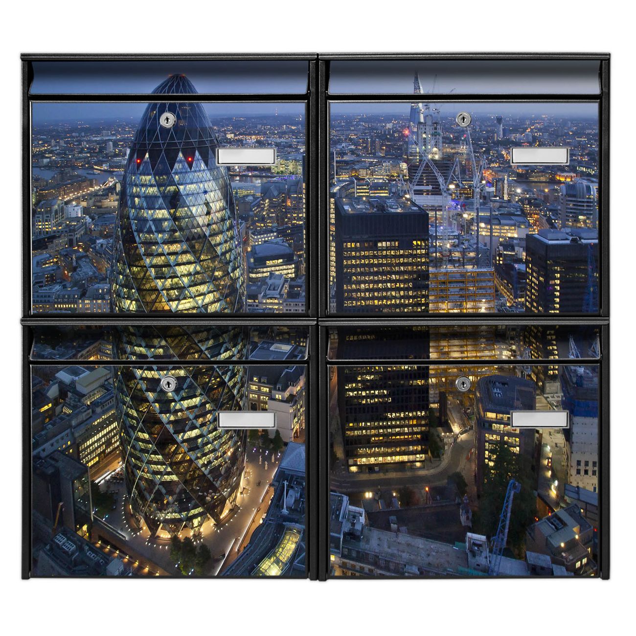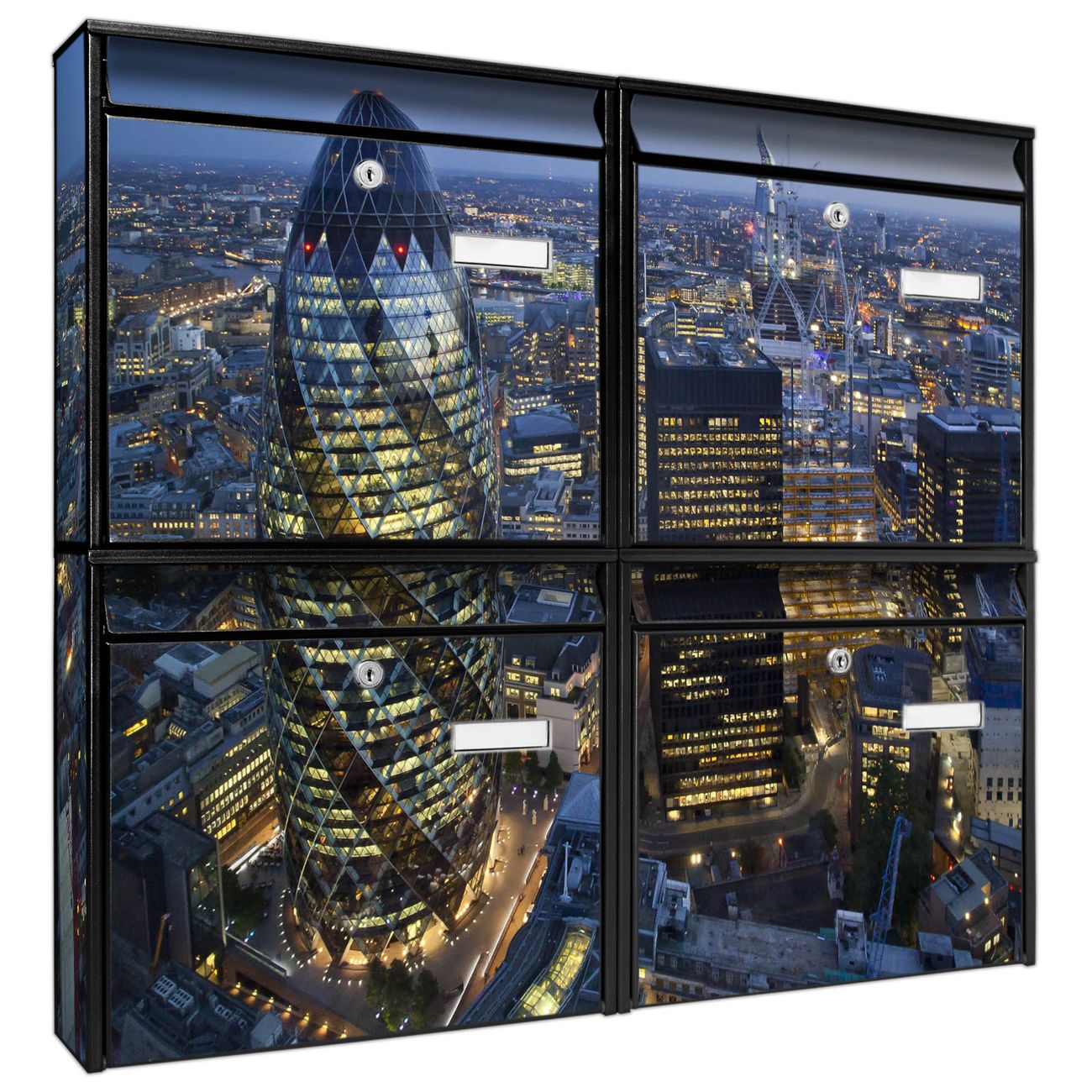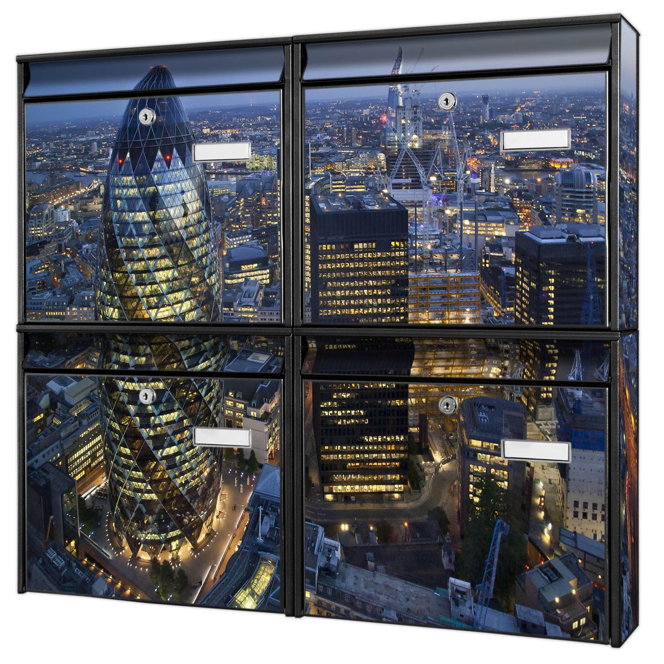 FUNKTION: Die Burg-Wächter Briefkastenanlage mit Motiv City Of London bietet Ihnen ausreichend Fassungsvermögen um auch A4 und C4 Sendungen zu empfangen. Das integrierte Namensschild lässt sich individuell beschriften. Wählen Sie aus den Grundfarben weiß, silber und schwarz. DESIGN: Die 4 Briefkästen haben ein ansprechendes und zeitloses Design, ohne dabei auf Funktionalität zu verzichten. Das Material ist sehr stabil, wetterfest und rostfrei. Durch das Motiv City Of London werden die Postkästen zu einem Blickfang. DETAILS: Die Postkästen bestehen aus verzinktem Stahl der zusätzlich mit Klarlack versiegelt wurde. Die Kästen sind gesamt 64,5cm hoch, 72,5cm breit und 10cm tief. Das Motiv besteht aus einer wetter- und UV-festen Folie, die Ihren Briefkasten zusätzlich vor Kratzern schützt. Die Postkästen werden mit Montagematerial, je einem Namensschild und je zwei Schlüsseln geliefert. NUTZEN: Das Briefkastenset eignet sich für die Wandmontage, die Größe bietet genügend Platz für Sendungen aller Art. Das zeitlose Design sowie die stabile Bauart bieten Ihnen einen treuen Begleiter für Ihre Post. BANJADO:
