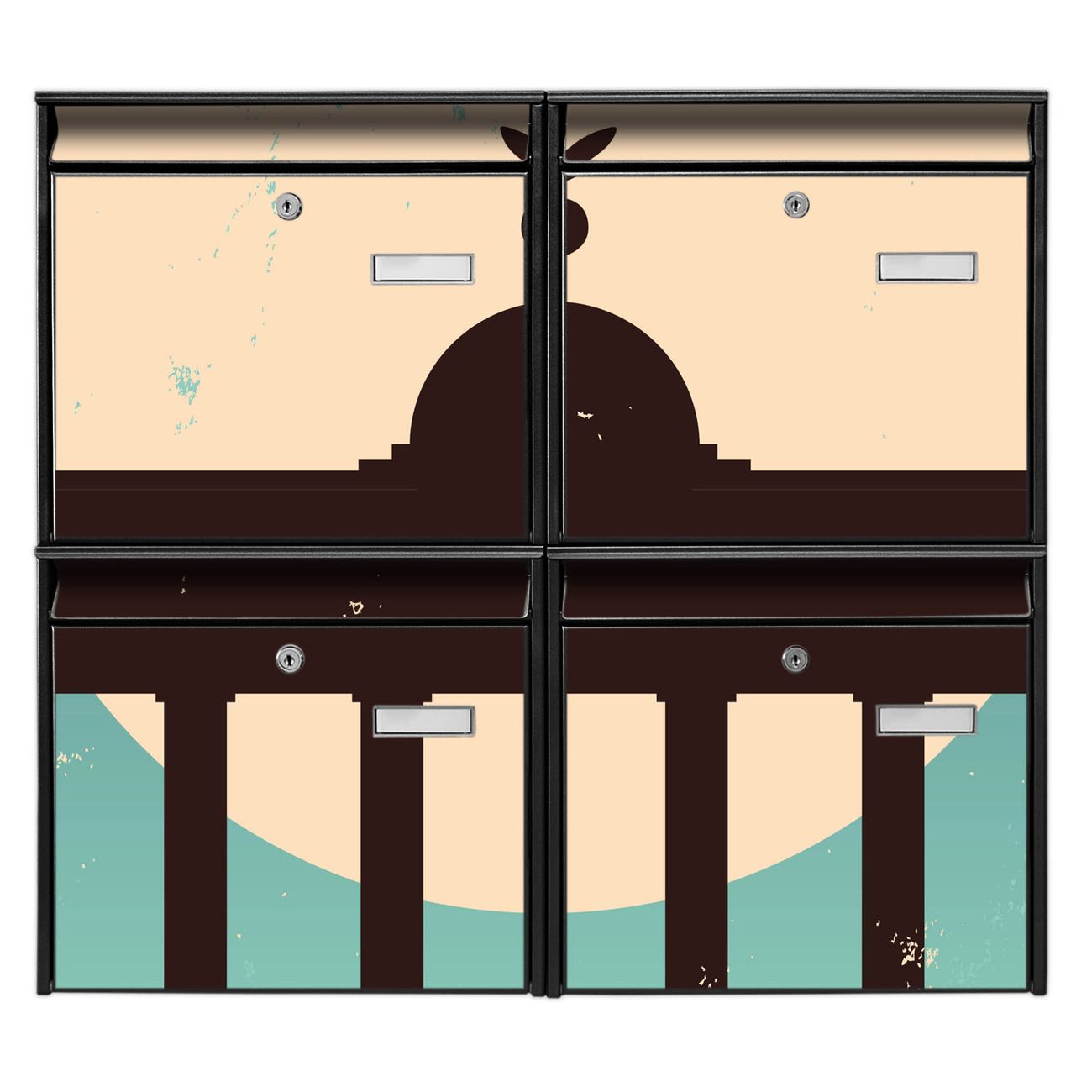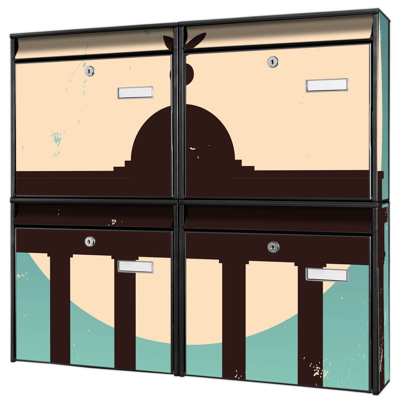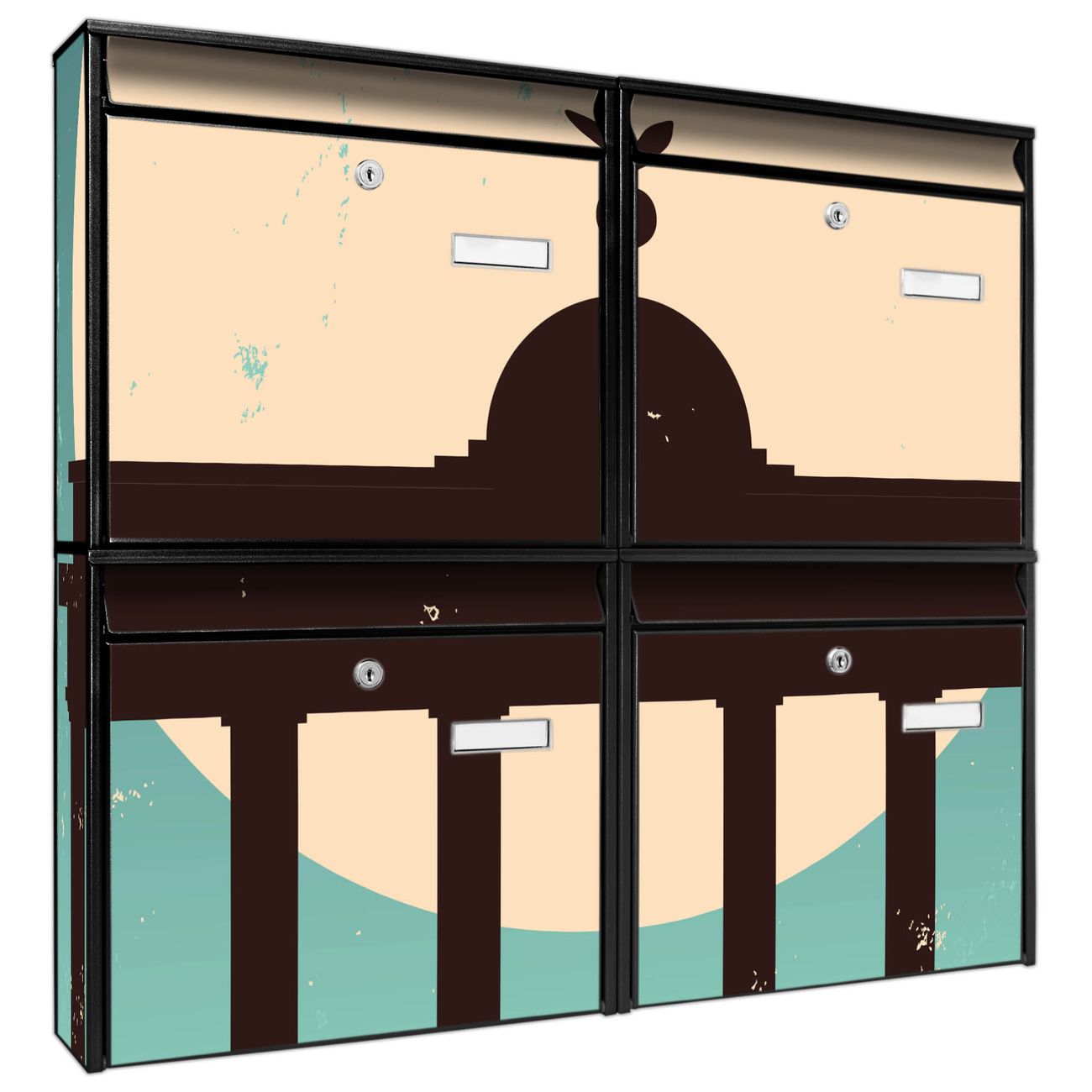 FUNKTION: Die Burg-Wächter Briefkastenanlage mit Motiv City Poster Berlin bietet Ihnen ausreichend Fassungsvermögen um auch A4 und C4 Sendungen zu empfangen. Das integrierte Namensschild lässt sich individuell beschriften. Wählen Sie aus den Grundfarben weiß, silber und schwarz. DESIGN: Die 4 Briefkästen haben ein ansprechendes und zeitloses Design, ohne dabei auf Funktionalität zu verzichten. Das Material ist sehr stabil, wetterfest und rostfrei. Durch das Motiv City Poster Berlin werden die Postkästen zu einem Blickfang. DETAILS: Die Postkästen bestehen aus verzinktem Stahl der zusätzlich mit Klarlack versiegelt wurde. Die Kästen sind gesamt 64,5cm hoch, 72,5cm breit und 10cm tief. Das Motiv besteht aus einer wetter- und UV-festen Folie, die Ihren Briefkasten zusätzlich vor Kratzern schützt. Die Postkästen werden mit Montagematerial, je einem Namensschild und je zwei Schlüsseln geliefert. NUTZEN: Das Briefkastenset eignet sich für die Wandmontage, die Größe bietet genügend Platz für Sendungen aller Art. Das zeitlose Design sowie die stabile Bauart bieten Ihnen einen treuen Begleiter für Ihre Post. BANJADO: