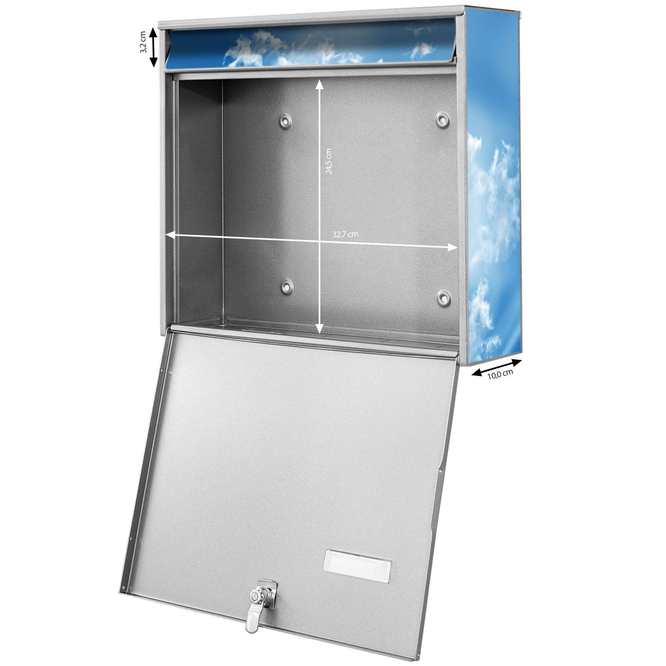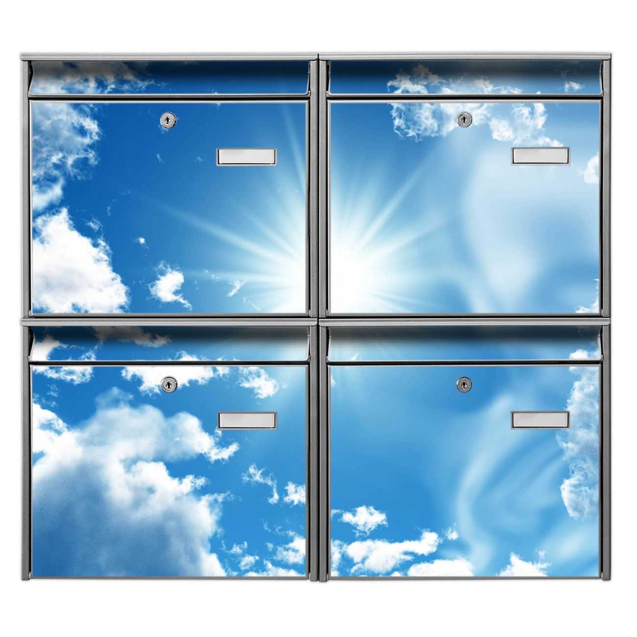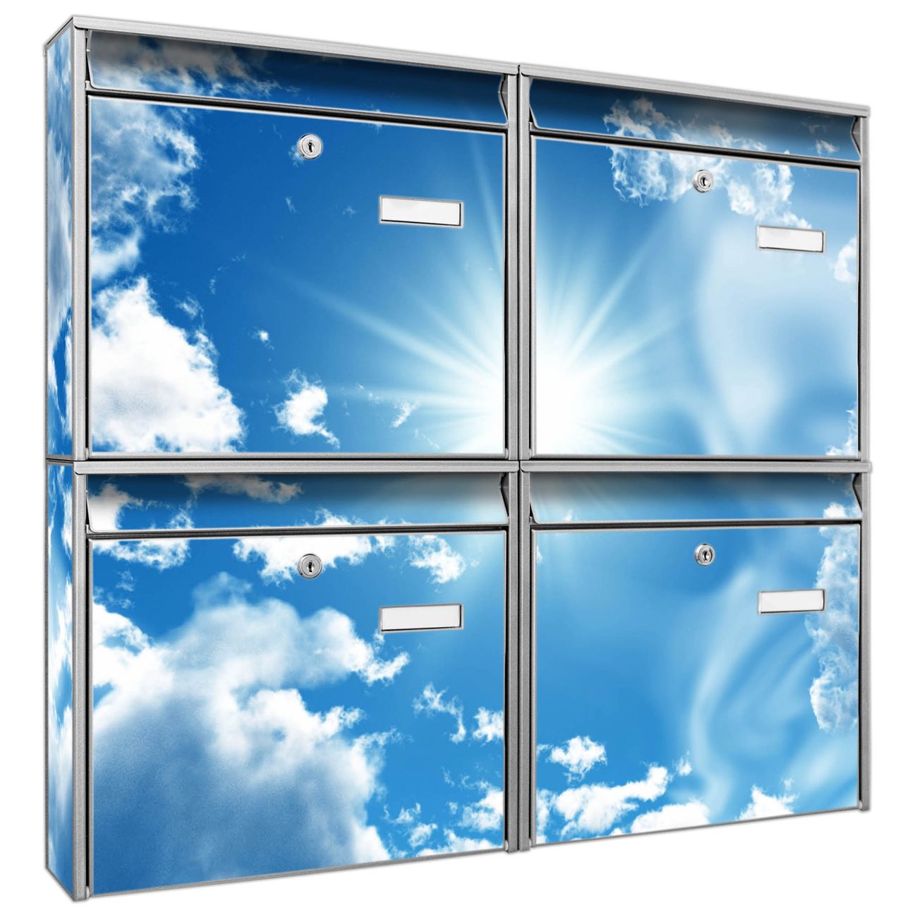 FUNKTION: Die Burg-Wächter Briefkastenanlage mit Motiv Clouds bietet Ihnen ausreichend Fassungsvermögen um auch A4 und C4 Sendungen zu empfangen. Das integrierte Namensschild lässt sich individuell beschriften. Wählen Sie aus den Grundfarben weiß, silber und schwarz. DESIGN: Die 4 Briefkästen haben ein ansprechendes und zeitloses Design, ohne dabei auf Funktionalität zu verzichten. Das Material ist sehr stabil, wetterfest und rostfrei. Durch das Motiv Clouds werden die Postkästen zu einem Blickfang. DETAILS: Die Postkästen bestehen aus verzinktem Stahl der zusätzlich mit Klarlack versiegelt wurde. Die Kästen sind gesamt 64,5cm hoch, 72,5cm breit und 10cm tief. Das Motiv besteht aus einer wetter- und UV-festen Folie, die Ihren Briefkasten zusätzlich vor Kratzern schützt. Die Postkästen werden mit Montagematerial, je einem Namensschild und je zwei Schlüsseln geliefert. NUTZEN: Das Briefkastenset eignet sich für die Wandmontage, die Größe bietet genügend Platz für Sendungen aller Art. Das zeitlose Design sowie die stabile Bauart bieten Ihnen einen treuen Begleiter für Ihre Post. BANJADO: