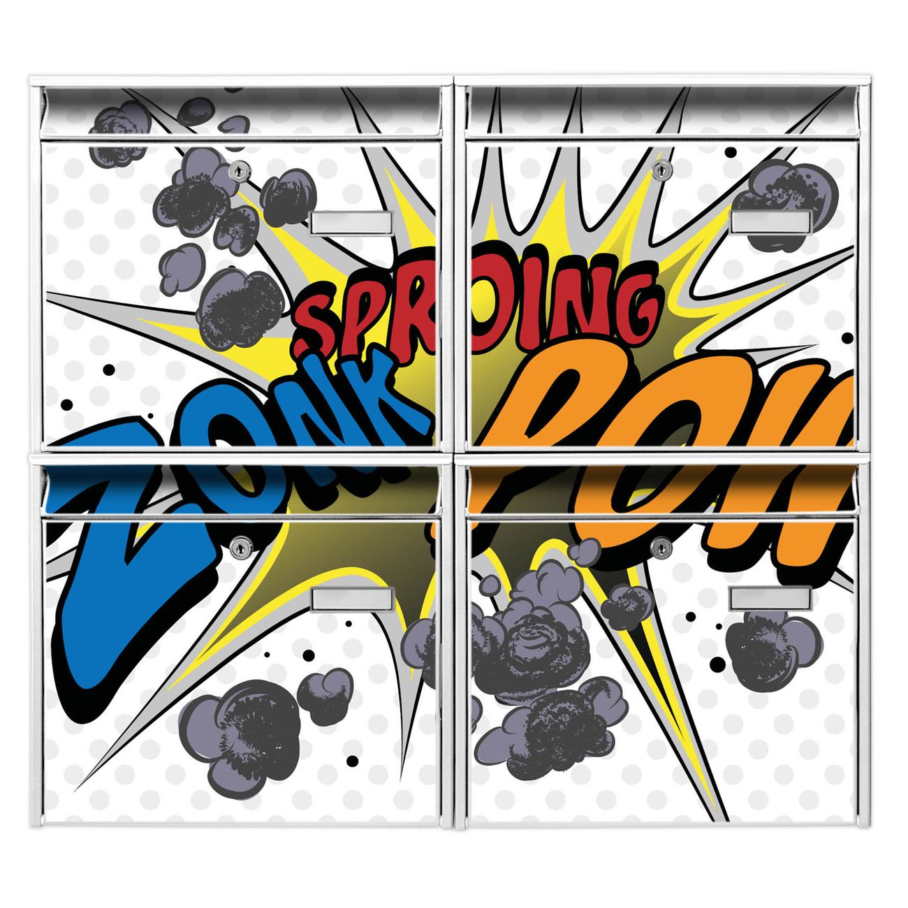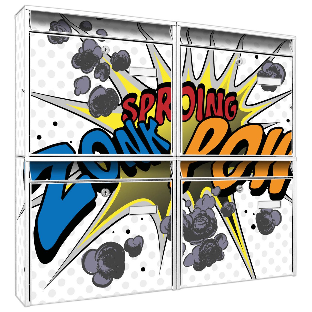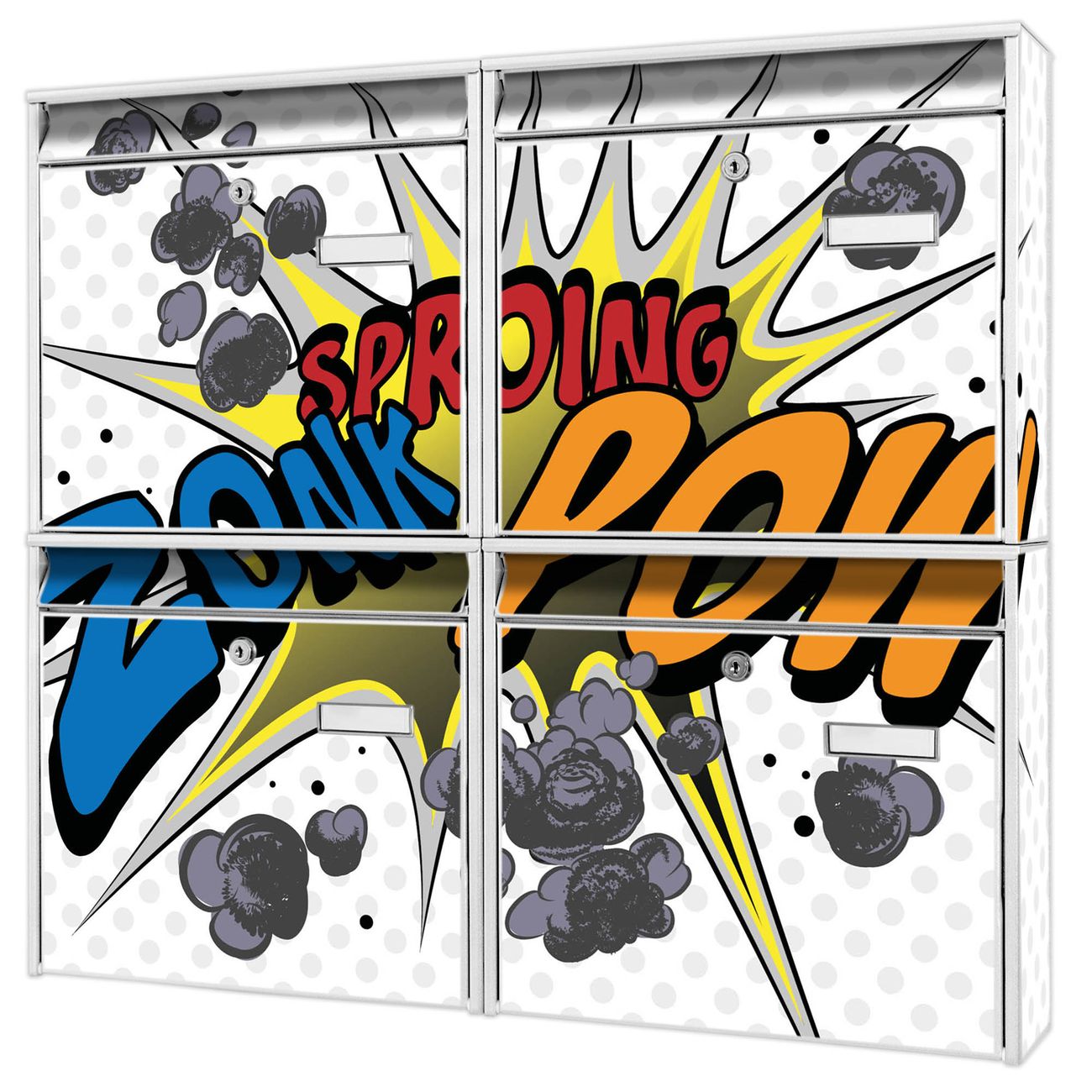 FUNKTION: Die Burg-Wächter Briefkastenanlage mit Motiv Comic bietet Ihnen ausreichend Fassungsvermögen um auch A4 und C4 Sendungen zu empfangen. Das integrierte Namensschild lässt sich individuell beschriften. Wählen Sie aus den Grundfarben weiß, silber und schwarz. DESIGN: Die 4 Briefkästen haben ein ansprechendes und zeitloses Design, ohne dabei auf Funktionalität zu verzichten. Das Material ist sehr stabil, wetterfest und rostfrei. Durch das Motiv Comic werden die Postkästen zu einem Blickfang. DETAILS: Die Postkästen bestehen aus verzinktem Stahl der zusätzlich mit Klarlack versiegelt wurde. Die Kästen sind gesamt 64,5cm hoch, 72,5cm breit und 10cm tief. Das Motiv besteht aus einer wetter- und UV-festen Folie, die Ihren Briefkasten zusätzlich vor Kratzern schützt. Die Postkästen werden mit Montagematerial, je einem Namensschild und je zwei Schlüsseln geliefert. NUTZEN: Das Briefkastenset eignet sich für die Wandmontage, die Größe bietet genügend Platz für Sendungen aller Art. Das zeitlose Design sowie die stabile Bauart bieten Ihnen einen treuen Begleiter für Ihre Post. BANJADO: