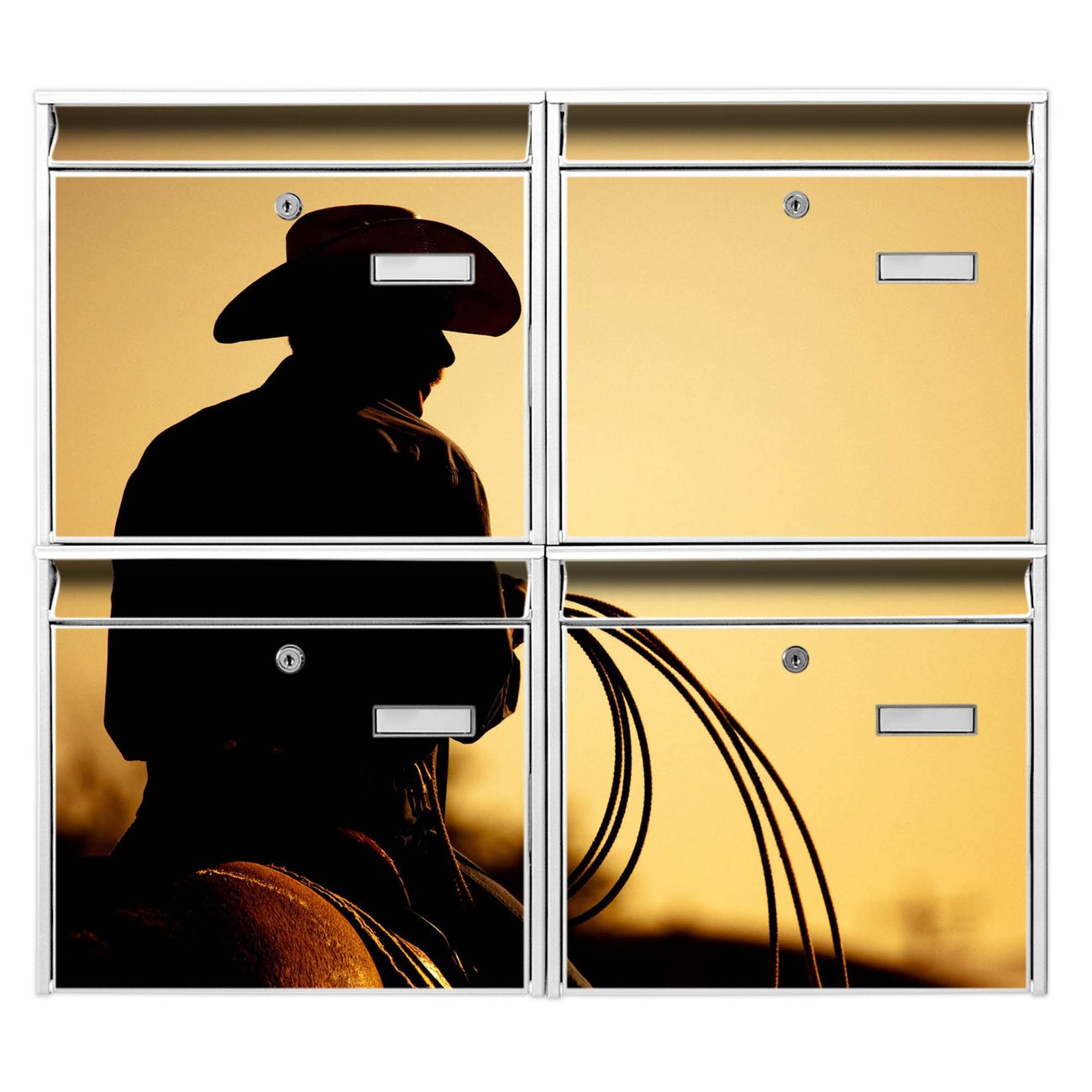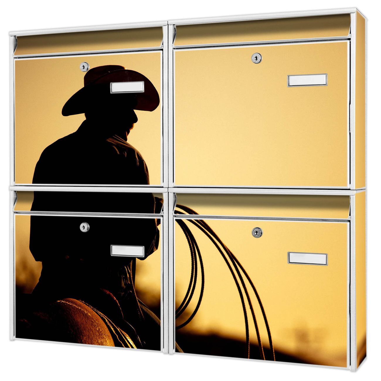 FUNKTION: Die Burg-Wächter Briefkastenanlage mit Motiv Cowboy bietet Ihnen ausreichend Fassungsvermögen um auch A4 und C4 Sendungen zu empfangen. Das integrierte Namensschild lässt sich individuell beschriften. Wählen Sie aus den Grundfarben weiß, silber und schwarz. DESIGN: Die 4 Briefkästen haben ein ansprechendes und zeitloses Design, ohne dabei auf Funktionalität zu verzichten. Das Material ist sehr stabil, wetterfest und rostfrei. Durch das Motiv Cowboy werden die Postkästen zu einem Blickfang. DETAILS: Die Postkästen bestehen aus verzinktem Stahl der zusätzlich mit Klarlack versiegelt wurde. Die Kästen sind gesamt 64,5cm hoch, 72,5cm breit und 10cm tief. Das Motiv besteht aus einer wetter- und UV-festen Folie, die Ihren Briefkasten zusätzlich vor Kratzern schützt. Die Postkästen werden mit Montagematerial, je einem Namensschild und je zwei Schlüsseln geliefert. NUTZEN: Das Briefkastenset eignet sich für die Wandmontage, die Größe bietet genügend Platz für Sendungen aller Art. Das zeitlose Design sowie die stabile Bauart bieten Ihnen einen treuen Begleiter für Ihre Post. BANJADO: