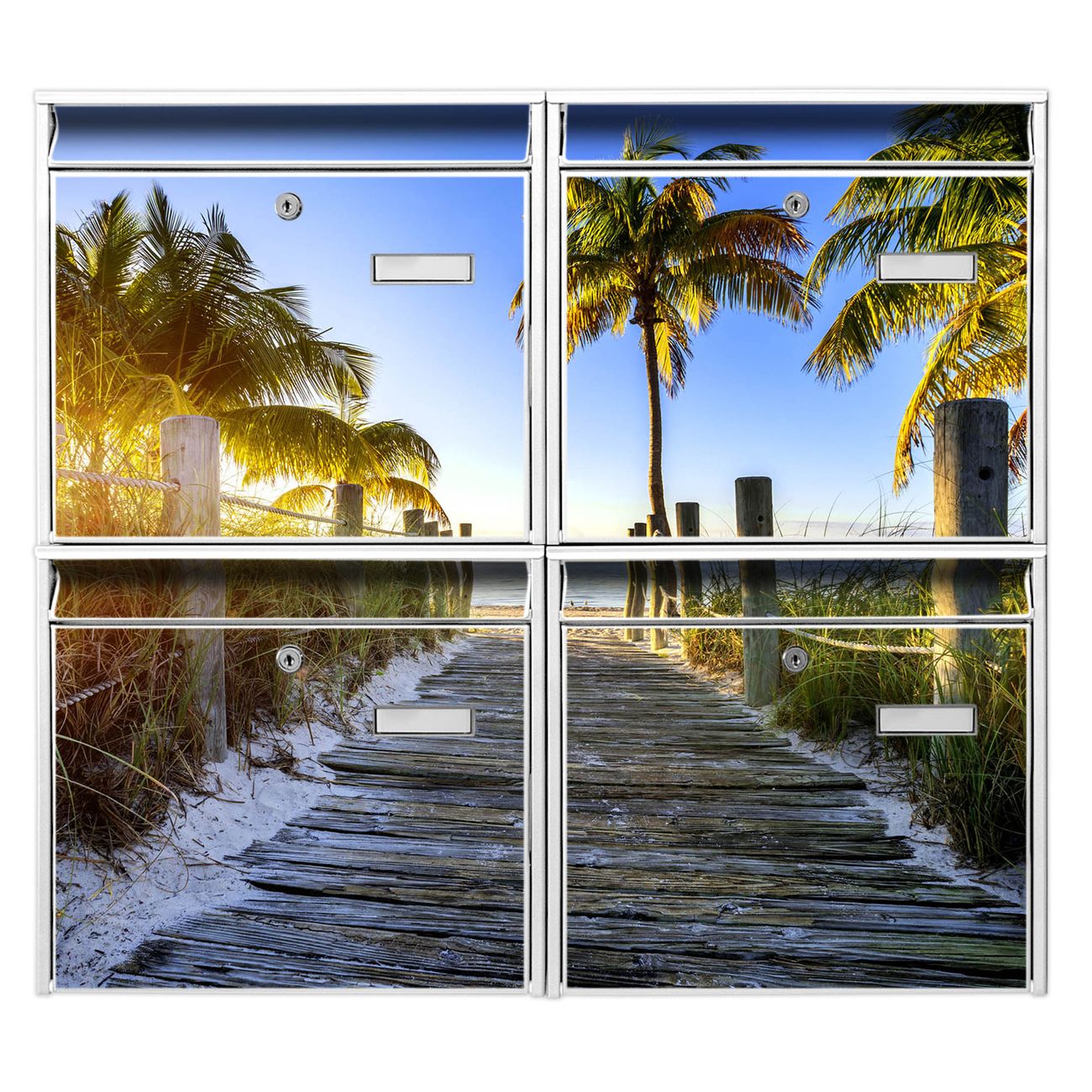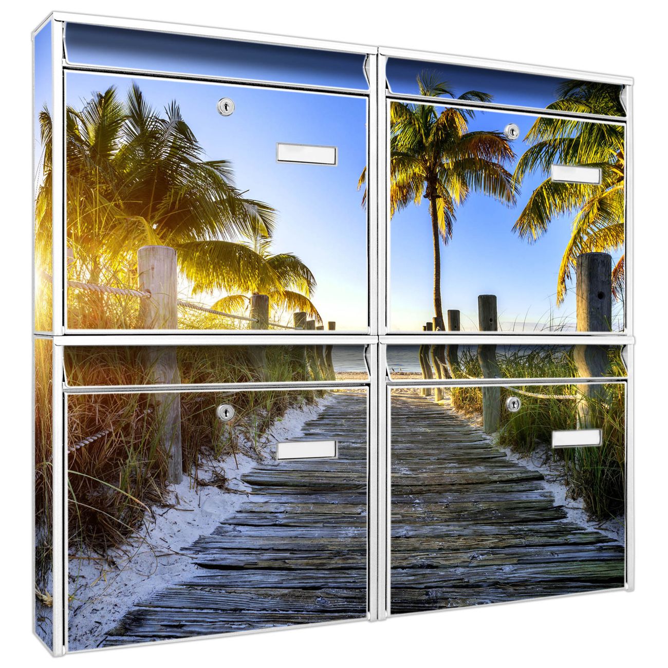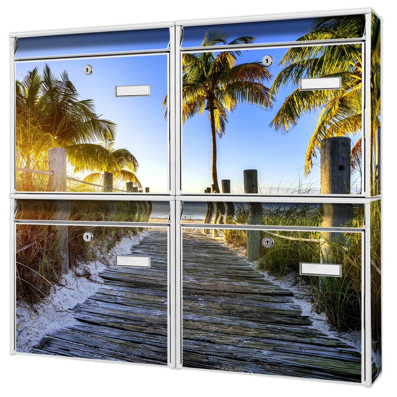 FUNKTION: Die Burg-Wächter Briefkastenanlage mit Motiv Weg zum Strand bietet Ihnen ausreichend Fassungsvermögen um auch A4 und C4 Sendungen zu empfangen. Das integrierte Namensschild lässt sich individuell beschriften. Wählen Sie aus den Grundfarben weiß, silber und schwarz. DESIGN: Die 4 Briefkästen haben ein ansprechendes und zeitloses Design, ohne dabei auf Funktionalität zu verzichten. Das Material ist sehr stabil, wetterfest und rostfrei. Durch das Motiv Weg zum Strand werden die Postkästen zu einem Blickfang. DETAILS: Die Postkästen bestehen aus verzinktem Stahl der zusätzlich mit Klarlack versiegelt wurde. Die Kästen sind gesamt 64,5cm hoch, 72,5cm breit und 10cm tief. Das Motiv besteht aus einer wetter- und UV-festen Folie, die Ihren Briefkasten zusätzlich vor Kratzern schützt. Die Postkästen werden mit Montagematerial, je einem Namensschild und je zwei Schlüsseln geliefert. NUTZEN: Das Briefkastenset eignet sich für die Wandmontage, die Größe bietet genügend Platz für Sendungen aller Art. Das zeitlose Design sowie die stabile Bauart bieten Ihnen einen treuen Begleiter für Ihre Post. BANJADO: