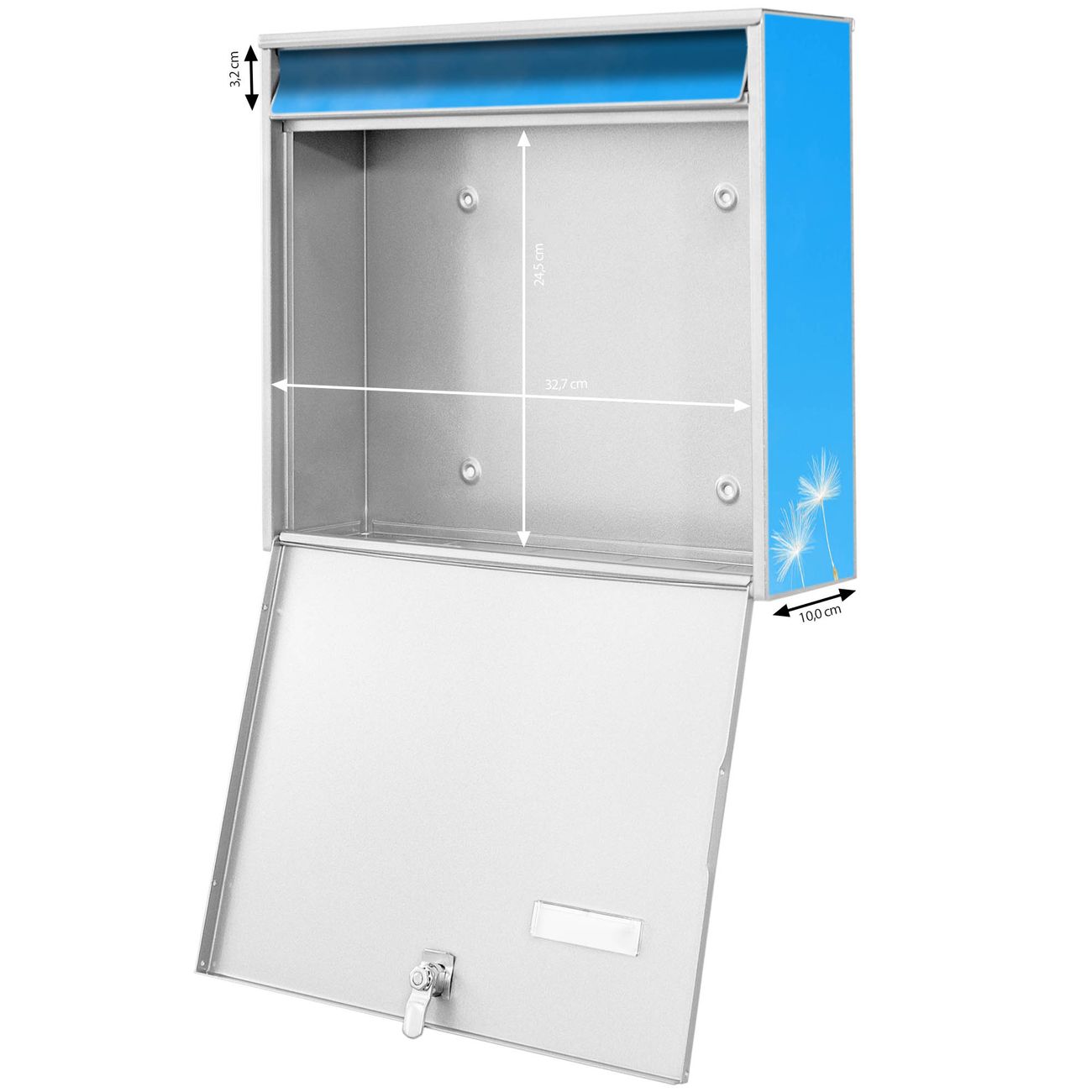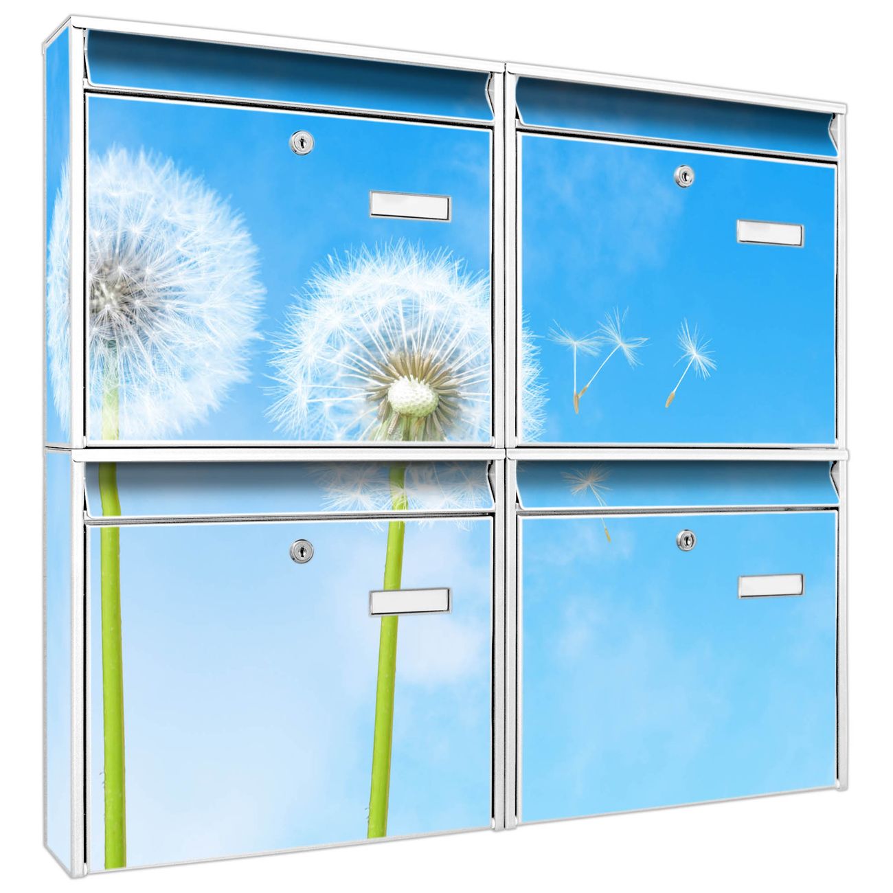 FUNKTION: Die Burg-Wächter Briefkastenanlage mit Motiv Dandelion bietet Ihnen ausreichend Fassungsvermögen um auch A4 und C4 Sendungen zu empfangen. Das integrierte Namensschild lässt sich individuell beschriften. Wählen Sie aus den Grundfarben weiß, silber und schwarz. DESIGN: Die 4 Briefkästen haben ein ansprechendes und zeitloses Design, ohne dabei auf Funktionalität zu verzichten. Das Material ist sehr stabil, wetterfest und rostfrei. Durch das Motiv Dandelion werden die Postkästen zu einem Blickfang. DETAILS: Die Postkästen bestehen aus verzinktem Stahl der zusätzlich mit Klarlack versiegelt wurde. Die Kästen sind gesamt 64,5cm hoch, 72,5cm breit und 10cm tief. Das Motiv besteht aus einer wetter- und UV-festen Folie, die Ihren Briefkasten zusätzlich vor Kratzern schützt. Die Postkästen werden mit Montagematerial, je einem Namensschild und je zwei Schlüsseln geliefert. NUTZEN: Das Briefkastenset eignet sich für die Wandmontage, die Größe bietet genügend Platz für Sendungen aller Art. Das zeitlose Design sowie die stabile Bauart bieten Ihnen einen treuen Begleiter für Ihre Post. BANJADO: