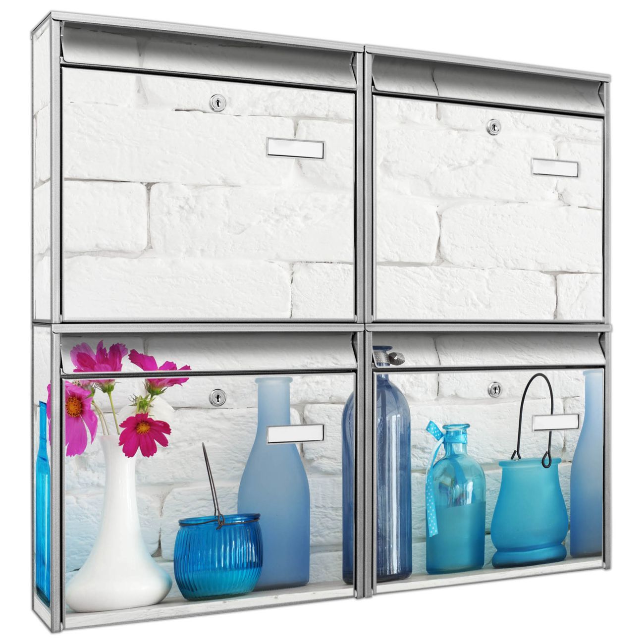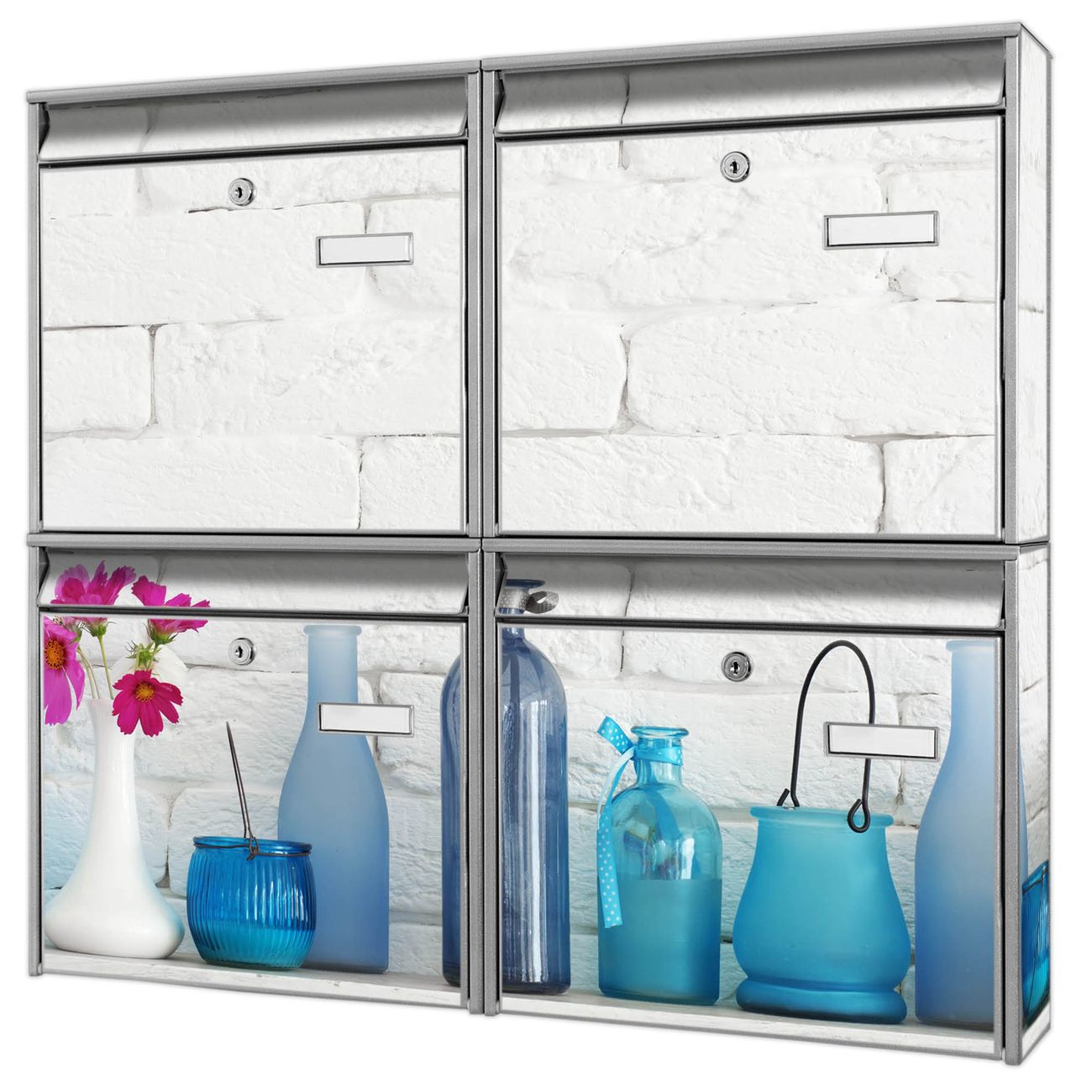 FUNKTION: Die Burg-Wächter Briefkastenanlage mit Motiv Dekoartikel Blau bietet Ihnen ausreichend Fassungsvermögen um auch A4 und C4 Sendungen zu empfangen. Das integrierte Namensschild lässt sich individuell beschriften. Wählen Sie aus den Grundfarben weiß, silber und schwarz. DESIGN: Die 4 Briefkästen haben ein ansprechendes und zeitloses Design, ohne dabei auf Funktionalität zu verzichten. Das Material ist sehr stabil, wetterfest und rostfrei. Durch das Motiv Dekoartikel Blau werden die Postkästen zu einem Blickfang. DETAILS: Die Postkästen bestehen aus verzinktem Stahl der zusätzlich mit Klarlack versiegelt wurde. Die Kästen sind gesamt 64,5cm hoch, 72,5cm breit und 10cm tief. Das Motiv besteht aus einer wetter- und UV-festen Folie, die Ihren Briefkasten zusätzlich vor Kratzern schützt. Die Postkästen werden mit Montagematerial, je einem Namensschild und je zwei Schlüsseln geliefert. NUTZEN: Das Briefkastenset eignet sich für die Wandmontage, die Größe bietet genügend Platz für Sendungen aller Art. Das zeitlose Design sowie die stabile Bauart bieten Ihnen einen treuen Begleiter für Ihre Post. BANJADO:
