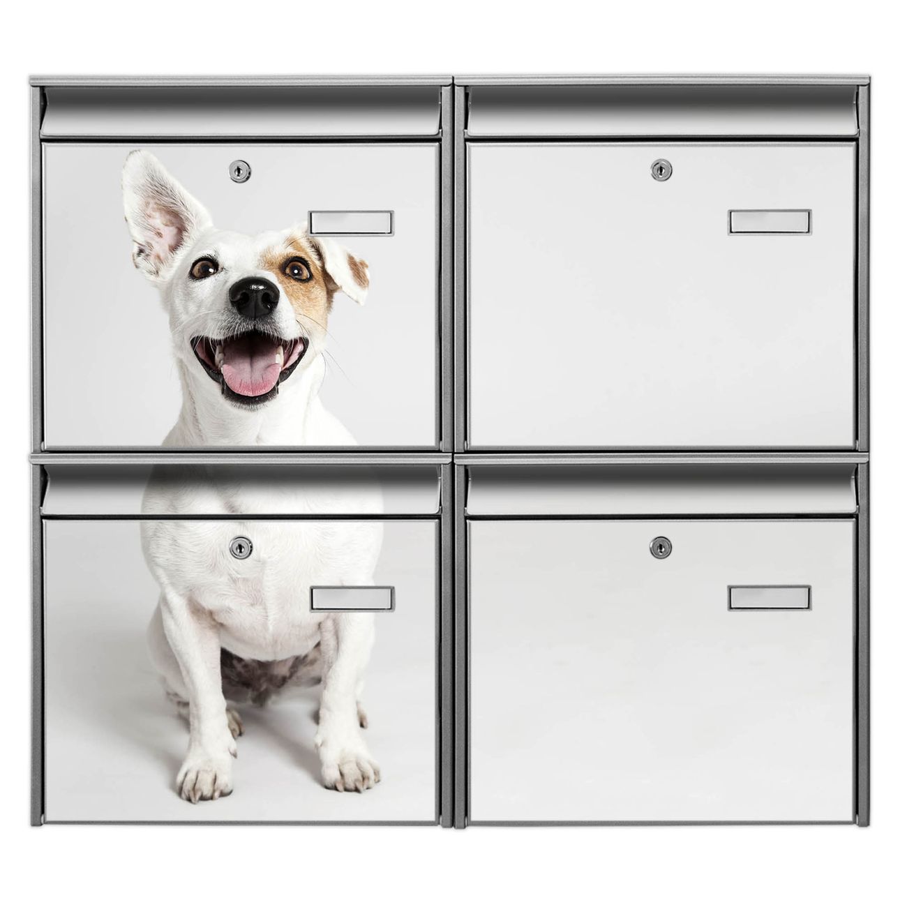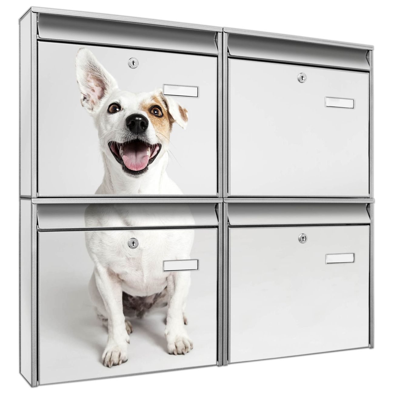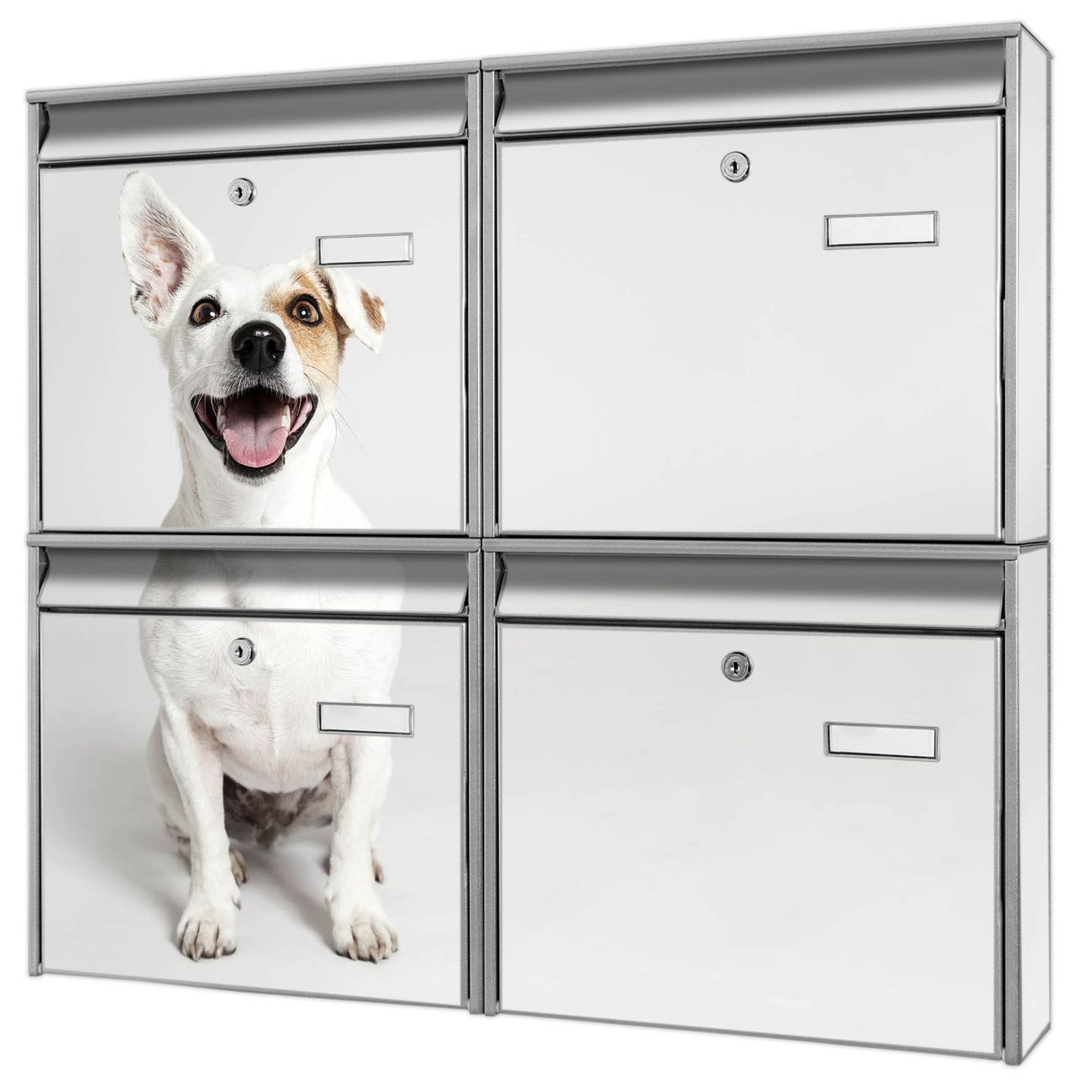 FUNKTION: Die Burg-Wächter Briefkastenanlage mit Motiv Derek bietet Ihnen ausreichend Fassungsvermögen um auch A4 und C4 Sendungen zu empfangen. Das integrierte Namensschild lässt sich individuell beschriften. Wählen Sie aus den Grundfarben weiß, silber und schwarz. DESIGN: Die 4 Briefkästen haben ein ansprechendes und zeitloses Design, ohne dabei auf Funktionalität zu verzichten. Das Material ist sehr stabil, wetterfest und rostfrei. Durch das Motiv Derek werden die Postkästen zu einem Blickfang. DETAILS: Die Postkästen bestehen aus verzinktem Stahl der zusätzlich mit Klarlack versiegelt wurde. Die Kästen sind gesamt 64,5cm hoch, 72,5cm breit und 10cm tief. Das Motiv besteht aus einer wetter- und UV-festen Folie, die Ihren Briefkasten zusätzlich vor Kratzern schützt. Die Postkästen werden mit Montagematerial, je einem Namensschild und je zwei Schlüsseln geliefert. NUTZEN: Das Briefkastenset eignet sich für die Wandmontage, die Größe bietet genügend Platz für Sendungen aller Art. Das zeitlose Design sowie die stabile Bauart bieten Ihnen einen treuen Begleiter für Ihre Post. BANJADO: