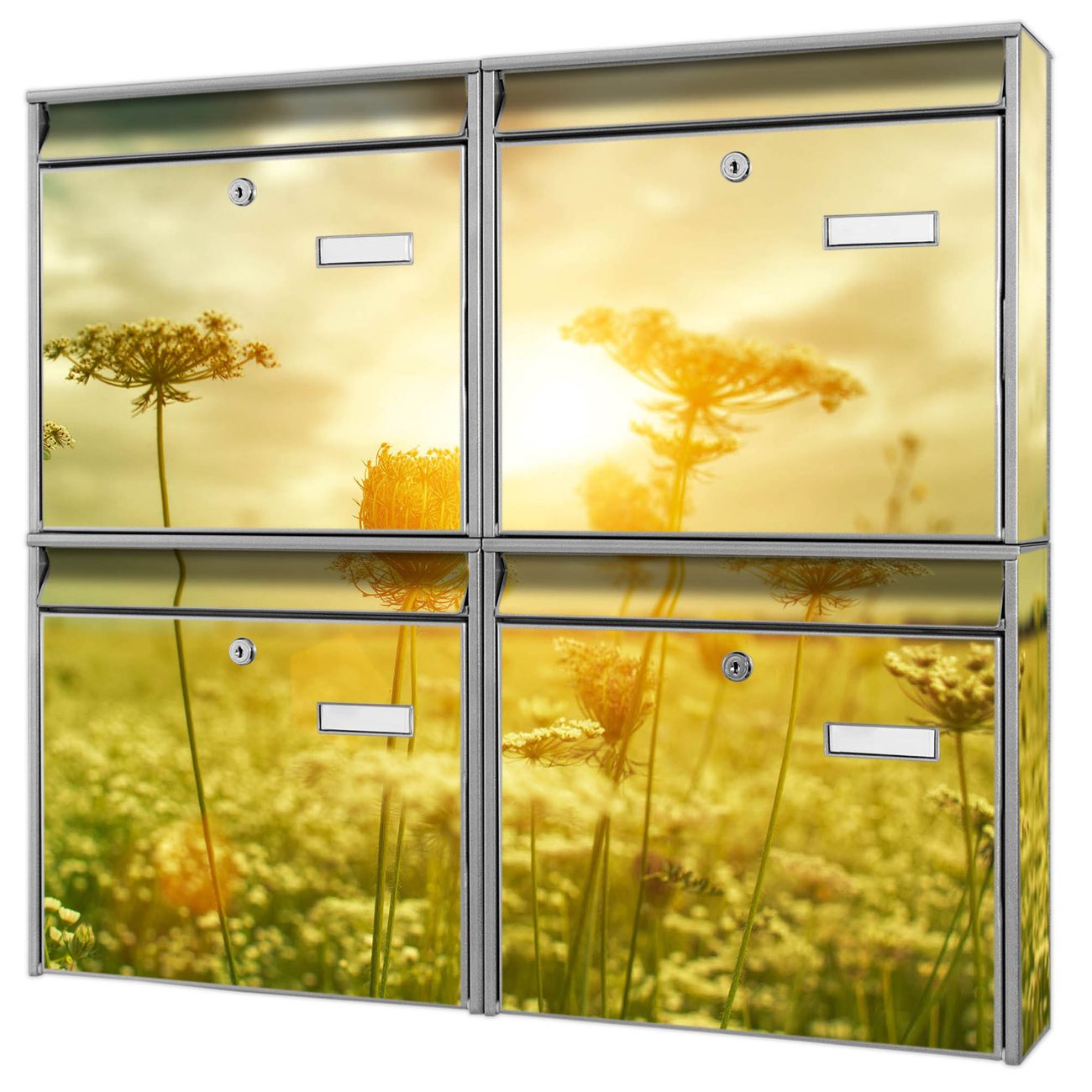 FUNKTION: Die Burg-Wächter Briefkastenanlage mit Motiv Dill im Sonnenlicht bietet Ihnen ausreichend Fassungsvermögen um auch A4 und C4 Sendungen zu empfangen. Das integrierte Namensschild lässt sich individuell beschriften. Wählen Sie aus den Grundfarben weiß, silber und schwarz. DESIGN: Die 4 Briefkästen haben ein ansprechendes und zeitloses Design, ohne dabei auf Funktionalität zu verzichten. Das Material ist sehr stabil, wetterfest und rostfrei. Durch das Motiv Dill im Sonnenlicht werden die Postkästen zu einem Blickfang. DETAILS: Die Postkästen bestehen aus verzinktem Stahl der zusätzlich mit Klarlack versiegelt wurde. Die Kästen sind gesamt 64,5cm hoch, 72,5cm breit und 10cm tief. Das Motiv besteht aus einer wetter- und UV-festen Folie, die Ihren Briefkasten zusätzlich vor Kratzern schützt. Die Postkästen werden mit Montagematerial, je einem Namensschild und je zwei Schlüsseln geliefert. NUTZEN: Das Briefkastenset eignet sich für die Wandmontage, die Größe bietet genügend Platz für Sendungen aller Art. Das zeitlose Design sowie die stabile Bauart bieten Ihnen einen treuen Begleiter für Ihre Post. BANJADO: