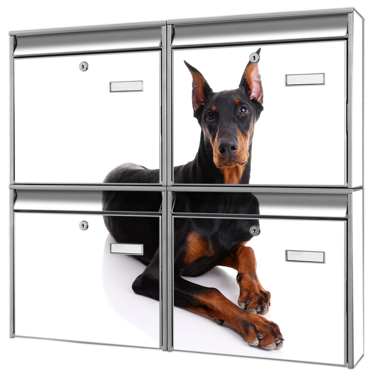 FUNKTION: Die Burg-Wächter Briefkastenanlage mit Motiv Dobermann bietet Ihnen ausreichend Fassungsvermögen um auch A4 und C4 Sendungen zu empfangen. Das integrierte Namensschild lässt sich individuell beschriften. Wählen Sie aus den Grundfarben weiß, silber und schwarz. DESIGN: Die 4 Briefkästen haben ein ansprechendes und zeitloses Design, ohne dabei auf Funktionalität zu verzichten. Das Material ist sehr stabil, wetterfest und rostfrei. Durch das Motiv Dobermann werden die Postkästen zu einem Blickfang. DETAILS: Die Postkästen bestehen aus verzinktem Stahl der zusätzlich mit Klarlack versiegelt wurde. Die Kästen sind gesamt 64,5cm hoch, 72,5cm breit und 10cm tief. Das Motiv besteht aus einer wetter- und UV-festen Folie, die Ihren Briefkasten zusätzlich vor Kratzern schützt. Die Postkästen werden mit Montagematerial, je einem Namensschild und je zwei Schlüsseln geliefert. NUTZEN: Das Briefkastenset eignet sich für die Wandmontage, die Größe bietet genügend Platz für Sendungen aller Art. Das zeitlose Design sowie die stabile Bauart bieten Ihnen einen treuen Begleiter für Ihre Post. BANJADO: