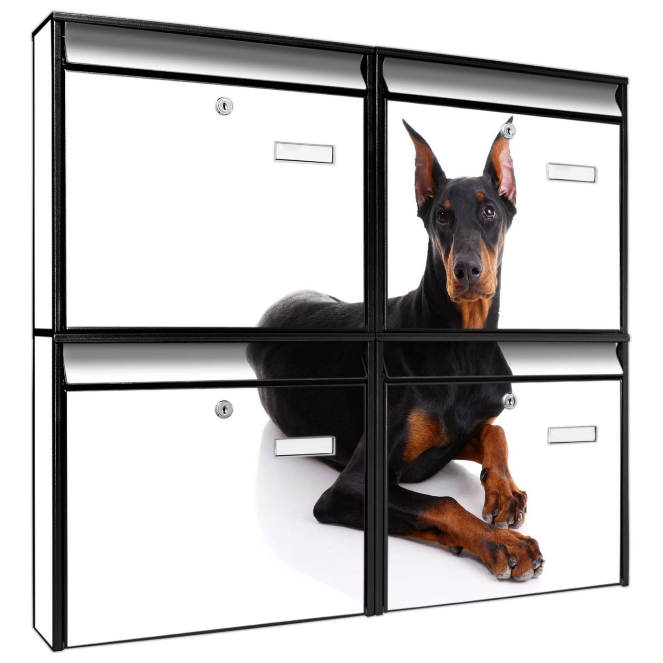 FUNKTION: Die Burg-Wächter Briefkastenanlage mit Motiv Dobermann bietet Ihnen ausreichend Fassungsvermögen um auch A4 und C4 Sendungen zu empfangen. Das integrierte Namensschild lässt sich individuell beschriften. Wählen Sie aus den Grundfarben weiß, silber und schwarz. DESIGN: Die 4 Briefkästen haben ein ansprechendes und zeitloses Design, ohne dabei auf Funktionalität zu verzichten. Das Material ist sehr stabil, wetterfest und rostfrei. Durch das Motiv Dobermann werden die Postkästen zu einem Blickfang. DETAILS: Die Postkästen bestehen aus verzinktem Stahl der zusätzlich mit Klarlack versiegelt wurde. Die Kästen sind gesamt 64,5cm hoch, 72,5cm breit und 10cm tief. Das Motiv besteht aus einer wetter- und UV-festen Folie, die Ihren Briefkasten zusätzlich vor Kratzern schützt. Die Postkästen werden mit Montagematerial, je einem Namensschild und je zwei Schlüsseln geliefert. NUTZEN: Das Briefkastenset eignet sich für die Wandmontage, die Größe bietet genügend Platz für Sendungen aller Art. Das zeitlose Design sowie die stabile Bauart bieten Ihnen einen treuen Begleiter für Ihre Post. BANJADO: