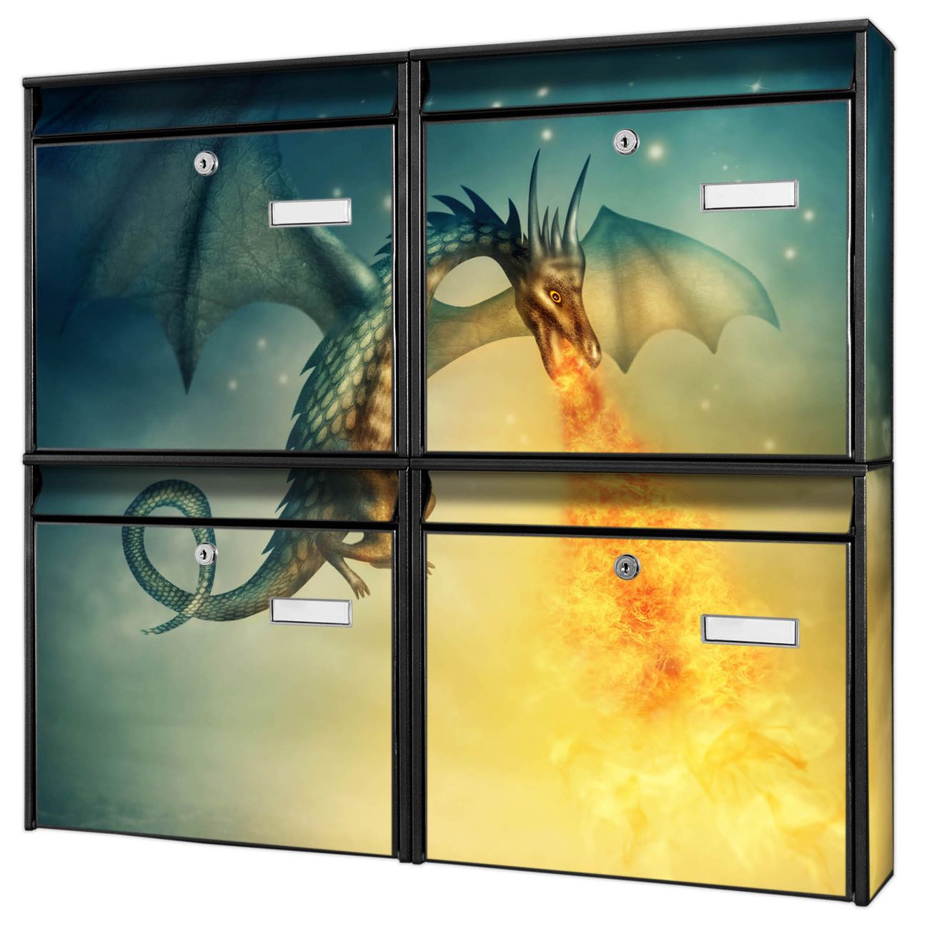 FUNKTION: Die Burg-Wächter Briefkastenanlage mit Motiv Drachen bietet Ihnen ausreichend Fassungsvermögen um auch A4 und C4 Sendungen zu empfangen. Das integrierte Namensschild lässt sich individuell beschriften. Wählen Sie aus den Grundfarben weiß, silber und schwarz. DESIGN: Die 4 Briefkästen haben ein ansprechendes und zeitloses Design, ohne dabei auf Funktionalität zu verzichten. Das Material ist sehr stabil, wetterfest und rostfrei. Durch das Motiv Drachen werden die Postkästen zu einem Blickfang. DETAILS: Die Postkästen bestehen aus verzinktem Stahl der zusätzlich mit Klarlack versiegelt wurde. Die Kästen sind gesamt 64,5cm hoch, 72,5cm breit und 10cm tief. Das Motiv besteht aus einer wetter- und UV-festen Folie, die Ihren Briefkasten zusätzlich vor Kratzern schützt. Die Postkästen werden mit Montagematerial, je einem Namensschild und je zwei Schlüsseln geliefert. NUTZEN: Das Briefkastenset eignet sich für die Wandmontage, die Größe bietet genügend Platz für Sendungen aller Art. Das zeitlose Design sowie die stabile Bauart bieten Ihnen einen treuen Begleiter für Ihre Post. BANJADO: