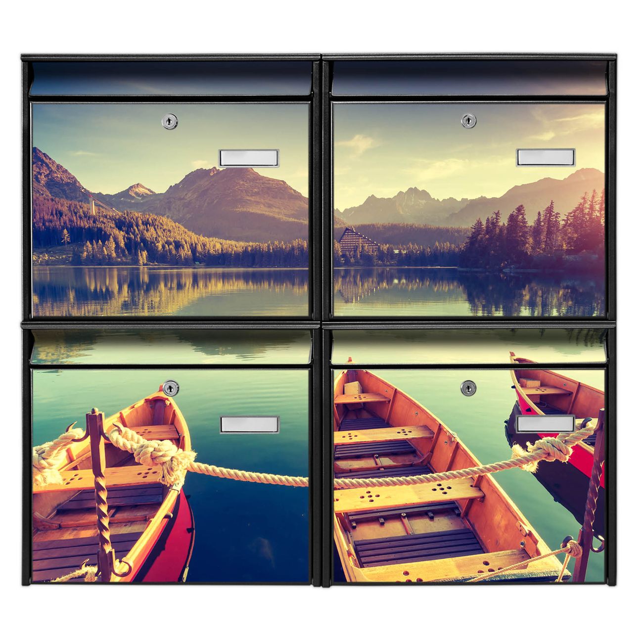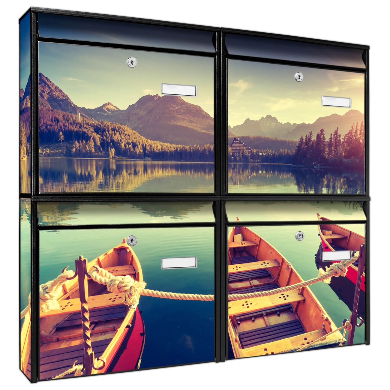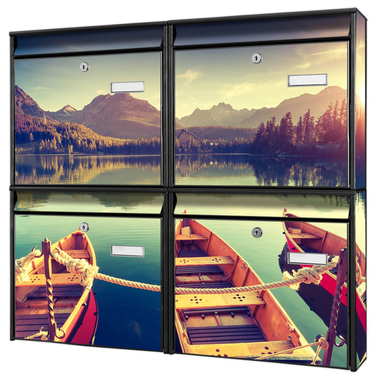 FUNKTION: Die Burg-Wächter Briefkastenanlage mit Motiv Drei Boote Am Steg bietet Ihnen ausreichend Fassungsvermögen um auch A4 und C4 Sendungen zu empfangen. Das integrierte Namensschild lässt sich individuell beschriften. Wählen Sie aus den Grundfarben weiß, silber und schwarz. DESIGN: Die 4 Briefkästen haben ein ansprechendes und zeitloses Design, ohne dabei auf Funktionalität zu verzichten. Das Material ist sehr stabil, wetterfest und rostfrei. Durch das Motiv Drei Boote Am Steg werden die Postkästen zu einem Blickfang. DETAILS: Die Postkästen bestehen aus verzinktem Stahl der zusätzlich mit Klarlack versiegelt wurde. Die Kästen sind gesamt 64,5cm hoch, 72,5cm breit und 10cm tief. Das Motiv besteht aus einer wetter- und UV-festen Folie, die Ihren Briefkasten zusätzlich vor Kratzern schützt. Die Postkästen werden mit Montagematerial, je einem Namensschild und je zwei Schlüsseln geliefert. NUTZEN: Das Briefkastenset eignet sich für die Wandmontage, die Größe bietet genügend Platz für Sendungen aller Art. Das zeitlose Design sowie die stabile Bauart bieten Ihnen einen treuen Begleiter für Ihre Post. BANJADO: