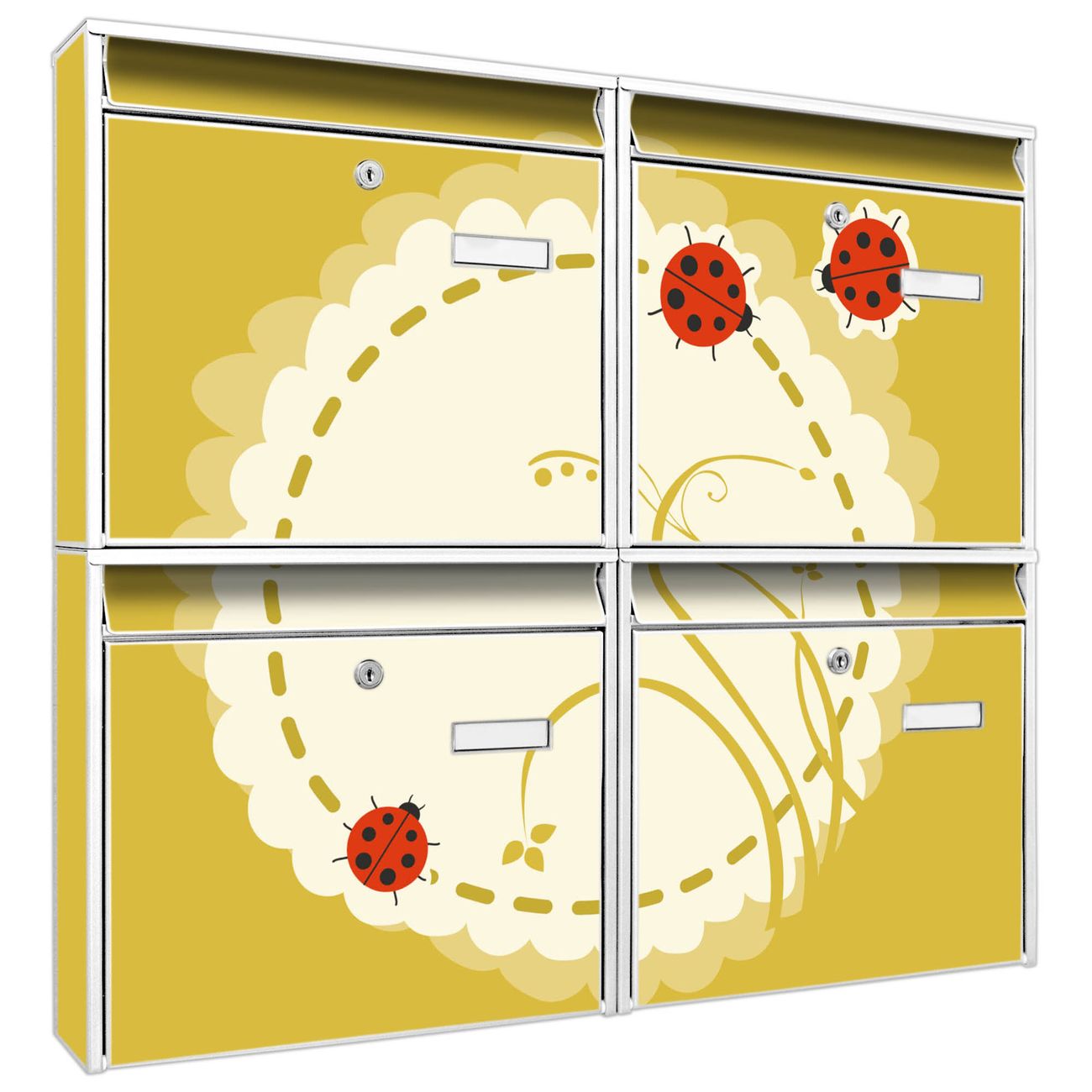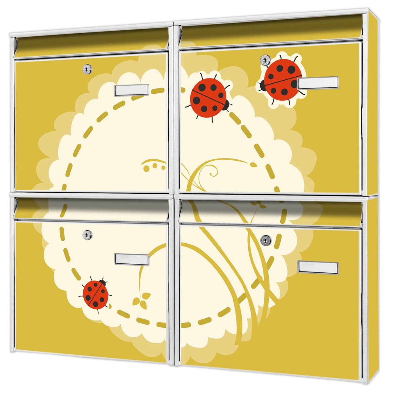 FUNKTION: Die Burg-Wächter Briefkastenanlage mit Motiv Drei Marienkäfer bietet Ihnen ausreichend Fassungsvermögen um auch A4 und C4 Sendungen zu empfangen. Das integrierte Namensschild lässt sich individuell beschriften. Wählen Sie aus den Grundfarben weiß, silber und schwarz. DESIGN: Die 4 Briefkästen haben ein ansprechendes und zeitloses Design, ohne dabei auf Funktionalität zu verzichten. Das Material ist sehr stabil, wetterfest und rostfrei. Durch das Motiv Drei Marienkäfer werden die Postkästen zu einem Blickfang. DETAILS: Die Postkästen bestehen aus verzinktem Stahl der zusätzlich mit Klarlack versiegelt wurde. Die Kästen sind gesamt 64,5cm hoch, 72,5cm breit und 10cm tief. Das Motiv besteht aus einer wetter- und UV-festen Folie, die Ihren Briefkasten zusätzlich vor Kratzern schützt. Die Postkästen werden mit Montagematerial, je einem Namensschild und je zwei Schlüsseln geliefert. NUTZEN: Das Briefkastenset eignet sich für die Wandmontage, die Größe bietet genügend Platz für Sendungen aller Art. Das zeitlose Design sowie die stabile Bauart bieten Ihnen einen treuen Begleiter für Ihre Post. BANJADO: