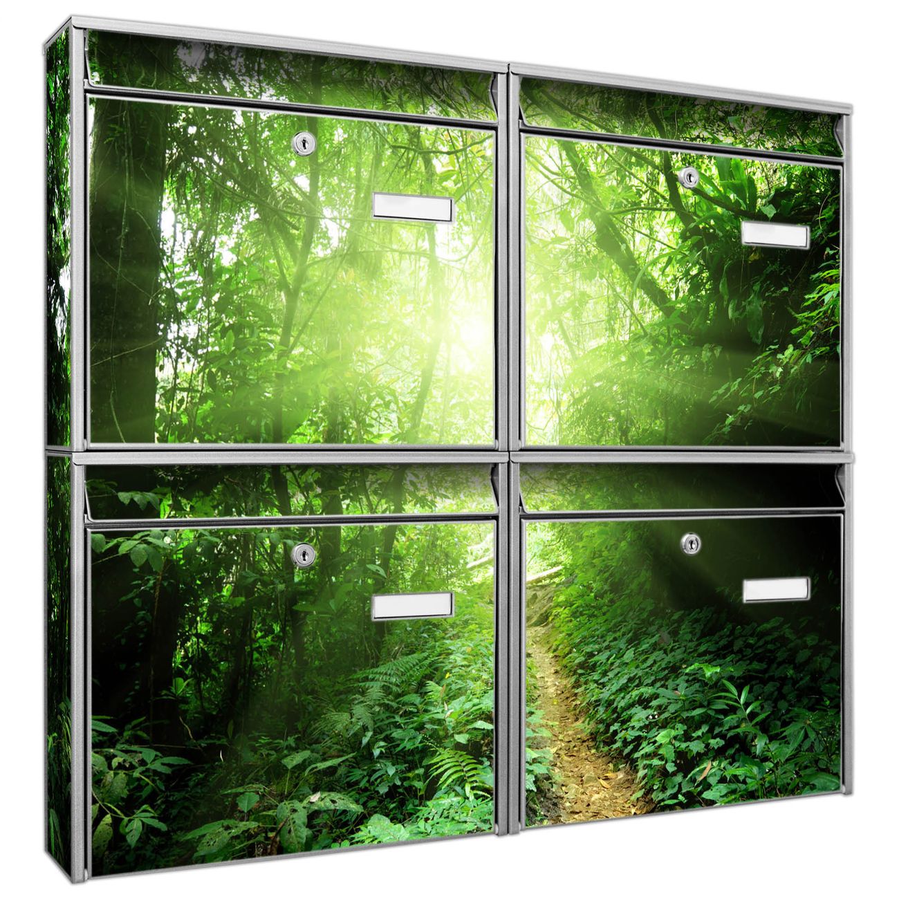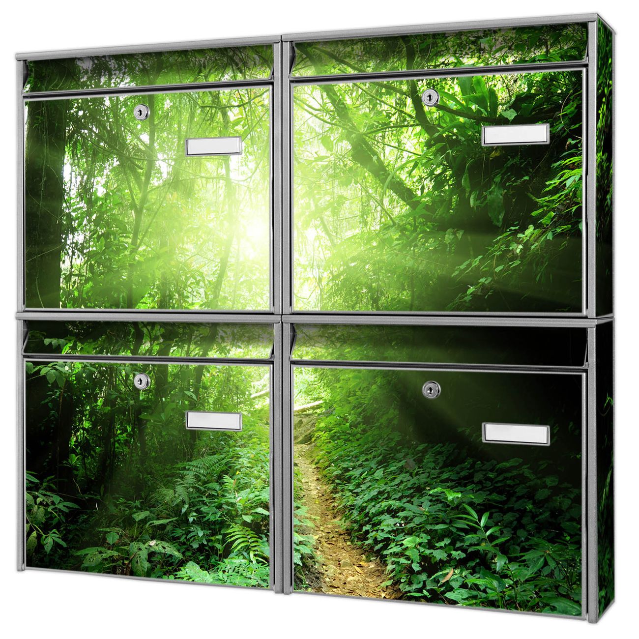 FUNKTION: Die Burg-Wächter Briefkastenanlage mit Motiv Dschungel Malaysia bietet Ihnen ausreichend Fassungsvermögen um auch A4 und C4 Sendungen zu empfangen. Das integrierte Namensschild lässt sich individuell beschriften. Wählen Sie aus den Grundfarben weiß, silber und schwarz. DESIGN: Die 4 Briefkästen haben ein ansprechendes und zeitloses Design, ohne dabei auf Funktionalität zu verzichten. Das Material ist sehr stabil, wetterfest und rostfrei. Durch das Motiv Dschungel Malaysia werden die Postkästen zu einem Blickfang. DETAILS: Die Postkästen bestehen aus verzinktem Stahl der zusätzlich mit Klarlack versiegelt wurde. Die Kästen sind gesamt 64,5cm hoch, 72,5cm breit und 10cm tief. Das Motiv besteht aus einer wetter- und UV-festen Folie, die Ihren Briefkasten zusätzlich vor Kratzern schützt. Die Postkästen werden mit Montagematerial, je einem Namensschild und je zwei Schlüsseln geliefert. NUTZEN: Das Briefkastenset eignet sich für die Wandmontage, die Größe bietet genügend Platz für Sendungen aller Art. Das zeitlose Design sowie die stabile Bauart bieten Ihnen einen treuen Begleiter für Ihre Post. BANJADO:
