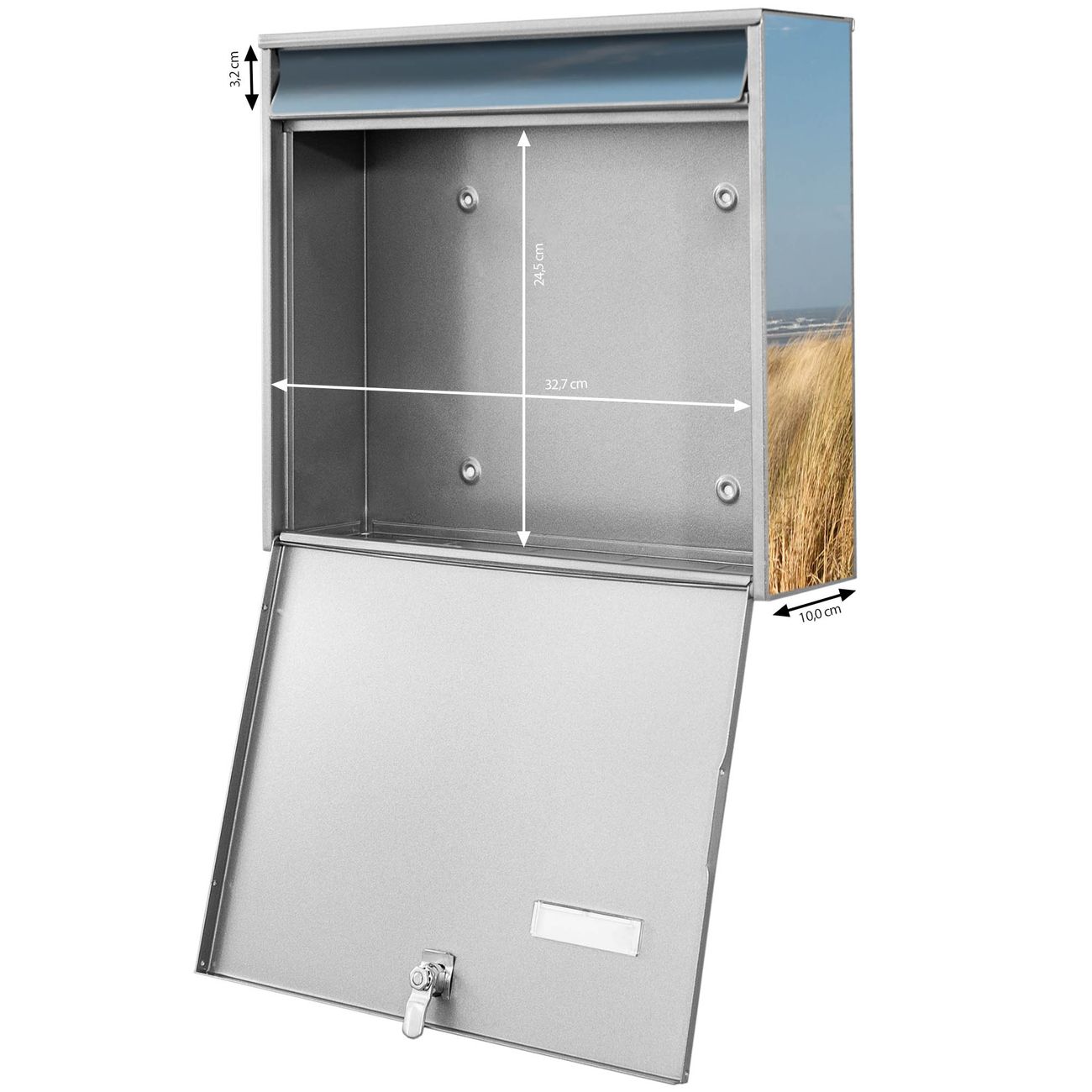 FUNKTION: Die Burg-Wächter Briefkastenanlage mit Motiv Dünen bietet Ihnen ausreichend Fassungsvermögen um auch A4 und C4 Sendungen zu empfangen. Das integrierte Namensschild lässt sich individuell beschriften. Wählen Sie aus den Grundfarben weiß, silber und schwarz. DESIGN: Die 4 Briefkästen haben ein ansprechendes und zeitloses Design, ohne dabei auf Funktionalität zu verzichten. Das Material ist sehr stabil, wetterfest und rostfrei. Durch das Motiv Dünen werden die Postkästen zu einem Blickfang. DETAILS: Die Postkästen bestehen aus verzinktem Stahl der zusätzlich mit Klarlack versiegelt wurde. Die Kästen sind gesamt 64,5cm hoch, 72,5cm breit und 10cm tief. Das Motiv besteht aus einer wetter- und UV-festen Folie, die Ihren Briefkasten zusätzlich vor Kratzern schützt. Die Postkästen werden mit Montagematerial, je einem Namensschild und je zwei Schlüsseln geliefert. NUTZEN: Das Briefkastenset eignet sich für die Wandmontage, die Größe bietet genügend Platz für Sendungen aller Art. Das zeitlose Design sowie die stabile Bauart bieten Ihnen einen treuen Begleiter für Ihre Post. BANJADO: