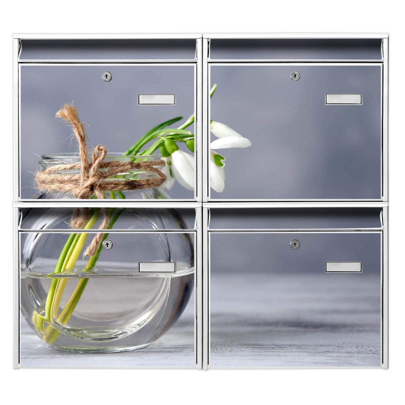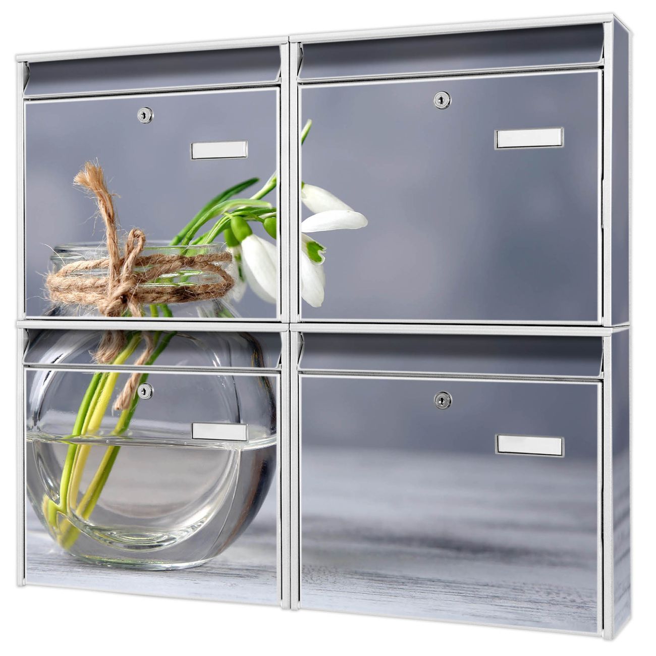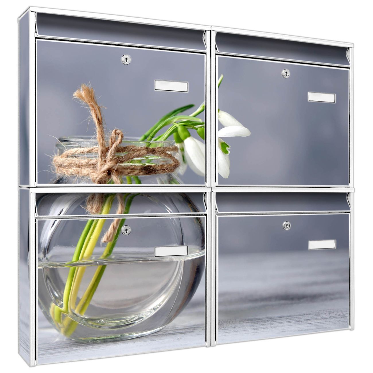 FUNKTION: Die Burg-Wächter Briefkastenanlage mit Motiv Gänseblümchen im Glas bietet Ihnen ausreichend Fassungsvermögen um auch A4 und C4 Sendungen zu empfangen. Das integrierte Namensschild lässt sich individuell beschriften. Wählen Sie aus den Grundfarben weiß, silber und schwarz. DESIGN: Die 4 Briefkästen haben ein ansprechendes und zeitloses Design, ohne dabei auf Funktionalität zu verzichten. Das Material ist sehr stabil, wetterfest und rostfrei. Durch das Motiv Gänseblümchen im Glas werden die Postkästen zu einem Blickfang. DETAILS: Die Postkästen bestehen aus verzinktem Stahl der zusätzlich mit Klarlack versiegelt wurde. Die Kästen sind gesamt 64,5cm hoch, 72,5cm breit und 10cm tief. Das Motiv besteht aus einer wetter- und UV-festen Folie, die Ihren Briefkasten zusätzlich vor Kratzern schützt. Die Postkästen werden mit Montagematerial, je einem Namensschild und je zwei Schlüsseln geliefert. NUTZEN: Das Briefkastenset eignet sich für die Wandmontage, die Größe bietet genügend Platz für Sendungen aller Art. Das zeitlose Design sowie die stabile Bauart bieten Ihnen einen treuen Begleiter für Ihre Post. BANJADO: