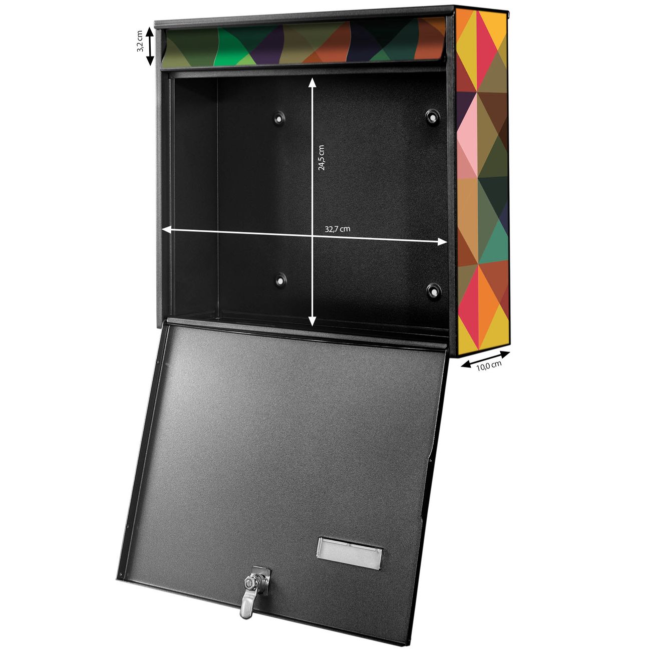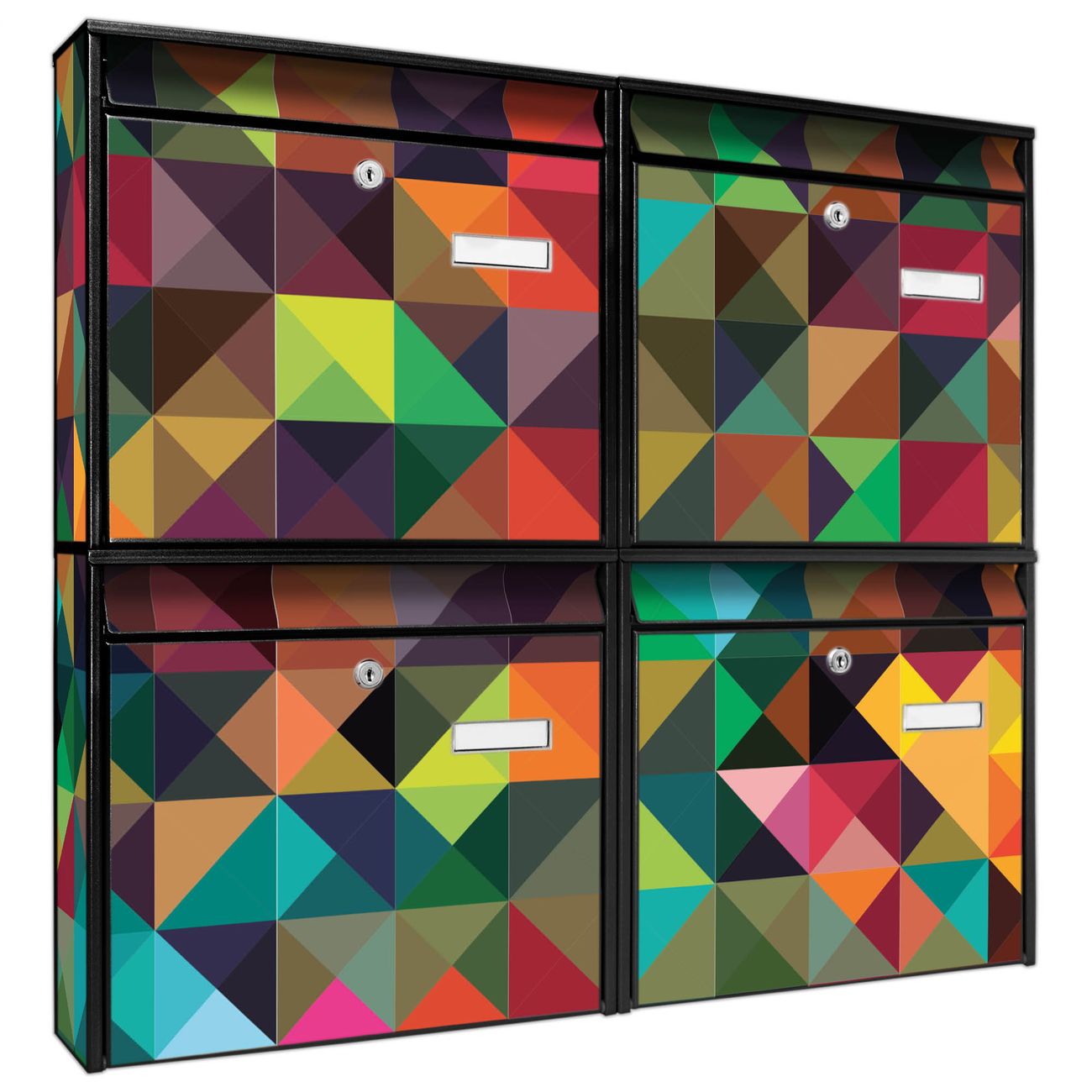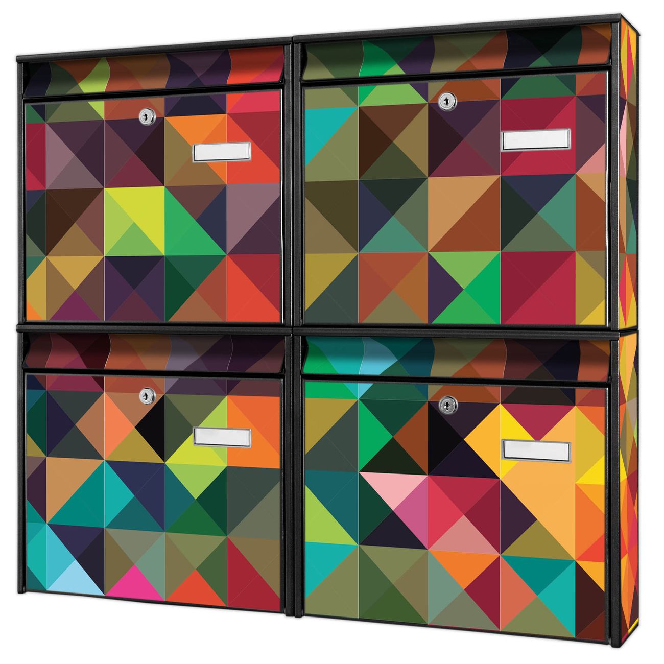 FUNKTION: Die Burg-Wächter Briefkastenanlage mit Motiv Dunkles Kaleidoskop bietet Ihnen ausreichend Fassungsvermögen um auch A4 und C4 Sendungen zu empfangen. Das integrierte Namensschild lässt sich individuell beschriften. Wählen Sie aus den Grundfarben weiß, silber und schwarz. DESIGN: Die 4 Briefkästen haben ein ansprechendes und zeitloses Design, ohne dabei auf Funktionalität zu verzichten. Das Material ist sehr stabil, wetterfest und rostfrei. Durch das Motiv Dunkles Kaleidoskop werden die Postkästen zu einem Blickfang. DETAILS: Die Postkästen bestehen aus verzinktem Stahl der zusätzlich mit Klarlack versiegelt wurde. Die Kästen sind gesamt 64,5cm hoch, 72,5cm breit und 10cm tief. Das Motiv besteht aus einer wetter- und UV-festen Folie, die Ihren Briefkasten zusätzlich vor Kratzern schützt. Die Postkästen werden mit Montagematerial, je einem Namensschild und je zwei Schlüsseln geliefert. NUTZEN: Das Briefkastenset eignet sich für die Wandmontage, die Größe bietet genügend Platz für Sendungen aller Art. Das zeitlose Design sowie die stabile Bauart bieten Ihnen einen treuen Begleiter für Ihre Post. BANJADO:
