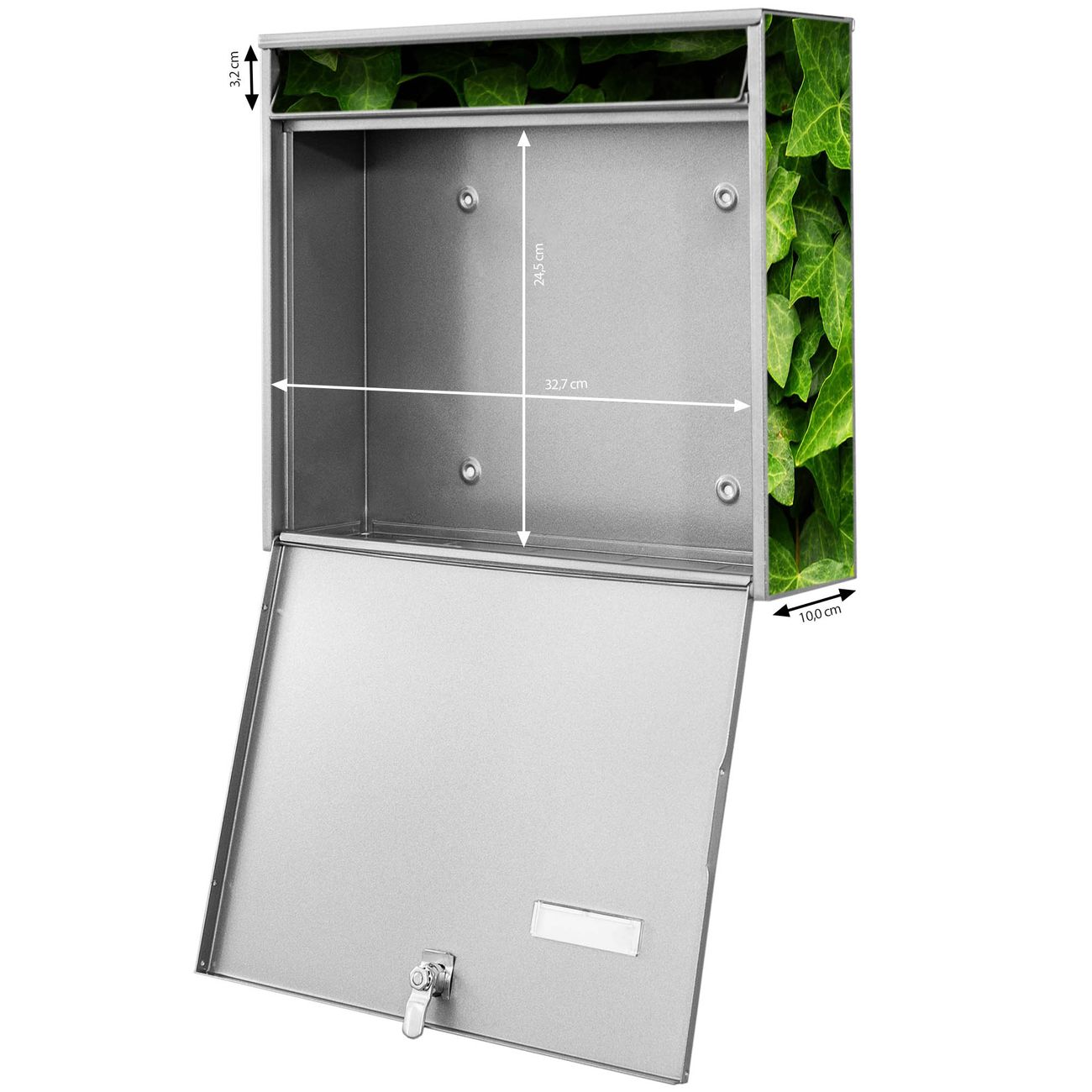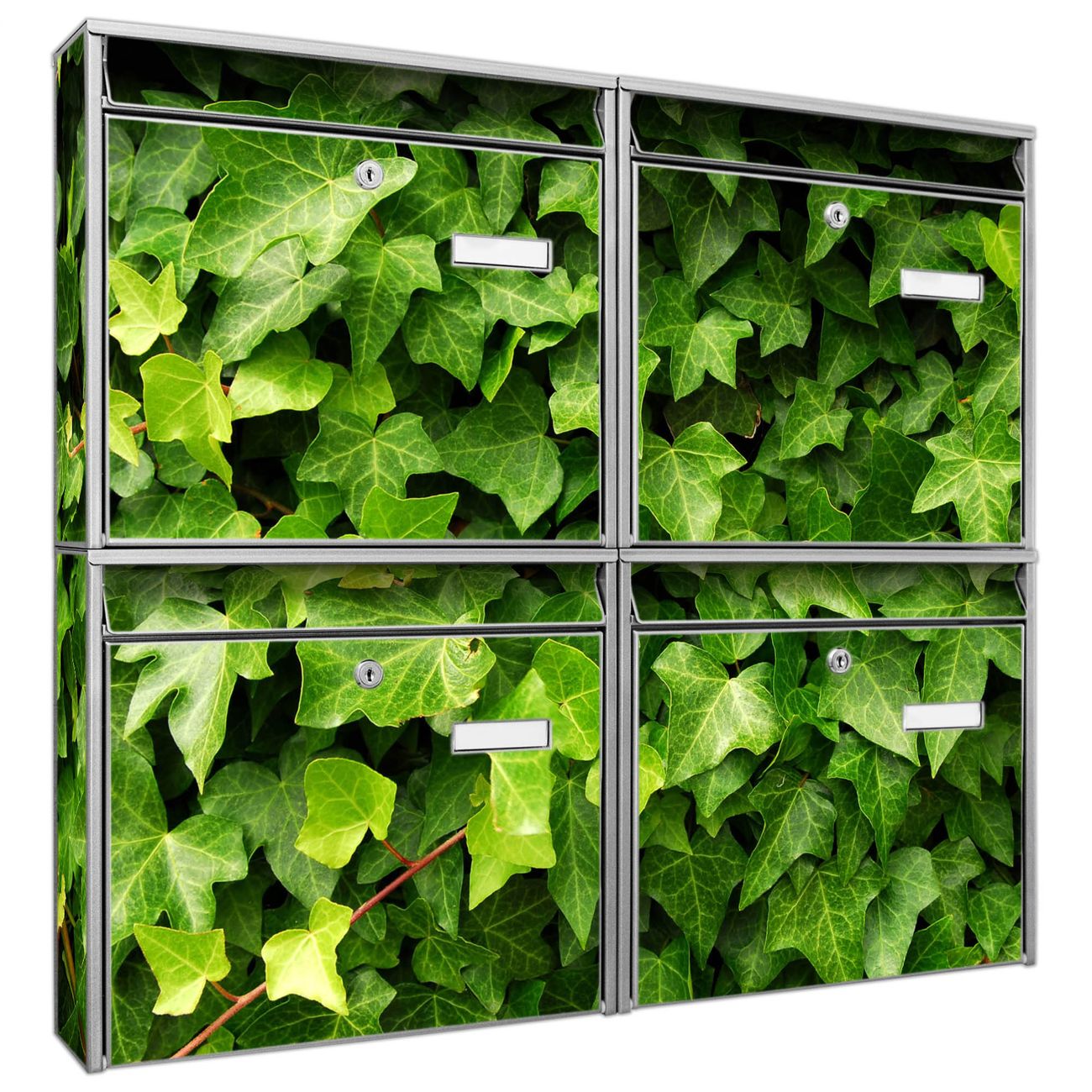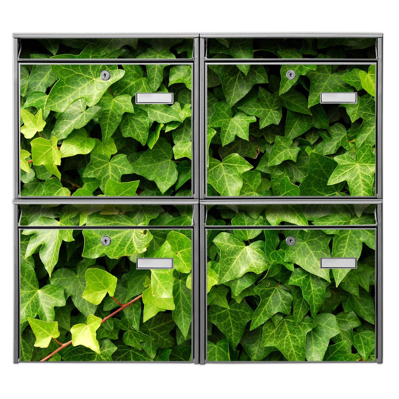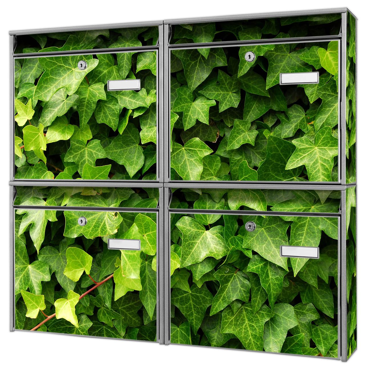 FUNKTION: Die Burg-Wächter Briefkastenanlage mit Motiv Efeu bietet Ihnen ausreichend Fassungsvermögen um auch A4 und C4 Sendungen zu empfangen. Das integrierte Namensschild lässt sich individuell beschriften. Wählen Sie aus den Grundfarben weiß, silber und schwarz. DESIGN: Die 4 Briefkästen haben ein ansprechendes und zeitloses Design, ohne dabei auf Funktionalität zu verzichten. Das Material ist sehr stabil, wetterfest und rostfrei. Durch das Motiv Efeu werden die Postkästen zu einem Blickfang. DETAILS: Die Postkästen bestehen aus verzinktem Stahl der zusätzlich mit Klarlack versiegelt wurde. Die Kästen sind gesamt 64,5cm hoch, 72,5cm breit und 10cm tief. Das Motiv besteht aus einer wetter- und UV-festen Folie, die Ihren Briefkasten zusätzlich vor Kratzern schützt. Die Postkästen werden mit Montagematerial, je einem Namensschild und je zwei Schlüsseln geliefert. NUTZEN: Das Briefkastenset eignet sich für die Wandmontage, die Größe bietet genügend Platz für Sendungen aller Art. Das zeitlose Design sowie die stabile Bauart bieten Ihnen einen treuen Begleiter für Ihre Post. BANJADO: