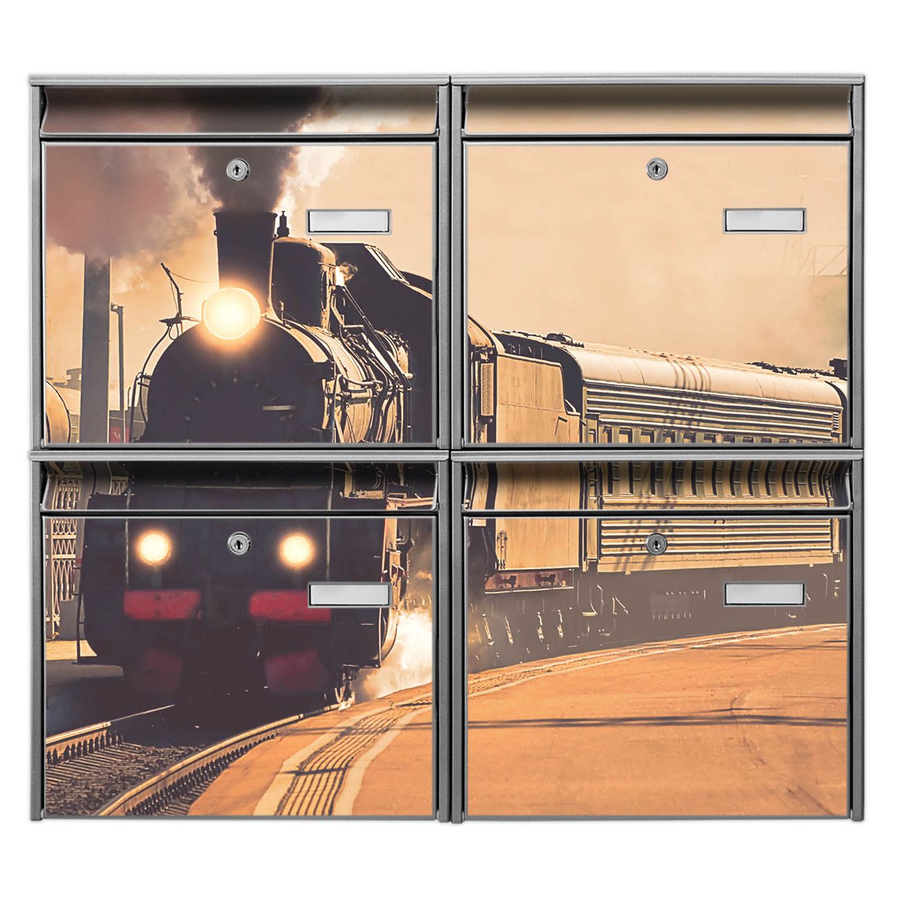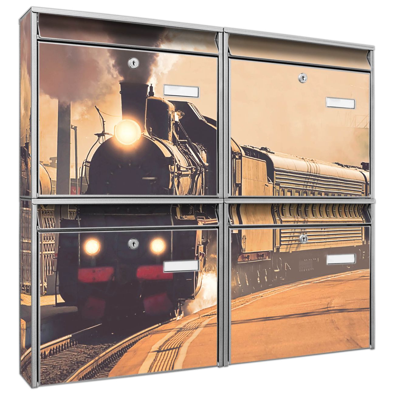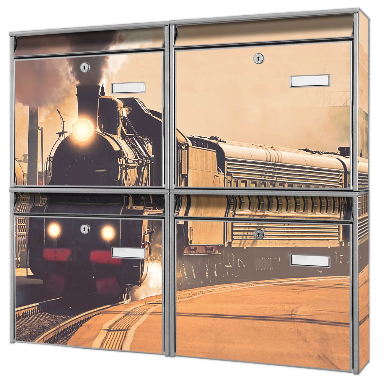 FUNKTION: Die Burg-Wächter Briefkastenanlage mit Motiv Einfahrender Zug bietet Ihnen ausreichend Fassungsvermögen um auch A4 und C4 Sendungen zu empfangen. Das integrierte Namensschild lässt sich individuell beschriften. Wählen Sie aus den Grundfarben weiß, silber und schwarz. DESIGN: Die 4 Briefkästen haben ein ansprechendes und zeitloses Design, ohne dabei auf Funktionalität zu verzichten. Das Material ist sehr stabil, wetterfest und rostfrei. Durch das Motiv Einfahrender Zug werden die Postkästen zu einem Blickfang. DETAILS: Die Postkästen bestehen aus verzinktem Stahl der zusätzlich mit Klarlack versiegelt wurde. Die Kästen sind gesamt 64,5cm hoch, 72,5cm breit und 10cm tief. Das Motiv besteht aus einer wetter- und UV-festen Folie, die Ihren Briefkasten zusätzlich vor Kratzern schützt. Die Postkästen werden mit Montagematerial, je einem Namensschild und je zwei Schlüsseln geliefert. NUTZEN: Das Briefkastenset eignet sich für die Wandmontage, die Größe bietet genügend Platz für Sendungen aller Art. Das zeitlose Design sowie die stabile Bauart bieten Ihnen einen treuen Begleiter für Ihre Post. BANJADO: