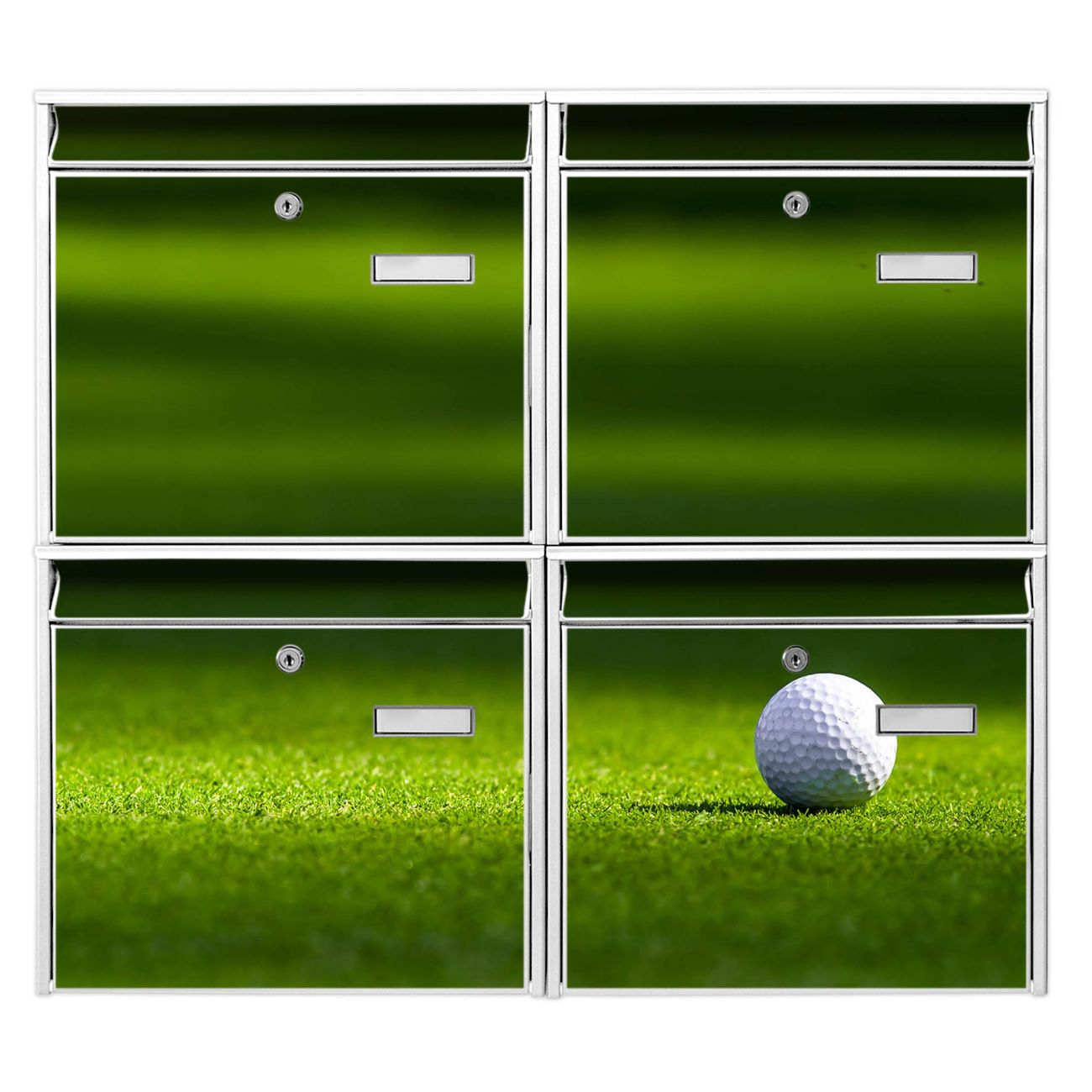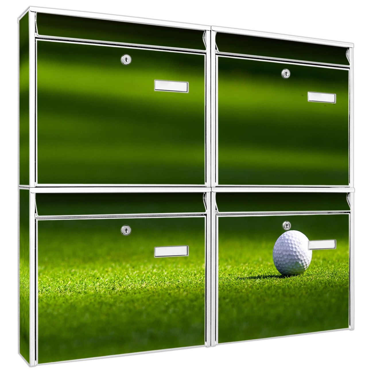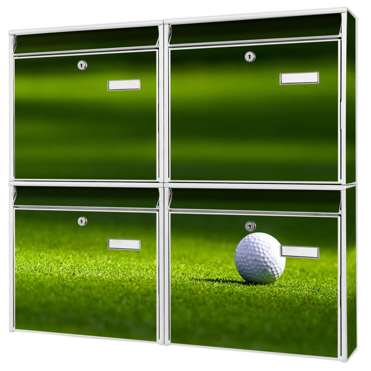 FUNKTION: Die Burg-Wächter Briefkastenanlage mit Motiv Einsamer Golfball bietet Ihnen ausreichend Fassungsvermögen um auch A4 und C4 Sendungen zu empfangen. Das integrierte Namensschild lässt sich individuell beschriften. Wählen Sie aus den Grundfarben weiß, silber und schwarz. DESIGN: Die 4 Briefkästen haben ein ansprechendes und zeitloses Design, ohne dabei auf Funktionalität zu verzichten. Das Material ist sehr stabil, wetterfest und rostfrei. Durch das Motiv Einsamer Golfball werden die Postkästen zu einem Blickfang. DETAILS: Die Postkästen bestehen aus verzinktem Stahl der zusätzlich mit Klarlack versiegelt wurde. Die Kästen sind gesamt 64,5cm hoch, 72,5cm breit und 10cm tief. Das Motiv besteht aus einer wetter- und UV-festen Folie, die Ihren Briefkasten zusätzlich vor Kratzern schützt. Die Postkästen werden mit Montagematerial, je einem Namensschild und je zwei Schlüsseln geliefert. NUTZEN: Das Briefkastenset eignet sich für die Wandmontage, die Größe bietet genügend Platz für Sendungen aller Art. Das zeitlose Design sowie die stabile Bauart bieten Ihnen einen treuen Begleiter für Ihre Post. BANJADO: