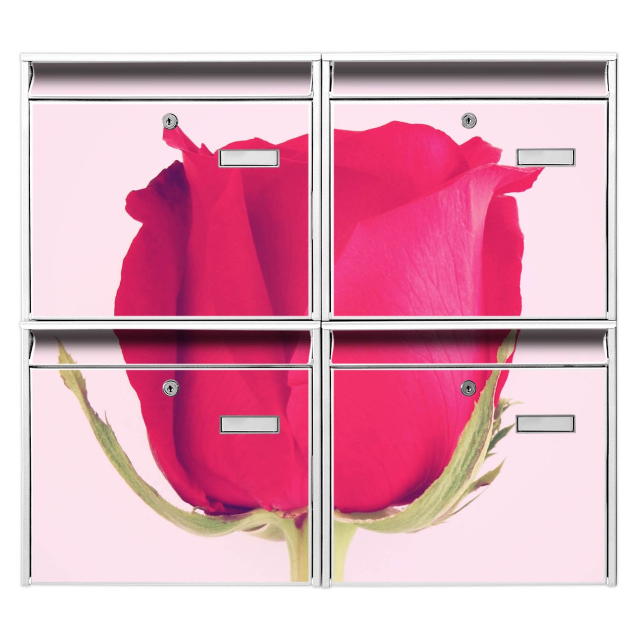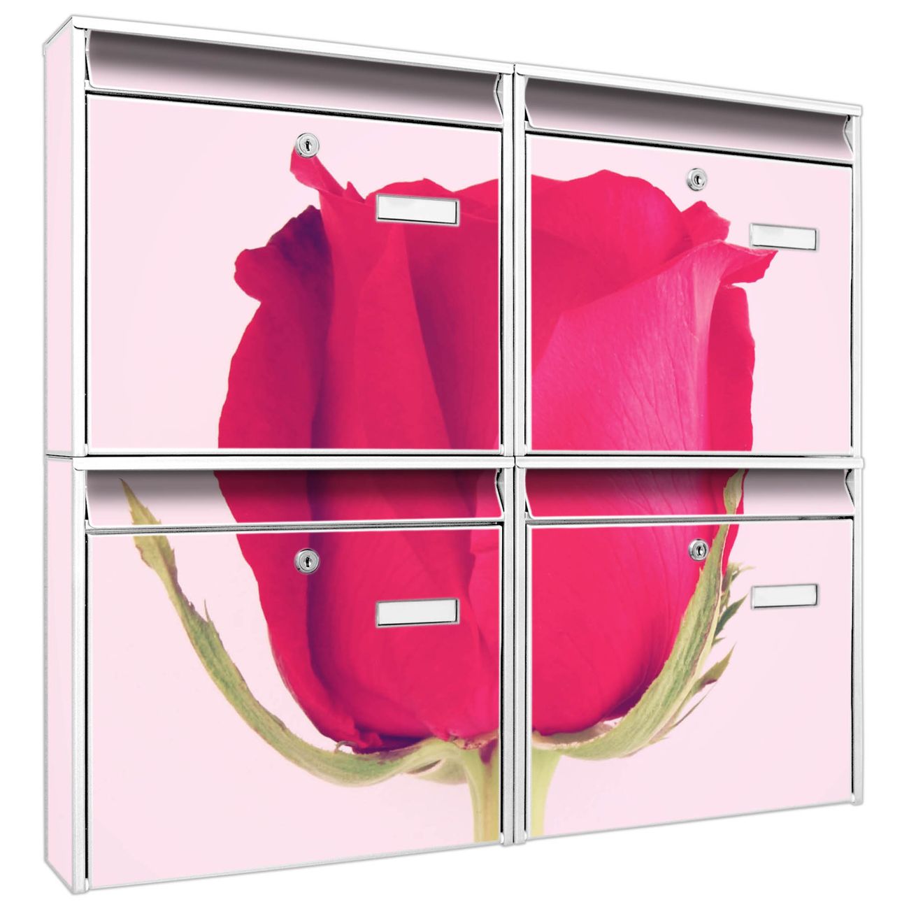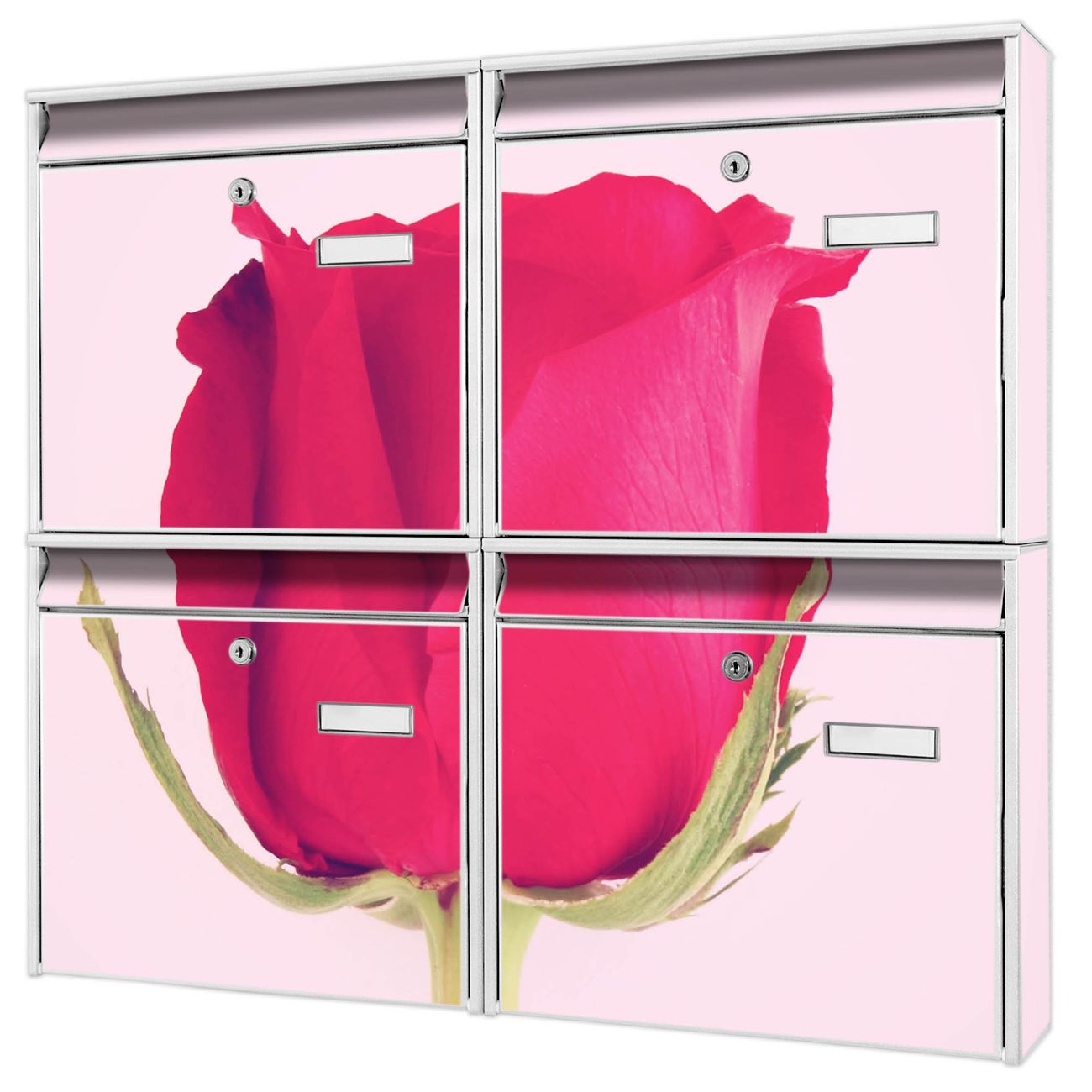 FUNKTION: Die Burg-Wächter Briefkastenanlage mit Motiv Einzelne Rose bietet Ihnen ausreichend Fassungsvermögen um auch A4 und C4 Sendungen zu empfangen. Das integrierte Namensschild lässt sich individuell beschriften. Wählen Sie aus den Grundfarben weiß, silber und schwarz. DESIGN: Die 4 Briefkästen haben ein ansprechendes und zeitloses Design, ohne dabei auf Funktionalität zu verzichten. Das Material ist sehr stabil, wetterfest und rostfrei. Durch das Motiv Einzelne Rose werden die Postkästen zu einem Blickfang. DETAILS: Die Postkästen bestehen aus verzinktem Stahl der zusätzlich mit Klarlack versiegelt wurde. Die Kästen sind gesamt 64,5cm hoch, 72,5cm breit und 10cm tief. Das Motiv besteht aus einer wetter- und UV-festen Folie, die Ihren Briefkasten zusätzlich vor Kratzern schützt. Die Postkästen werden mit Montagematerial, je einem Namensschild und je zwei Schlüsseln geliefert. NUTZEN: Das Briefkastenset eignet sich für die Wandmontage, die Größe bietet genügend Platz für Sendungen aller Art. Das zeitlose Design sowie die stabile Bauart bieten Ihnen einen treuen Begleiter für Ihre Post. BANJADO: