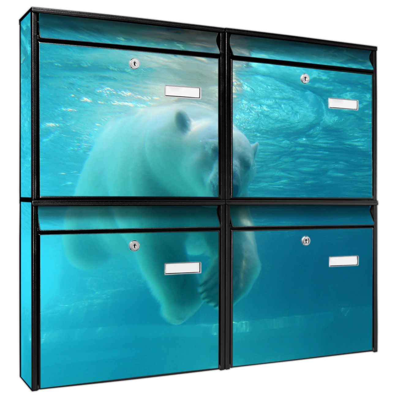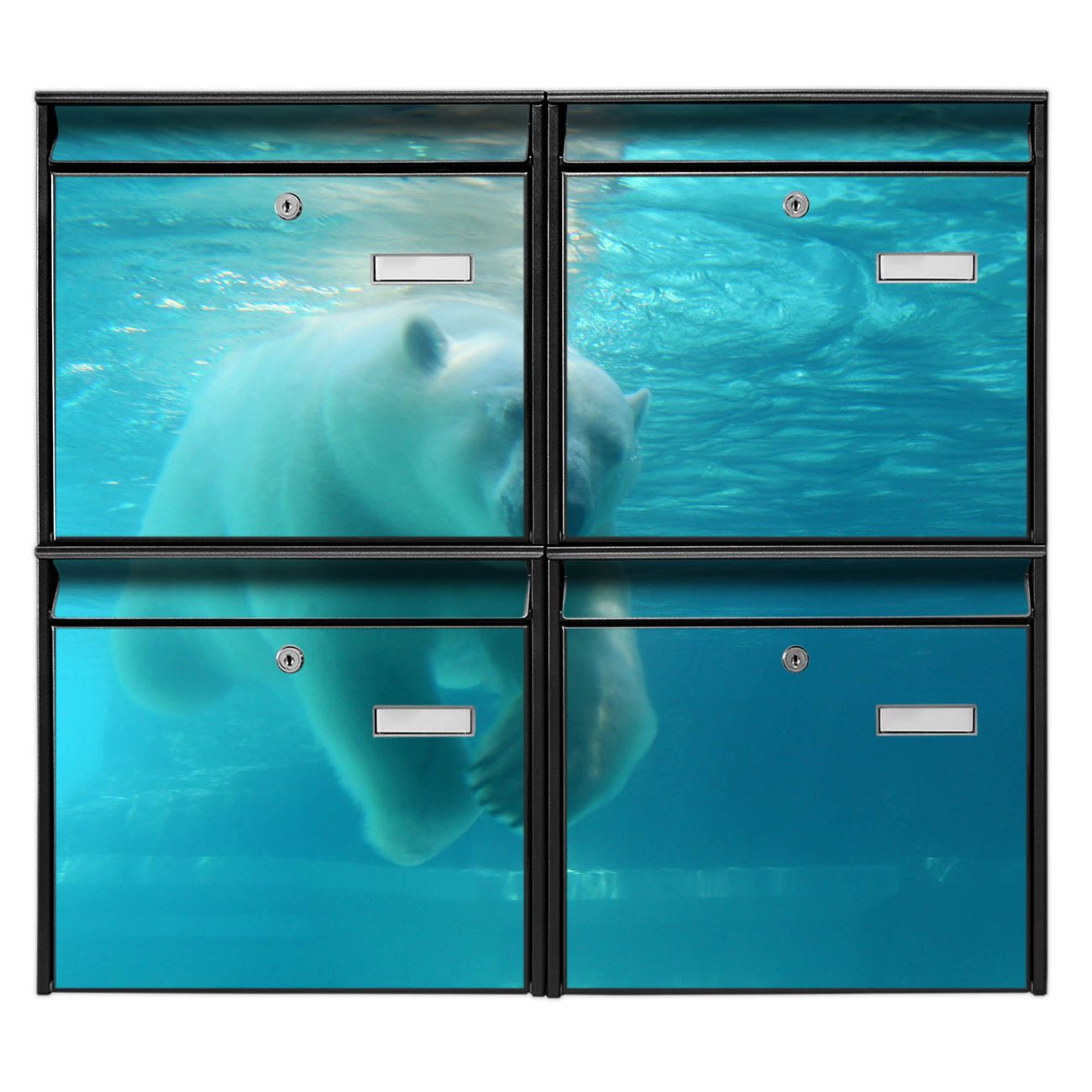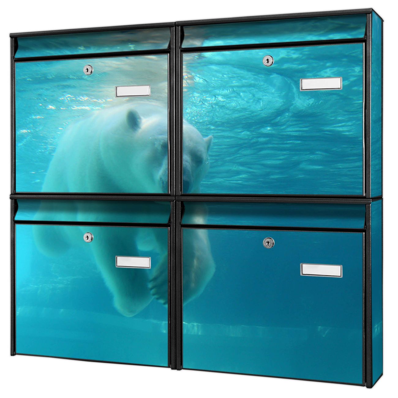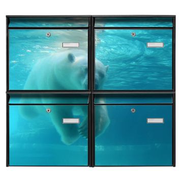 FUNKTION: Die Burg-Wächter Briefkastenanlage mit Motiv Eisbär unter Wasser bietet Ihnen ausreichend Fassungsvermögen um auch A4 und C4 Sendungen zu empfangen. Das integrierte Namensschild lässt sich individuell beschriften. Wählen Sie aus den Grundfarben weiß, silber und schwarz. DESIGN: Die 4 Briefkästen haben ein ansprechendes und zeitloses Design, ohne dabei auf Funktionalität zu verzichten. Das Material ist sehr stabil, wetterfest und rostfrei. Durch das Motiv Eisbär unter Wasser werden die Postkästen zu einem Blickfang. DETAILS: Die Postkästen bestehen aus verzinktem Stahl der zusätzlich mit Klarlack versiegelt wurde. Die Kästen sind gesamt 64,5cm hoch, 72,5cm breit und 10cm tief. Das Motiv besteht aus einer wetter- und UV-festen Folie, die Ihren Briefkasten zusätzlich vor Kratzern schützt. Die Postkästen werden mit Montagematerial, je einem Namensschild und je zwei Schlüsseln geliefert. NUTZEN: Das Briefkastenset eignet sich für die Wandmontage, die Größe bietet genügend Platz für Sendungen aller Art. Das zeitlose Design sowie die stabile Bauart bieten Ihnen einen treuen Begleiter für Ihre Post. BANJADO: