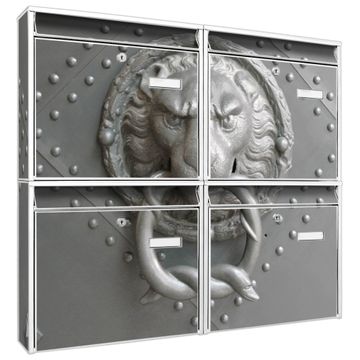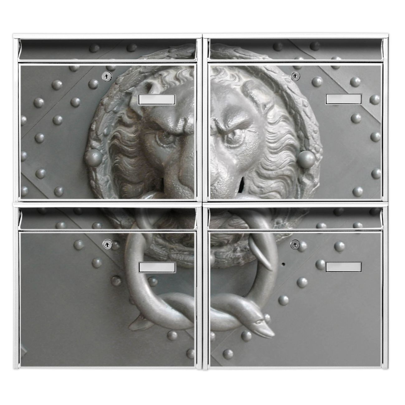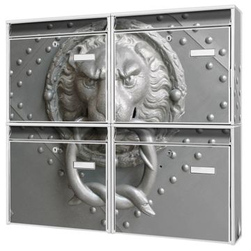 FUNKTION: Die Burg-Wächter Briefkastenanlage mit Motiv Eisentor bietet Ihnen ausreichend Fassungsvermögen um auch A4 und C4 Sendungen zu empfangen. Das integrierte Namensschild lässt sich individuell beschriften. Wählen Sie aus den Grundfarben weiß, silber und schwarz. DESIGN: Die 4 Briefkästen haben ein ansprechendes und zeitloses Design, ohne dabei auf Funktionalität zu verzichten. Das Material ist sehr stabil, wetterfest und rostfrei. Durch das Motiv Eisentor werden die Postkästen zu einem Blickfang. DETAILS: Die Postkästen bestehen aus verzinktem Stahl der zusätzlich mit Klarlack versiegelt wurde. Die Kästen sind gesamt 64,5cm hoch, 72,5cm breit und 10cm tief. Das Motiv besteht aus einer wetter- und UV-festen Folie, die Ihren Briefkasten zusätzlich vor Kratzern schützt. Die Postkästen werden mit Montagematerial, je einem Namensschild und je zwei Schlüsseln geliefert. NUTZEN: Das Briefkastenset eignet sich für die Wandmontage, die Größe bietet genügend Platz für Sendungen aller Art. Das zeitlose Design sowie die stabile Bauart bieten Ihnen einen treuen Begleiter für Ihre Post. BANJADO: