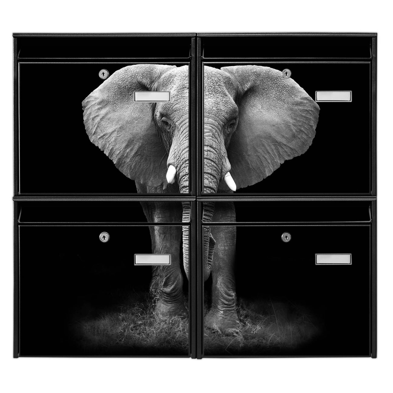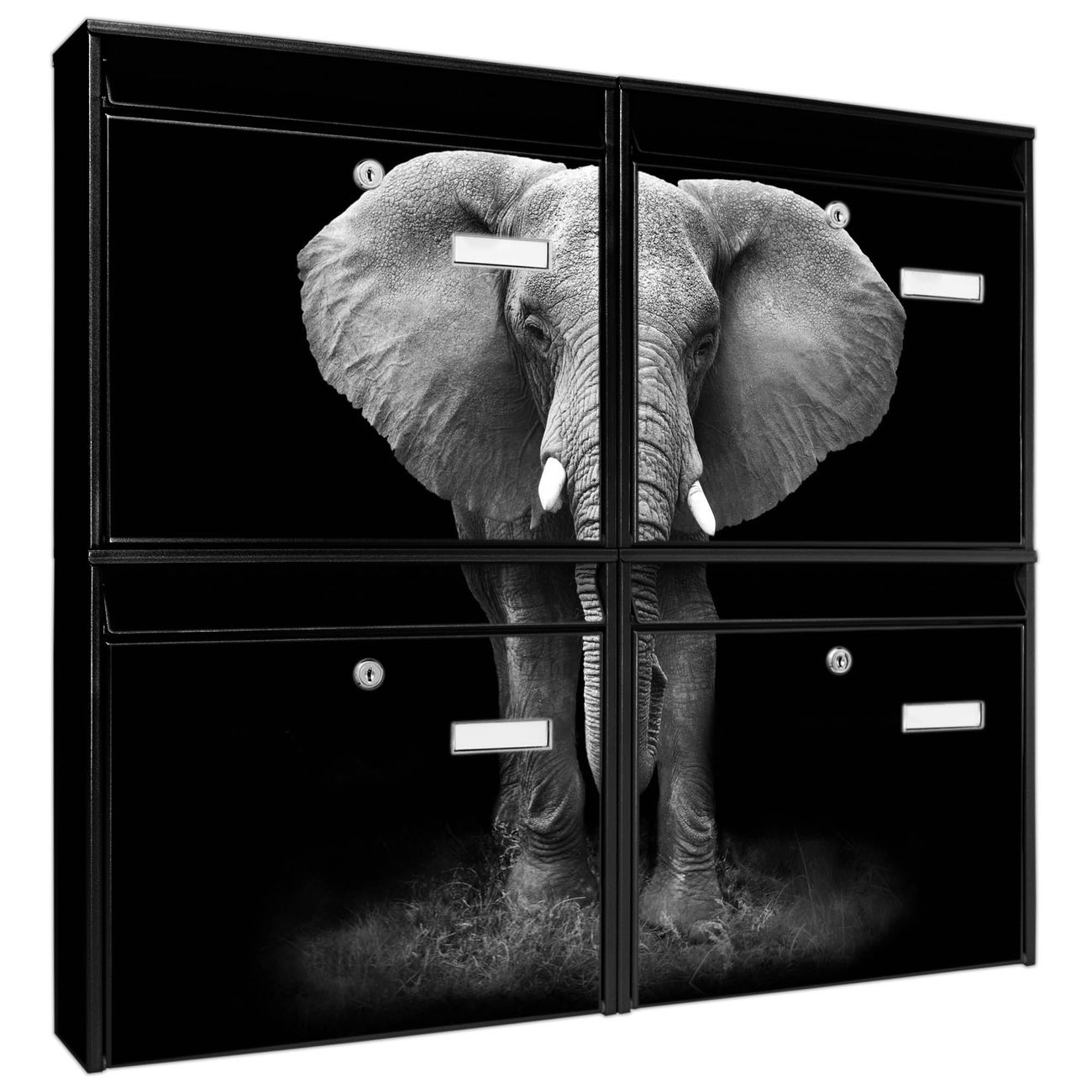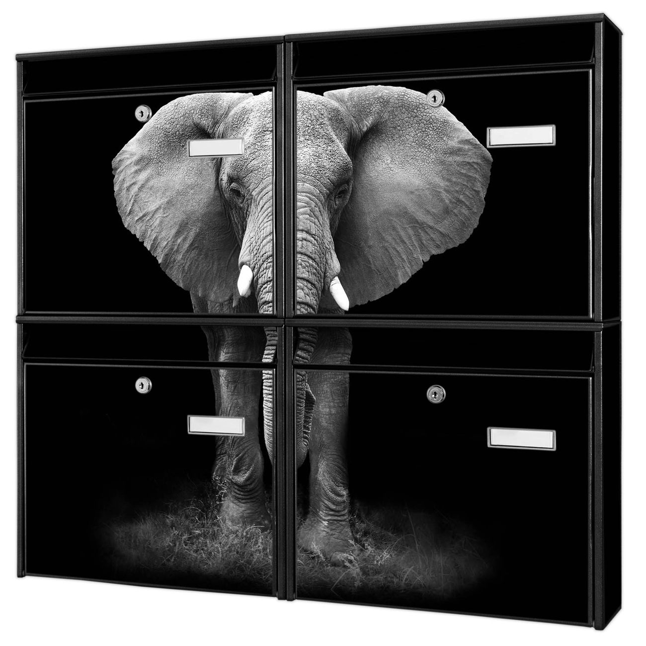 FUNKTION: Die Burg-Wächter Briefkastenanlage mit Motiv Ella bietet Ihnen ausreichend Fassungsvermögen um auch A4 und C4 Sendungen zu empfangen. Das integrierte Namensschild lässt sich individuell beschriften. Wählen Sie aus den Grundfarben weiß, silber und schwarz. DESIGN: Die 4 Briefkästen haben ein ansprechendes und zeitloses Design, ohne dabei auf Funktionalität zu verzichten. Das Material ist sehr stabil, wetterfest und rostfrei. Durch das Motiv Ella werden die Postkästen zu einem Blickfang. DETAILS: Die Postkästen bestehen aus verzinktem Stahl der zusätzlich mit Klarlack versiegelt wurde. Die Kästen sind gesamt 64,5cm hoch, 72,5cm breit und 10cm tief. Das Motiv besteht aus einer wetter- und UV-festen Folie, die Ihren Briefkasten zusätzlich vor Kratzern schützt. Die Postkästen werden mit Montagematerial, je einem Namensschild und je zwei Schlüsseln geliefert. NUTZEN: Das Briefkastenset eignet sich für die Wandmontage, die Größe bietet genügend Platz für Sendungen aller Art. Das zeitlose Design sowie die stabile Bauart bieten Ihnen einen treuen Begleiter für Ihre Post. BANJADO:
