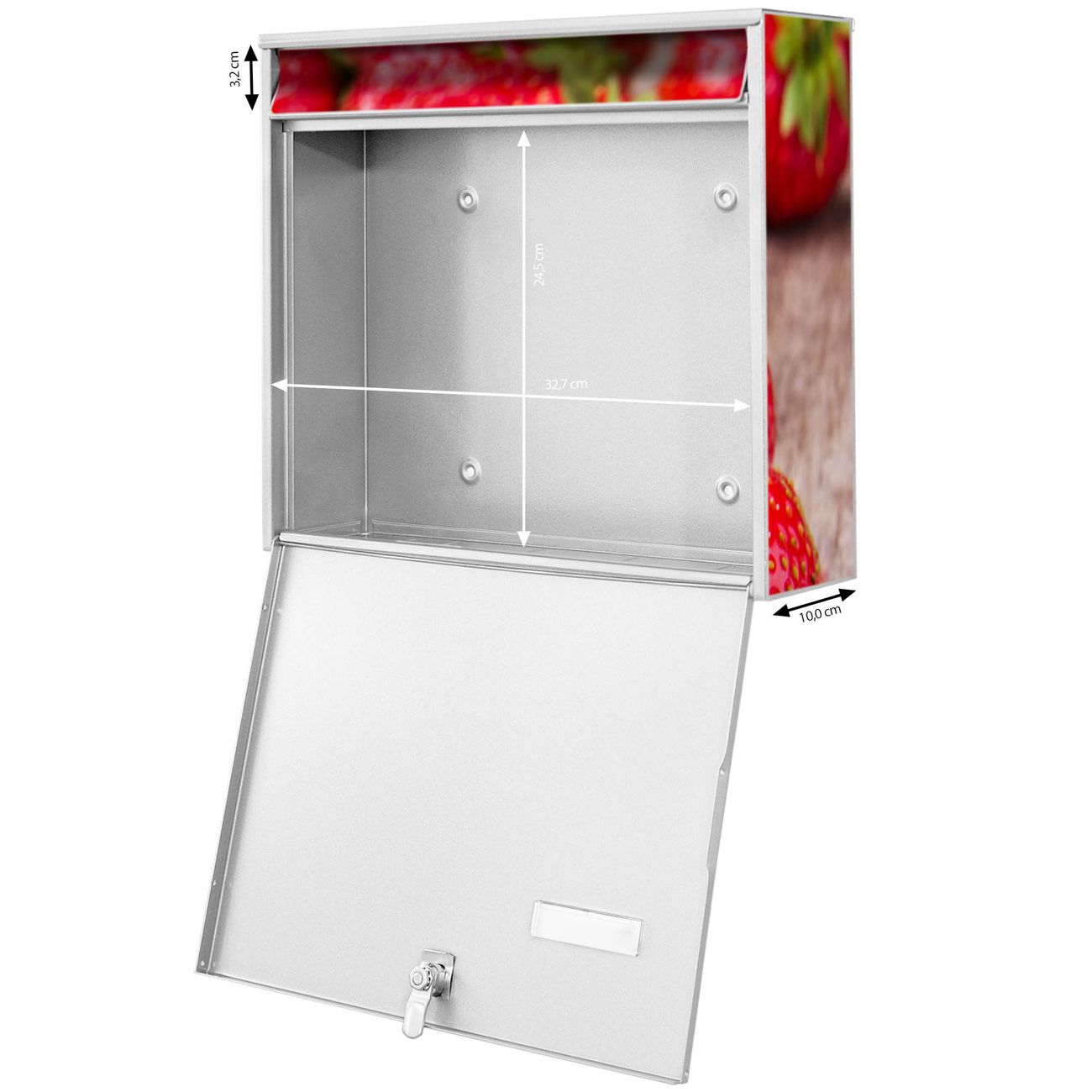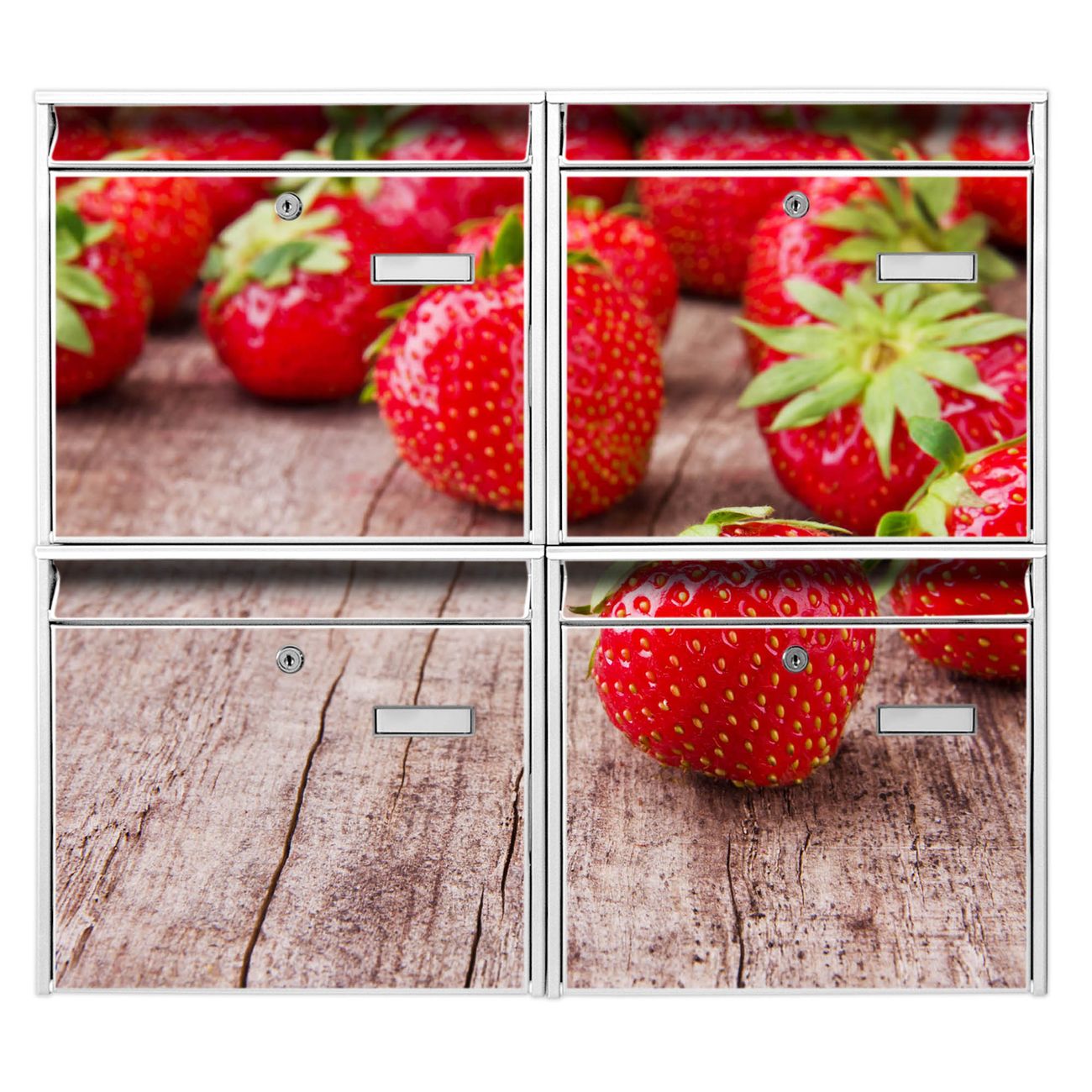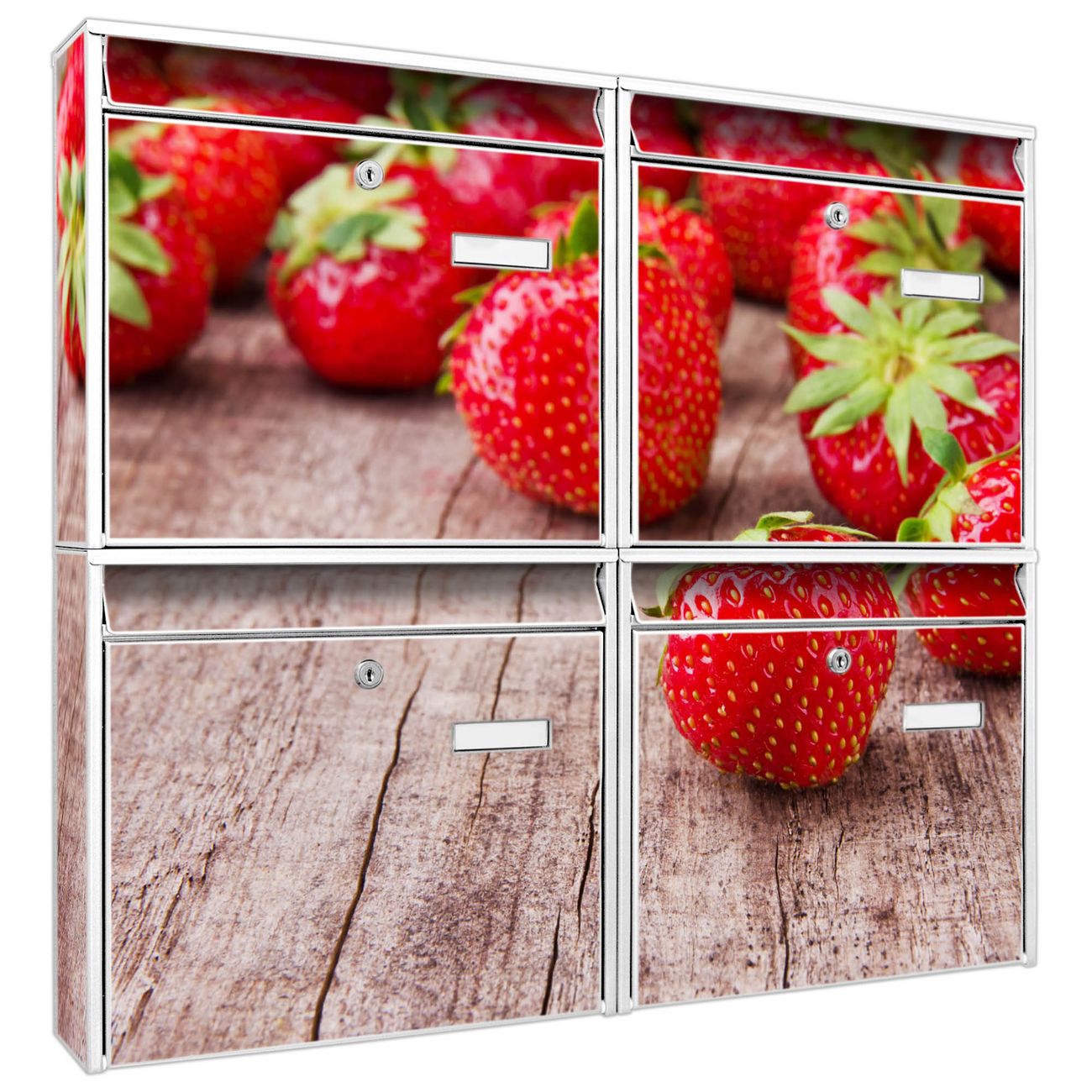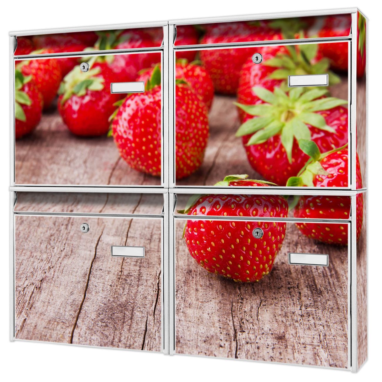 FUNKTION: Die Burg-Wächter Briefkastenanlage mit Motiv Erdbeeren bietet Ihnen ausreichend Fassungsvermögen um auch A4 und C4 Sendungen zu empfangen. Das integrierte Namensschild lässt sich individuell beschriften. Wählen Sie aus den Grundfarben weiß, silber und schwarz. DESIGN: Die 4 Briefkästen haben ein ansprechendes und zeitloses Design, ohne dabei auf Funktionalität zu verzichten. Das Material ist sehr stabil, wetterfest und rostfrei. Durch das Motiv Erdbeeren werden die Postkästen zu einem Blickfang. DETAILS: Die Postkästen bestehen aus verzinktem Stahl der zusätzlich mit Klarlack versiegelt wurde. Die Kästen sind gesamt 64,5cm hoch, 72,5cm breit und 10cm tief. Das Motiv besteht aus einer wetter- und UV-festen Folie, die Ihren Briefkasten zusätzlich vor Kratzern schützt. Die Postkästen werden mit Montagematerial, je einem Namensschild und je zwei Schlüsseln geliefert. NUTZEN: Das Briefkastenset eignet sich für die Wandmontage, die Größe bietet genügend Platz für Sendungen aller Art. Das zeitlose Design sowie die stabile Bauart bieten Ihnen einen treuen Begleiter für Ihre Post. BANJADO: