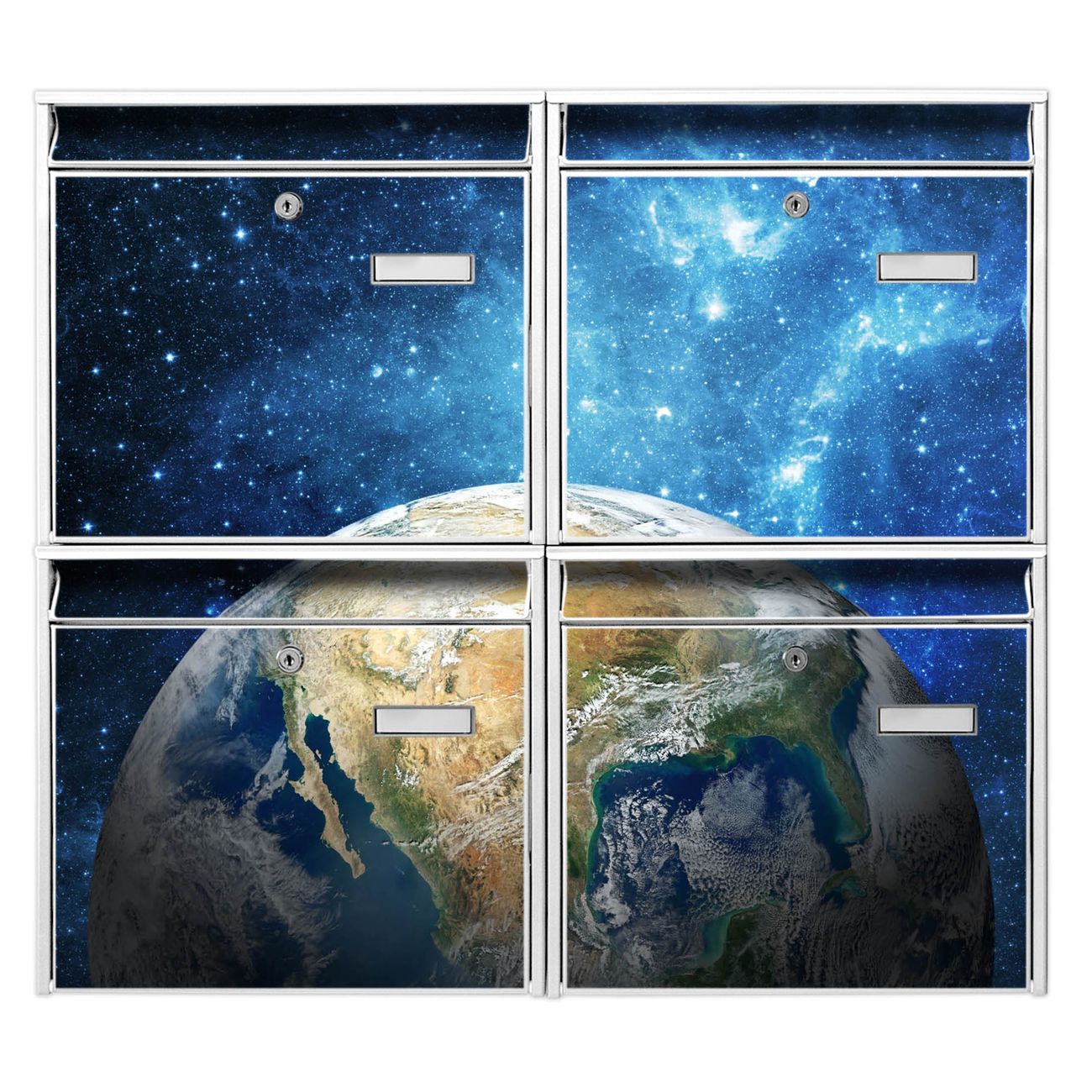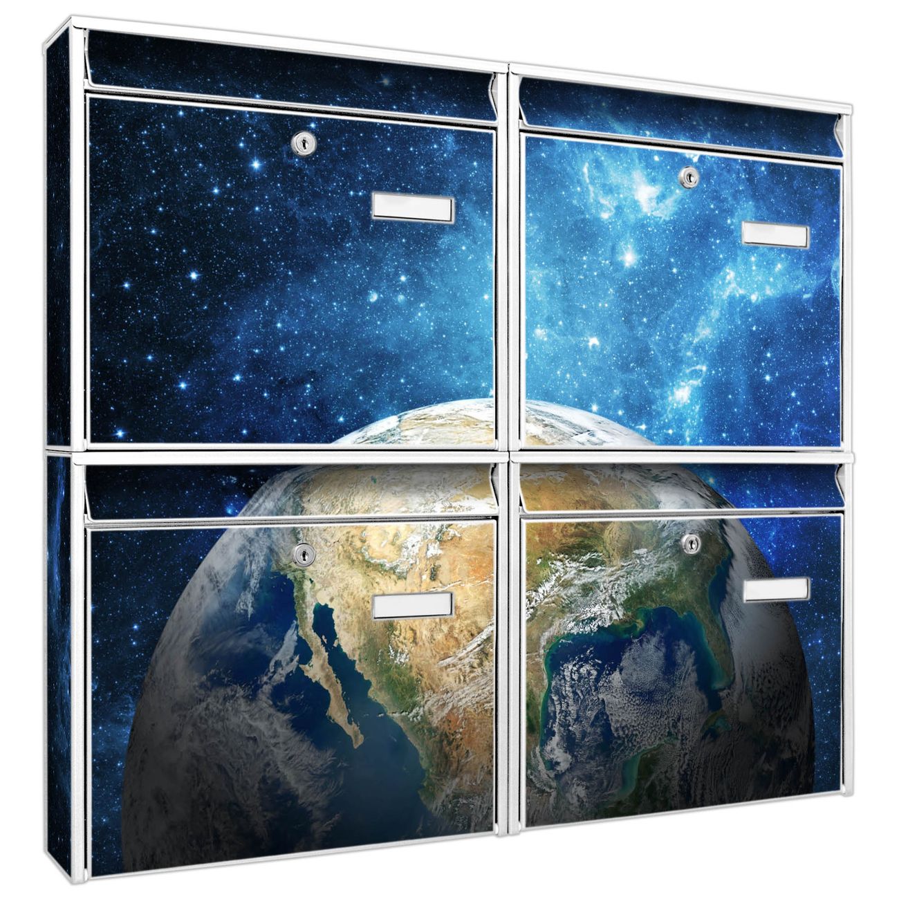 FUNKTION: Die Burg-Wächter Briefkastenanlage mit Motiv Erdkugel bietet Ihnen ausreichend Fassungsvermögen um auch A4 und C4 Sendungen zu empfangen. Das integrierte Namensschild lässt sich individuell beschriften. Wählen Sie aus den Grundfarben weiß, silber und schwarz. DESIGN: Die 4 Briefkästen haben ein ansprechendes und zeitloses Design, ohne dabei auf Funktionalität zu verzichten. Das Material ist sehr stabil, wetterfest und rostfrei. Durch das Motiv Erdkugel werden die Postkästen zu einem Blickfang. DETAILS: Die Postkästen bestehen aus verzinktem Stahl der zusätzlich mit Klarlack versiegelt wurde. Die Kästen sind gesamt 64,5cm hoch, 72,5cm breit und 10cm tief. Das Motiv besteht aus einer wetter- und UV-festen Folie, die Ihren Briefkasten zusätzlich vor Kratzern schützt. Die Postkästen werden mit Montagematerial, je einem Namensschild und je zwei Schlüsseln geliefert. NUTZEN: Das Briefkastenset eignet sich für die Wandmontage, die Größe bietet genügend Platz für Sendungen aller Art. Das zeitlose Design sowie die stabile Bauart bieten Ihnen einen treuen Begleiter für Ihre Post. BANJADO: