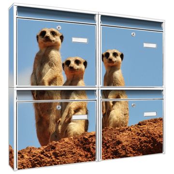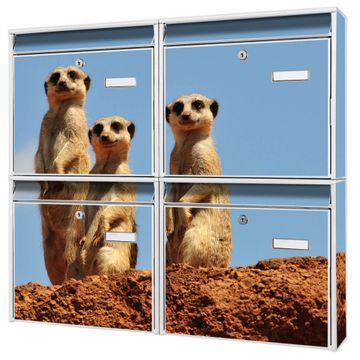 FUNKTION: Die Burg-Wächter Briefkastenanlage mit Motiv Erdmännchenfamilie bietet Ihnen ausreichend Fassungsvermögen um auch A4 und C4 Sendungen zu empfangen. Das integrierte Namensschild lässt sich individuell beschriften. Wählen Sie aus den Grundfarben weiß, silber und schwarz. DESIGN: Die 4 Briefkästen haben ein ansprechendes und zeitloses Design, ohne dabei auf Funktionalität zu verzichten. Das Material ist sehr stabil, wetterfest und rostfrei. Durch das Motiv Erdmännchenfamilie werden die Postkästen zu einem Blickfang. DETAILS: Die Postkästen bestehen aus verzinktem Stahl der zusätzlich mit Klarlack versiegelt wurde. Die Kästen sind gesamt 64,5cm hoch, 72,5cm breit und 10cm tief. Das Motiv besteht aus einer wetter- und UV-festen Folie, die Ihren Briefkasten zusätzlich vor Kratzern schützt. Die Postkästen werden mit Montagematerial, je einem Namensschild und je zwei Schlüsseln geliefert. NUTZEN: Das Briefkastenset eignet sich für die Wandmontage, die Größe bietet genügend Platz für Sendungen aller Art. Das zeitlose Design sowie die stabile Bauart bieten Ihnen einen treuen Begleiter für Ihre Post. BANJADO: