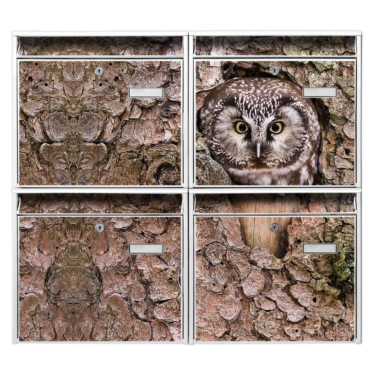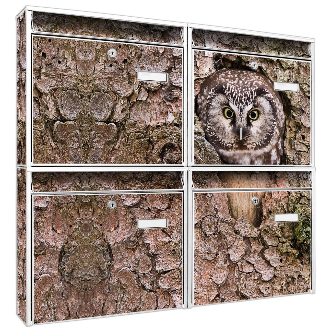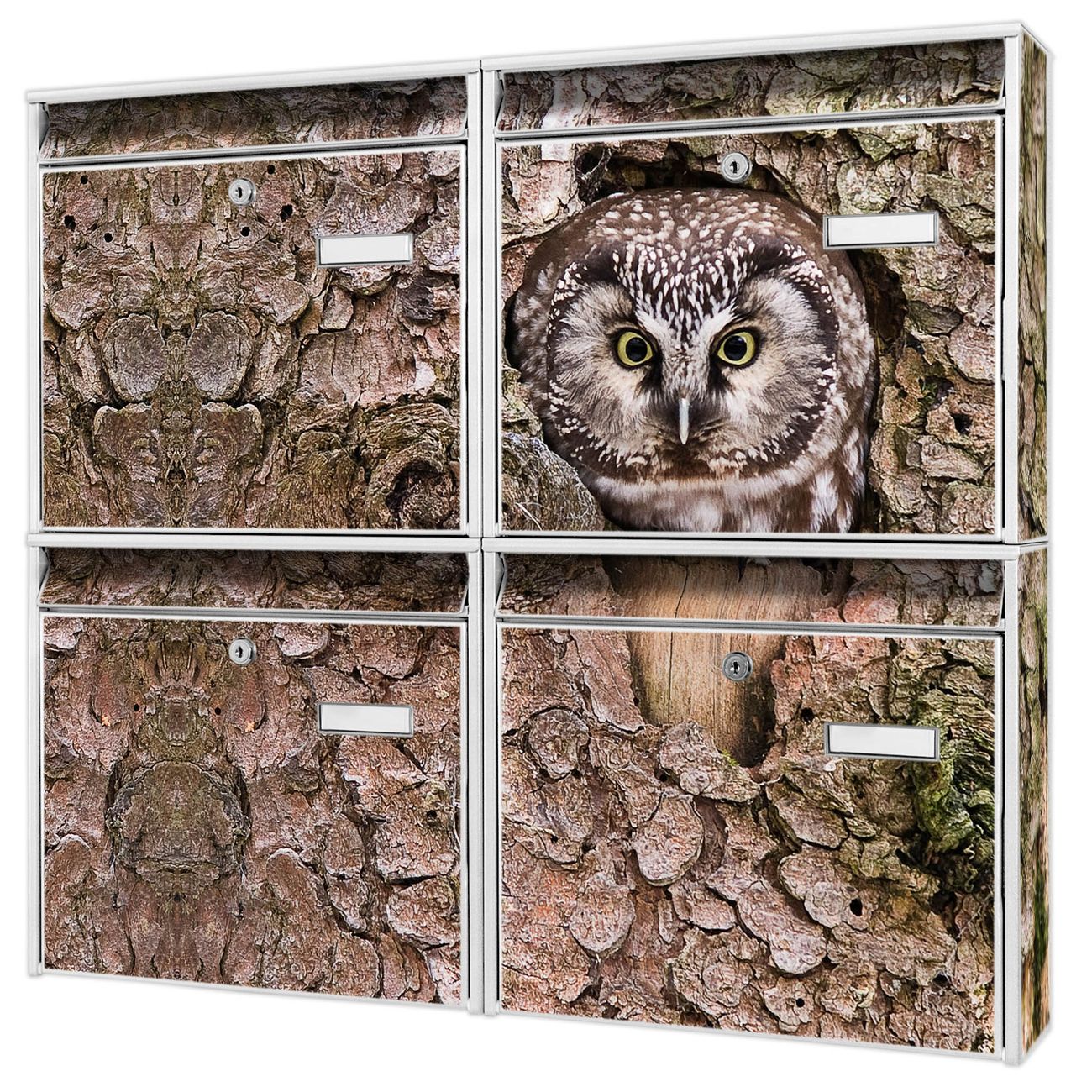 FUNKTION: Die Burg-Wächter Briefkastenanlage mit Motiv Eule bietet Ihnen ausreichend Fassungsvermögen um auch A4 und C4 Sendungen zu empfangen. Das integrierte Namensschild lässt sich individuell beschriften. Wählen Sie aus den Grundfarben weiß, silber und schwarz. DESIGN: Die 4 Briefkästen haben ein ansprechendes und zeitloses Design, ohne dabei auf Funktionalität zu verzichten. Das Material ist sehr stabil, wetterfest und rostfrei. Durch das Motiv Eule werden die Postkästen zu einem Blickfang. DETAILS: Die Postkästen bestehen aus verzinktem Stahl der zusätzlich mit Klarlack versiegelt wurde. Die Kästen sind gesamt 64,5cm hoch, 72,5cm breit und 10cm tief. Das Motiv besteht aus einer wetter- und UV-festen Folie, die Ihren Briefkasten zusätzlich vor Kratzern schützt. Die Postkästen werden mit Montagematerial, je einem Namensschild und je zwei Schlüsseln geliefert. NUTZEN: Das Briefkastenset eignet sich für die Wandmontage, die Größe bietet genügend Platz für Sendungen aller Art. Das zeitlose Design sowie die stabile Bauart bieten Ihnen einen treuen Begleiter für Ihre Post. BANJADO: