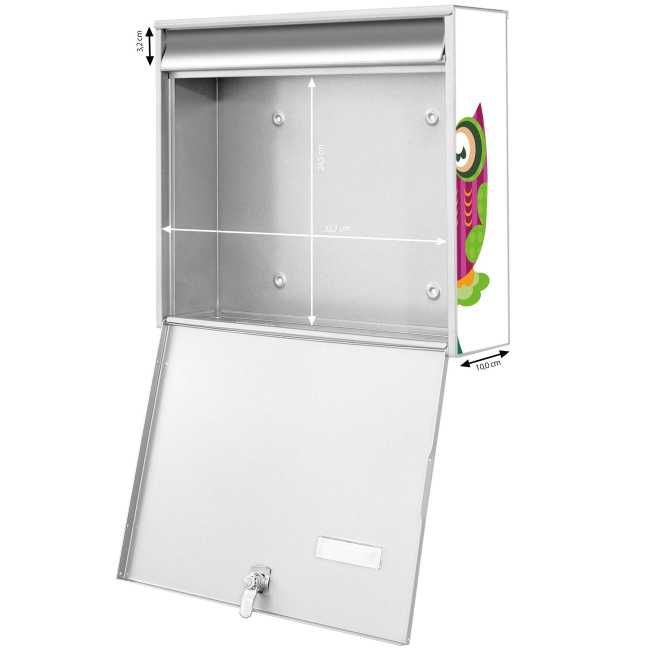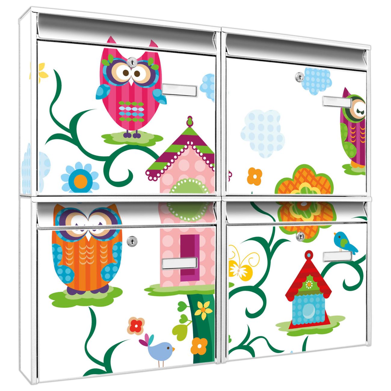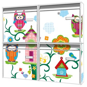 FUNKTION: Die Burg-Wächter Briefkastenanlage mit Motiv Eulenfamilie bietet Ihnen ausreichend Fassungsvermögen um auch A4 und C4 Sendungen zu empfangen. Das integrierte Namensschild lässt sich individuell beschriften. Wählen Sie aus den Grundfarben weiß, silber und schwarz. DESIGN: Die 4 Briefkästen haben ein ansprechendes und zeitloses Design, ohne dabei auf Funktionalität zu verzichten. Das Material ist sehr stabil, wetterfest und rostfrei. Durch das Motiv Eulenfamilie werden die Postkästen zu einem Blickfang. DETAILS: Die Postkästen bestehen aus verzinktem Stahl der zusätzlich mit Klarlack versiegelt wurde. Die Kästen sind gesamt 64,5cm hoch, 72,5cm breit und 10cm tief. Das Motiv besteht aus einer wetter- und UV-festen Folie, die Ihren Briefkasten zusätzlich vor Kratzern schützt. Die Postkästen werden mit Montagematerial, je einem Namensschild und je zwei Schlüsseln geliefert. NUTZEN: Das Briefkastenset eignet sich für die Wandmontage, die Größe bietet genügend Platz für Sendungen aller Art. Das zeitlose Design sowie die stabile Bauart bieten Ihnen einen treuen Begleiter für Ihre Post. BANJADO: