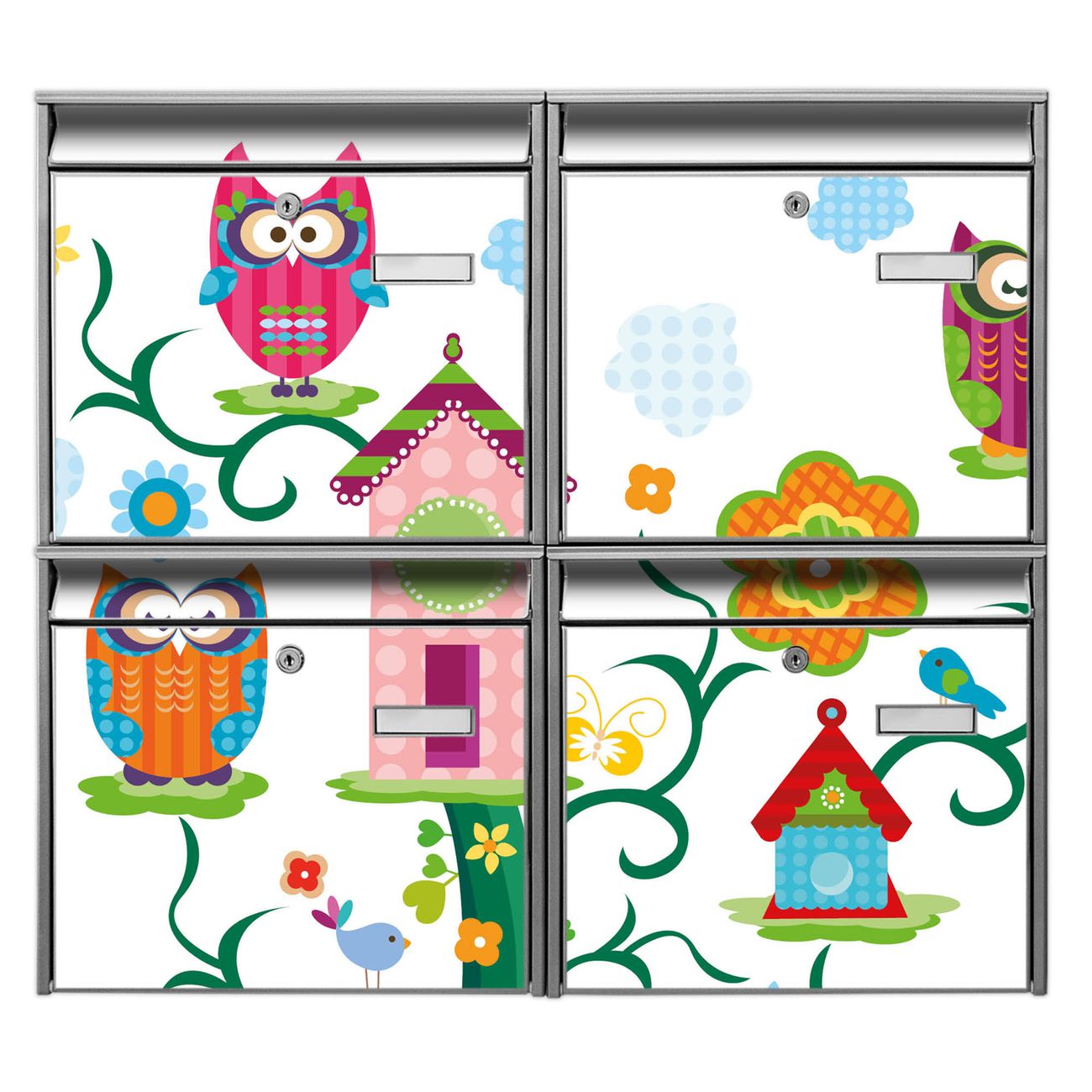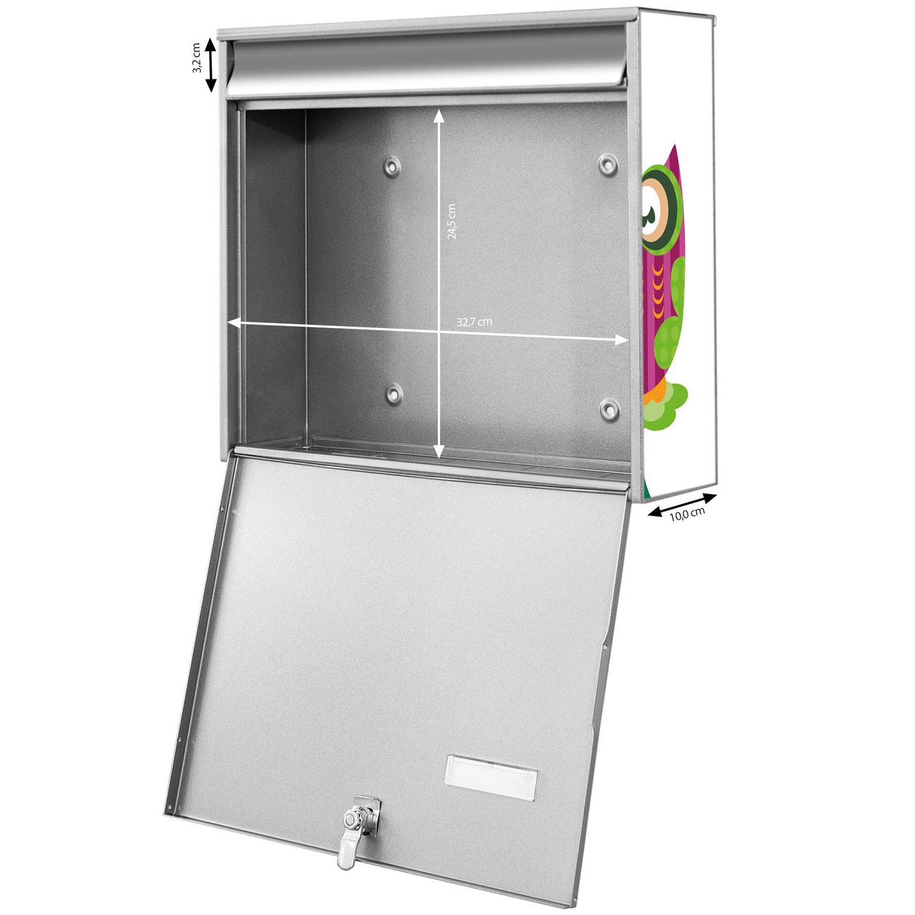 FUNKTION: Die Burg-Wächter Briefkastenanlage mit Motiv Eulenfamilie bietet Ihnen ausreichend Fassungsvermögen um auch A4 und C4 Sendungen zu empfangen. Das integrierte Namensschild lässt sich individuell beschriften. Wählen Sie aus den Grundfarben weiß, silber und schwarz. DESIGN: Die 4 Briefkästen haben ein ansprechendes und zeitloses Design, ohne dabei auf Funktionalität zu verzichten. Das Material ist sehr stabil, wetterfest und rostfrei. Durch das Motiv Eulenfamilie werden die Postkästen zu einem Blickfang. DETAILS: Die Postkästen bestehen aus verzinktem Stahl der zusätzlich mit Klarlack versiegelt wurde. Die Kästen sind gesamt 64,5cm hoch, 72,5cm breit und 10cm tief. Das Motiv besteht aus einer wetter- und UV-festen Folie, die Ihren Briefkasten zusätzlich vor Kratzern schützt. Die Postkästen werden mit Montagematerial, je einem Namensschild und je zwei Schlüsseln geliefert. NUTZEN: Das Briefkastenset eignet sich für die Wandmontage, die Größe bietet genügend Platz für Sendungen aller Art. Das zeitlose Design sowie die stabile Bauart bieten Ihnen einen treuen Begleiter für Ihre Post. BANJADO: