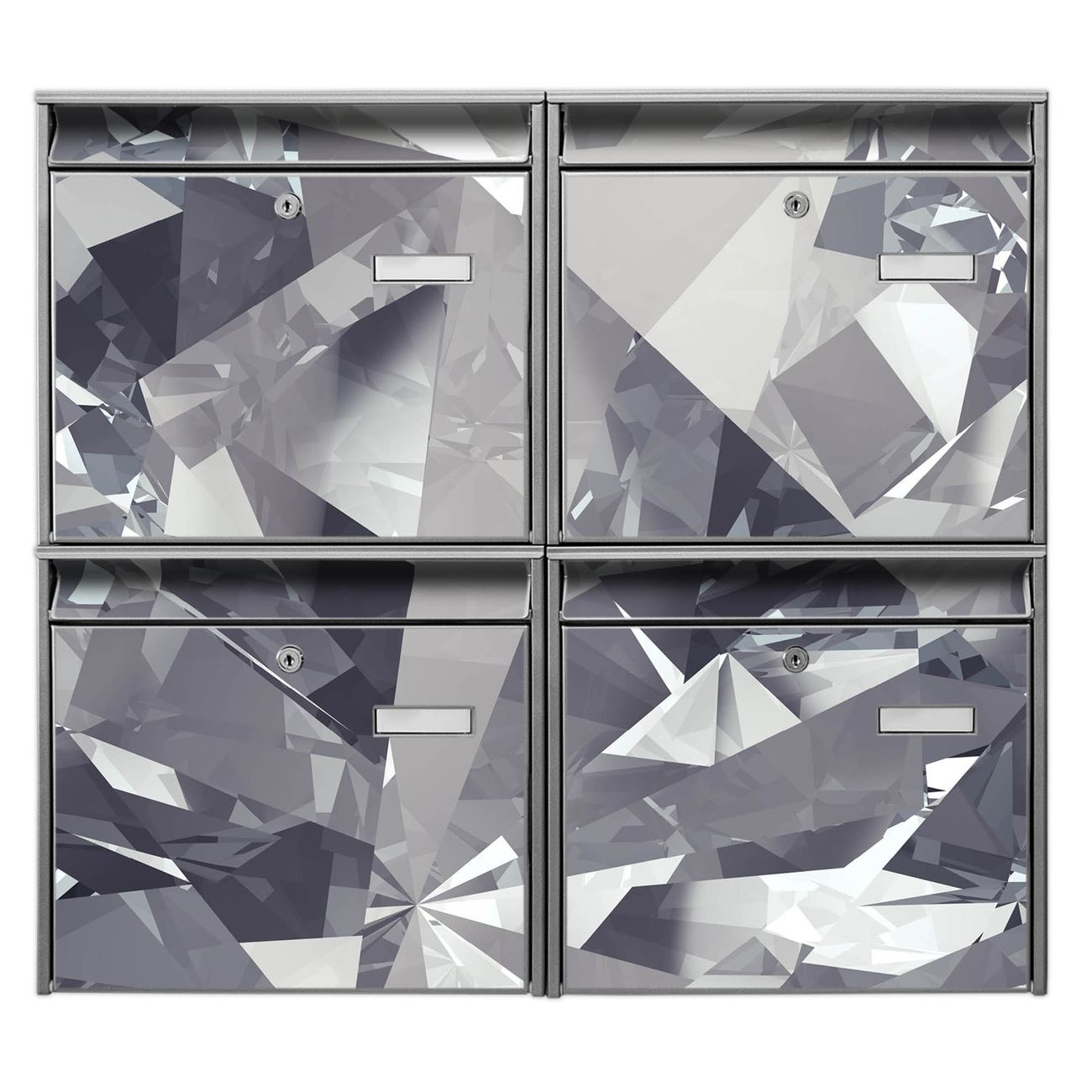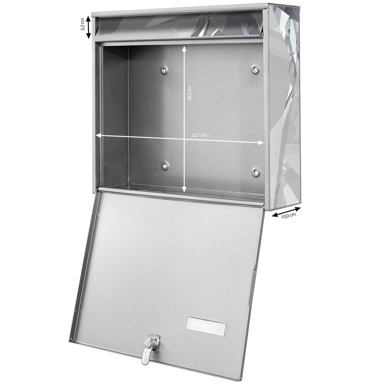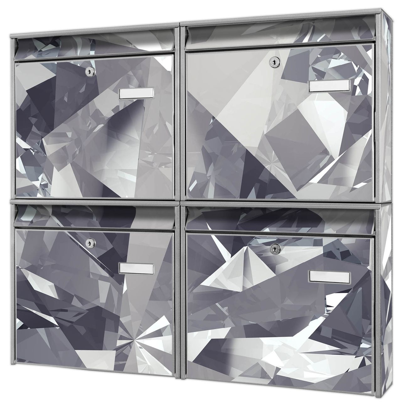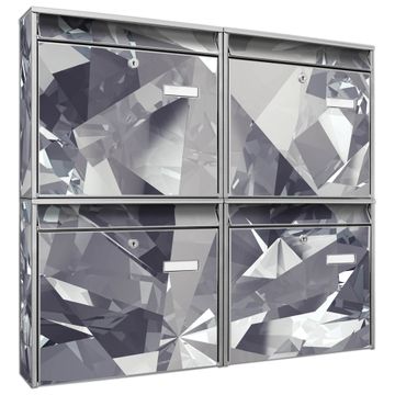 FUNKTION: Die Burg-Wächter Briefkastenanlage mit Motiv Facetten Monochrome bietet Ihnen ausreichend Fassungsvermögen um auch A4 und C4 Sendungen zu empfangen. Das integrierte Namensschild lässt sich individuell beschriften. Wählen Sie aus den Grundfarben weiß, silber und schwarz. DESIGN: Die 4 Briefkästen haben ein ansprechendes und zeitloses Design, ohne dabei auf Funktionalität zu verzichten. Das Material ist sehr stabil, wetterfest und rostfrei. Durch das Motiv Facetten Monochrome werden die Postkästen zu einem Blickfang. DETAILS: Die Postkästen bestehen aus verzinktem Stahl der zusätzlich mit Klarlack versiegelt wurde. Die Kästen sind gesamt 64,5cm hoch, 72,5cm breit und 10cm tief. Das Motiv besteht aus einer wetter- und UV-festen Folie, die Ihren Briefkasten zusätzlich vor Kratzern schützt. Die Postkästen werden mit Montagematerial, je einem Namensschild und je zwei Schlüsseln geliefert. NUTZEN: Das Briefkastenset eignet sich für die Wandmontage, die Größe bietet genügend Platz für Sendungen aller Art. Das zeitlose Design sowie die stabile Bauart bieten Ihnen einen treuen Begleiter für Ihre Post. BANJADO: