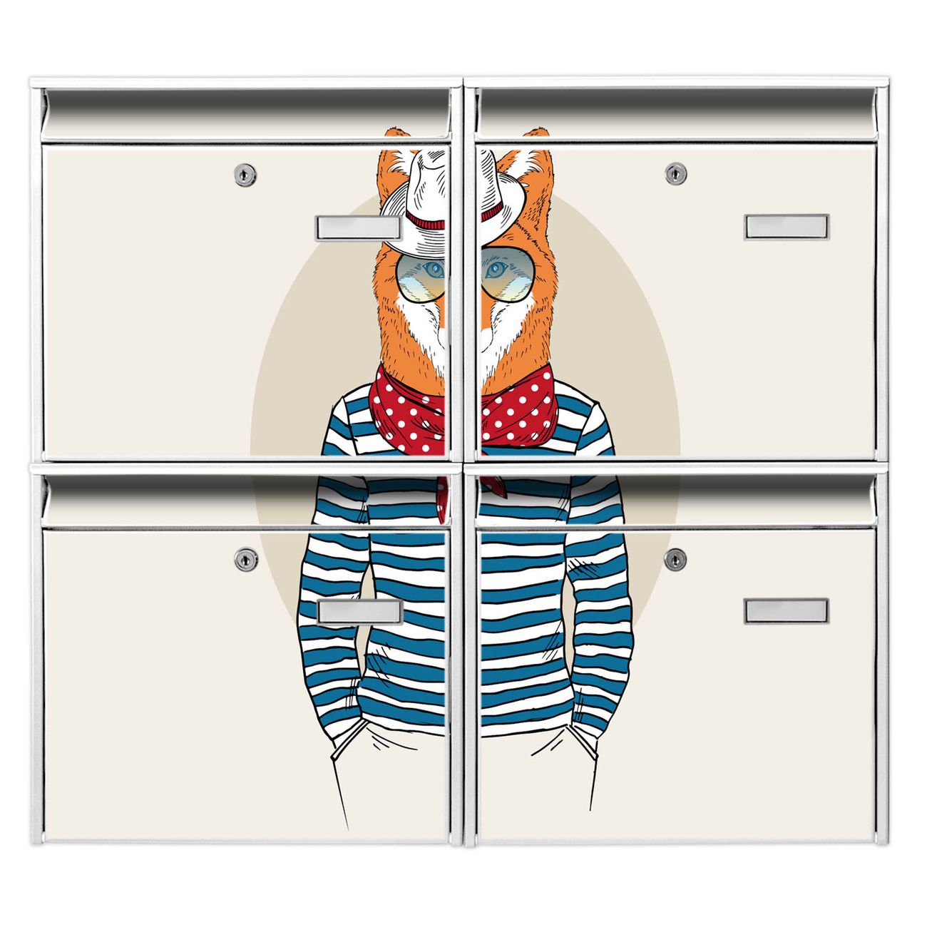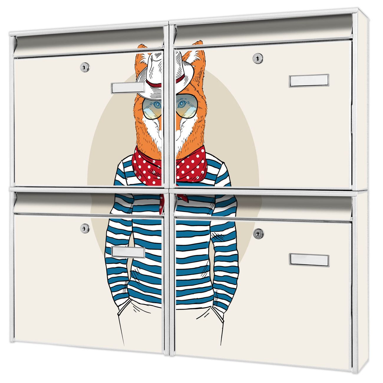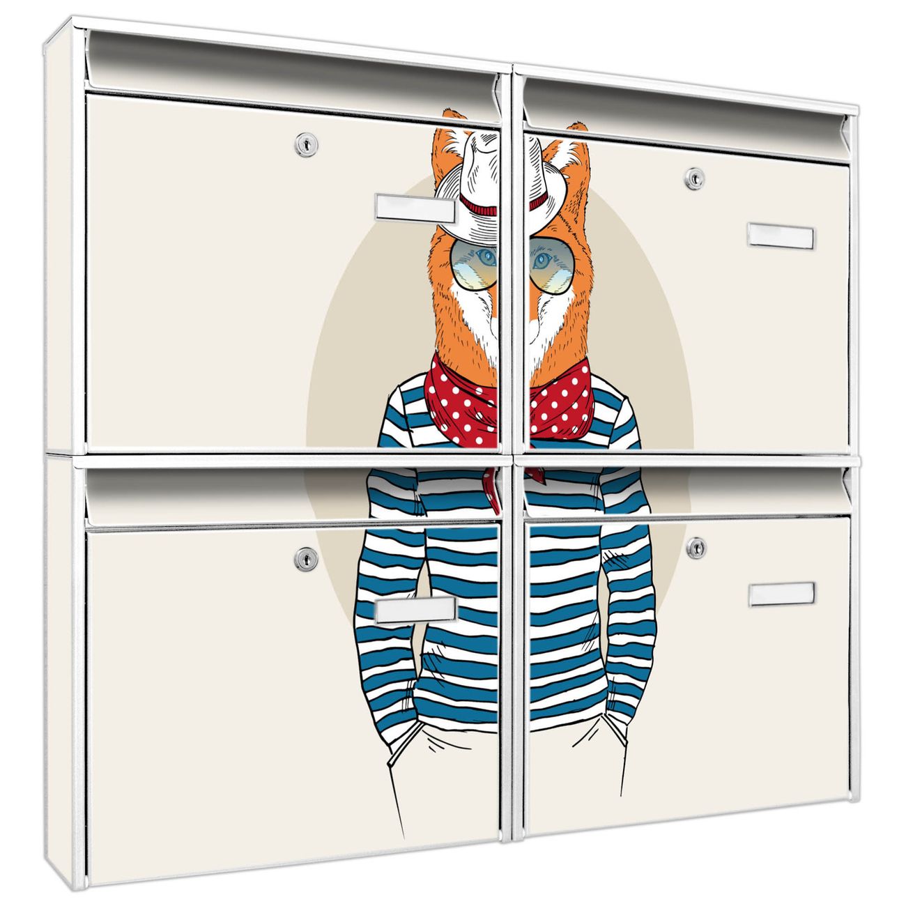 FUNKTION: Die Burg-Wächter Briefkastenanlage mit Motiv Fancy Fox bietet Ihnen ausreichend Fassungsvermögen um auch A4 und C4 Sendungen zu empfangen. Das integrierte Namensschild lässt sich individuell beschriften. Wählen Sie aus den Grundfarben weiß, silber und schwarz. DESIGN: Die 4 Briefkästen haben ein ansprechendes und zeitloses Design, ohne dabei auf Funktionalität zu verzichten. Das Material ist sehr stabil, wetterfest und rostfrei. Durch das Motiv Fancy Fox werden die Postkästen zu einem Blickfang. DETAILS: Die Postkästen bestehen aus verzinktem Stahl der zusätzlich mit Klarlack versiegelt wurde. Die Kästen sind gesamt 64,5cm hoch, 72,5cm breit und 10cm tief. Das Motiv besteht aus einer wetter- und UV-festen Folie, die Ihren Briefkasten zusätzlich vor Kratzern schützt. Die Postkästen werden mit Montagematerial, je einem Namensschild und je zwei Schlüsseln geliefert. NUTZEN: Das Briefkastenset eignet sich für die Wandmontage, die Größe bietet genügend Platz für Sendungen aller Art. Das zeitlose Design sowie die stabile Bauart bieten Ihnen einen treuen Begleiter für Ihre Post. BANJADO: