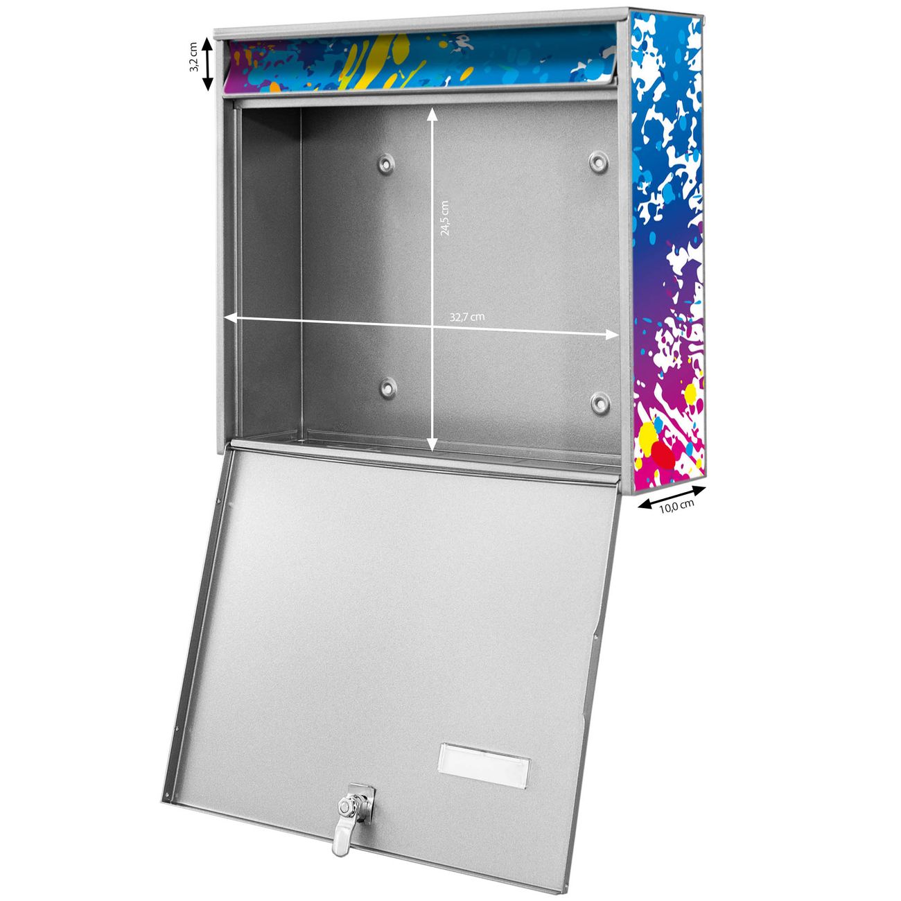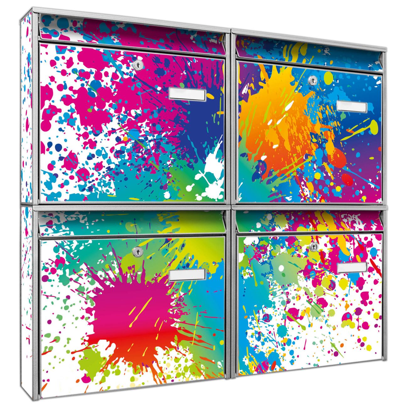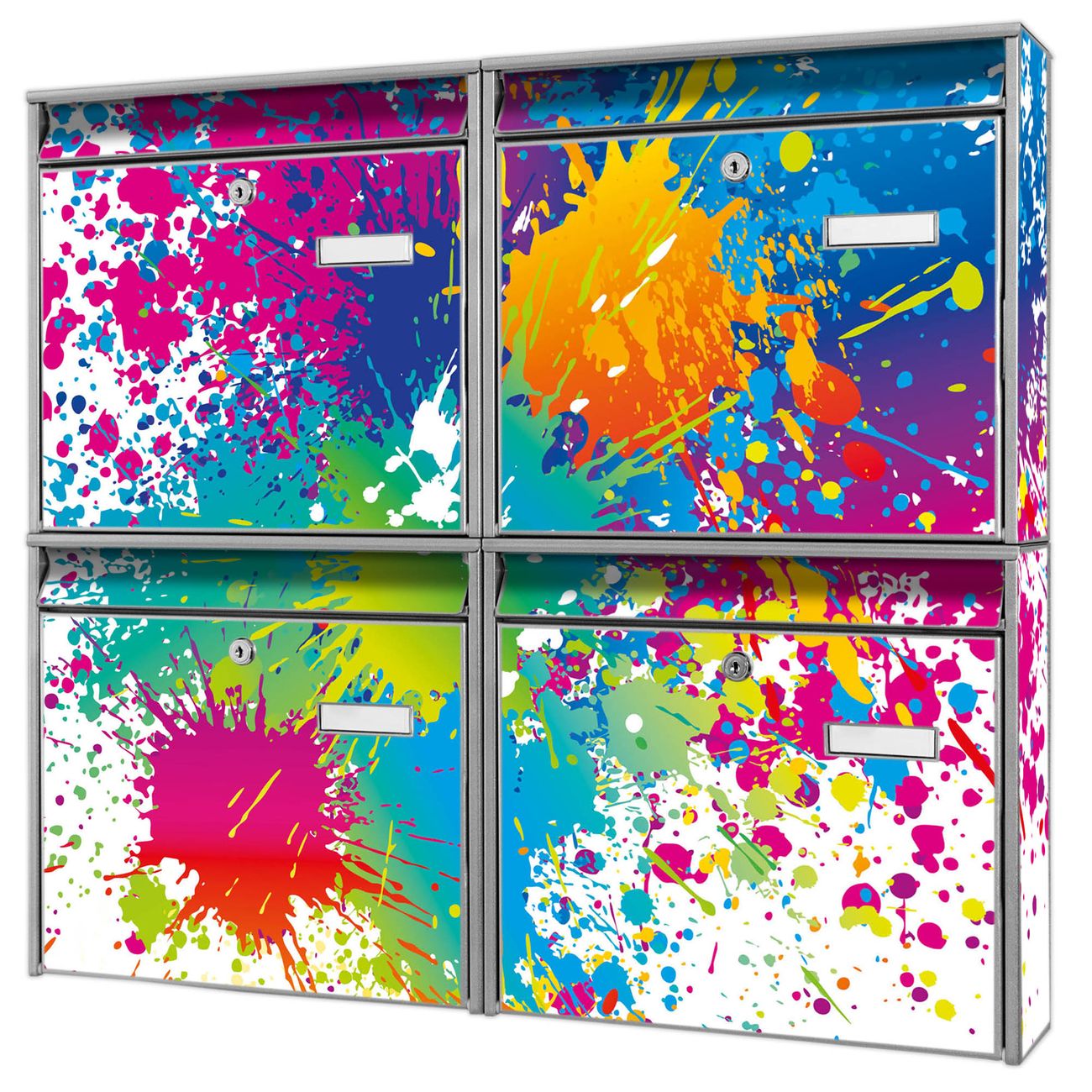 FUNKTION: Die Burg-Wächter Briefkastenanlage mit Motiv Farbspritzer bietet Ihnen ausreichend Fassungsvermögen um auch A4 und C4 Sendungen zu empfangen. Das integrierte Namensschild lässt sich individuell beschriften. Wählen Sie aus den Grundfarben weiß, silber und schwarz. DESIGN: Die 4 Briefkästen haben ein ansprechendes und zeitloses Design, ohne dabei auf Funktionalität zu verzichten. Das Material ist sehr stabil, wetterfest und rostfrei. Durch das Motiv Farbspritzer werden die Postkästen zu einem Blickfang. DETAILS: Die Postkästen bestehen aus verzinktem Stahl der zusätzlich mit Klarlack versiegelt wurde. Die Kästen sind gesamt 64,5cm hoch, 72,5cm breit und 10cm tief. Das Motiv besteht aus einer wetter- und UV-festen Folie, die Ihren Briefkasten zusätzlich vor Kratzern schützt. Die Postkästen werden mit Montagematerial, je einem Namensschild und je zwei Schlüsseln geliefert. NUTZEN: Das Briefkastenset eignet sich für die Wandmontage, die Größe bietet genügend Platz für Sendungen aller Art. Das zeitlose Design sowie die stabile Bauart bieten Ihnen einen treuen Begleiter für Ihre Post. BANJADO: