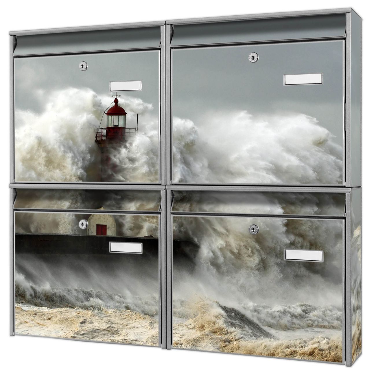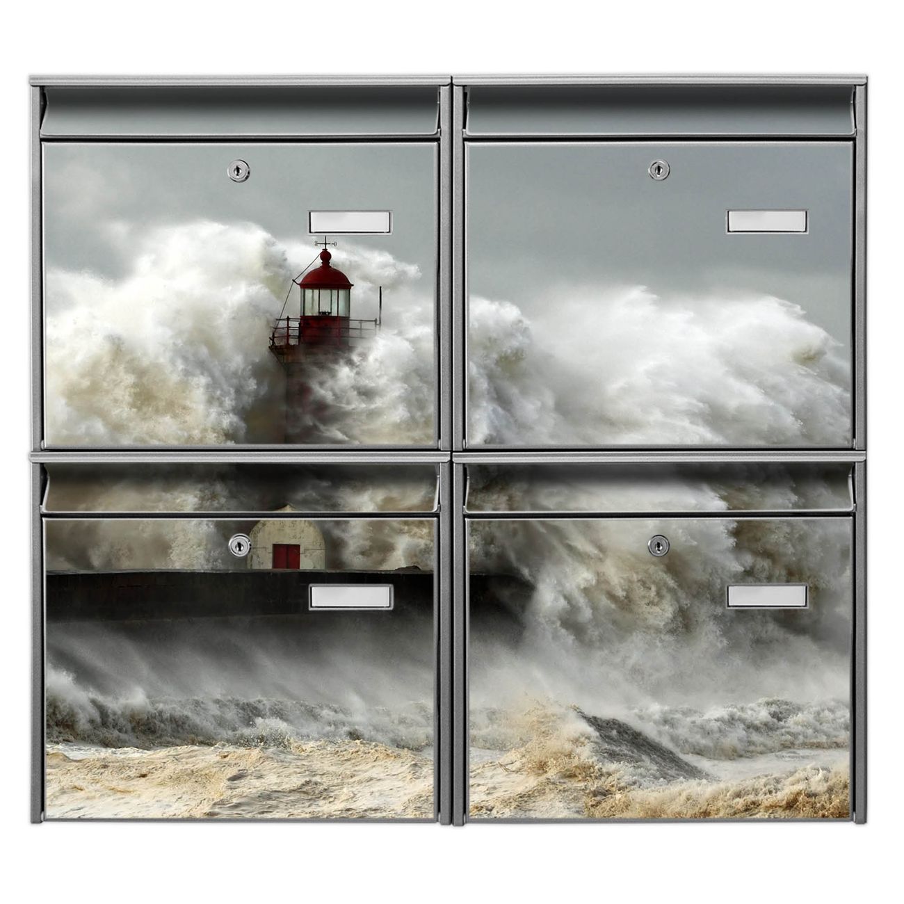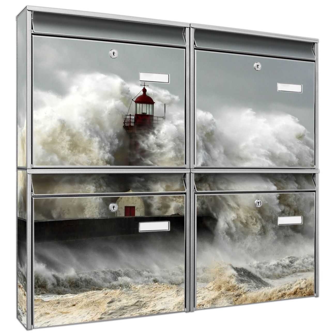 FUNKTION: Die Burg-Wächter Briefkastenanlage mit Motiv Fels In Der Brandung bietet Ihnen ausreichend Fassungsvermögen um auch A4 und C4 Sendungen zu empfangen. Das integrierte Namensschild lässt sich individuell beschriften. Wählen Sie aus den Grundfarben weiß, silber und schwarz. DESIGN: Die 4 Briefkästen haben ein ansprechendes und zeitloses Design, ohne dabei auf Funktionalität zu verzichten. Das Material ist sehr stabil, wetterfest und rostfrei. Durch das Motiv Fels In Der Brandung werden die Postkästen zu einem Blickfang. DETAILS: Die Postkästen bestehen aus verzinktem Stahl der zusätzlich mit Klarlack versiegelt wurde. Die Kästen sind gesamt 64,5cm hoch, 72,5cm breit und 10cm tief. Das Motiv besteht aus einer wetter- und UV-festen Folie, die Ihren Briefkasten zusätzlich vor Kratzern schützt. Die Postkästen werden mit Montagematerial, je einem Namensschild und je zwei Schlüsseln geliefert. NUTZEN: Das Briefkastenset eignet sich für die Wandmontage, die Größe bietet genügend Platz für Sendungen aller Art. Das zeitlose Design sowie die stabile Bauart bieten Ihnen einen treuen Begleiter für Ihre Post. BANJADO:
