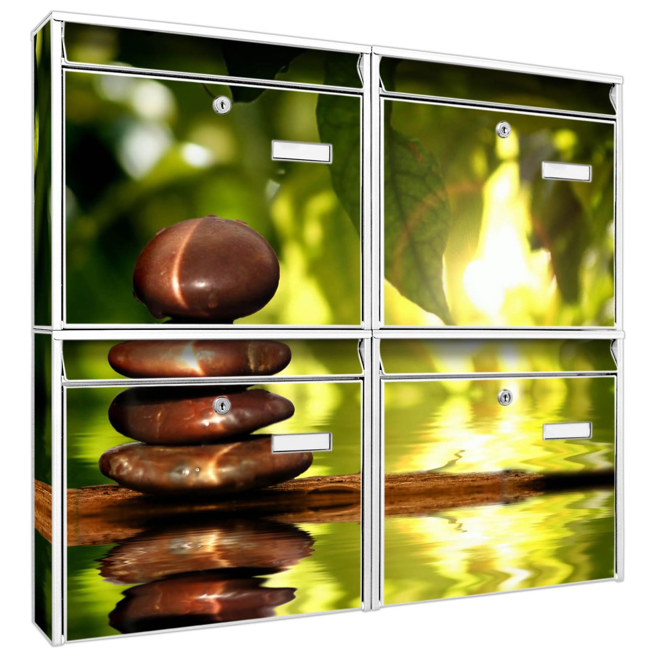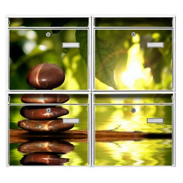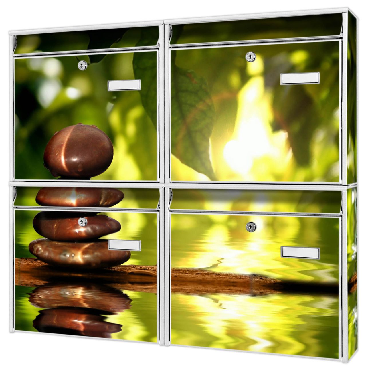 FUNKTION: Die Burg-Wächter Briefkastenanlage mit Motiv Feng Shui bietet Ihnen ausreichend Fassungsvermögen um auch A4 und C4 Sendungen zu empfangen. Das integrierte Namensschild lässt sich individuell beschriften. Wählen Sie aus den Grundfarben weiß, silber und schwarz. DESIGN: Die 4 Briefkästen haben ein ansprechendes und zeitloses Design, ohne dabei auf Funktionalität zu verzichten. Das Material ist sehr stabil, wetterfest und rostfrei. Durch das Motiv Feng Shui werden die Postkästen zu einem Blickfang. DETAILS: Die Postkästen bestehen aus verzinktem Stahl der zusätzlich mit Klarlack versiegelt wurde. Die Kästen sind gesamt 64,5cm hoch, 72,5cm breit und 10cm tief. Das Motiv besteht aus einer wetter- und UV-festen Folie, die Ihren Briefkasten zusätzlich vor Kratzern schützt. Die Postkästen werden mit Montagematerial, je einem Namensschild und je zwei Schlüsseln geliefert. NUTZEN: Das Briefkastenset eignet sich für die Wandmontage, die Größe bietet genügend Platz für Sendungen aller Art. Das zeitlose Design sowie die stabile Bauart bieten Ihnen einen treuen Begleiter für Ihre Post. BANJADO: