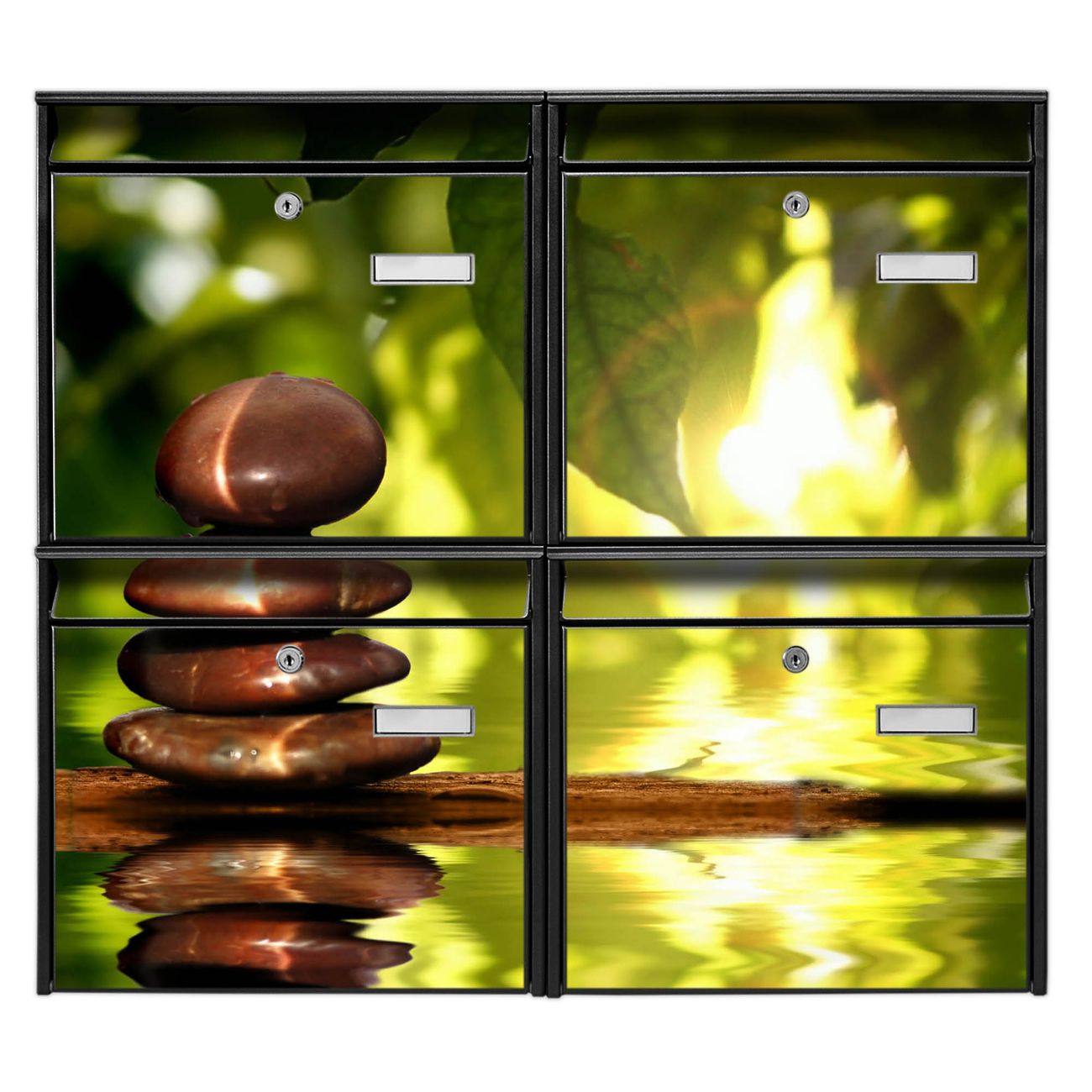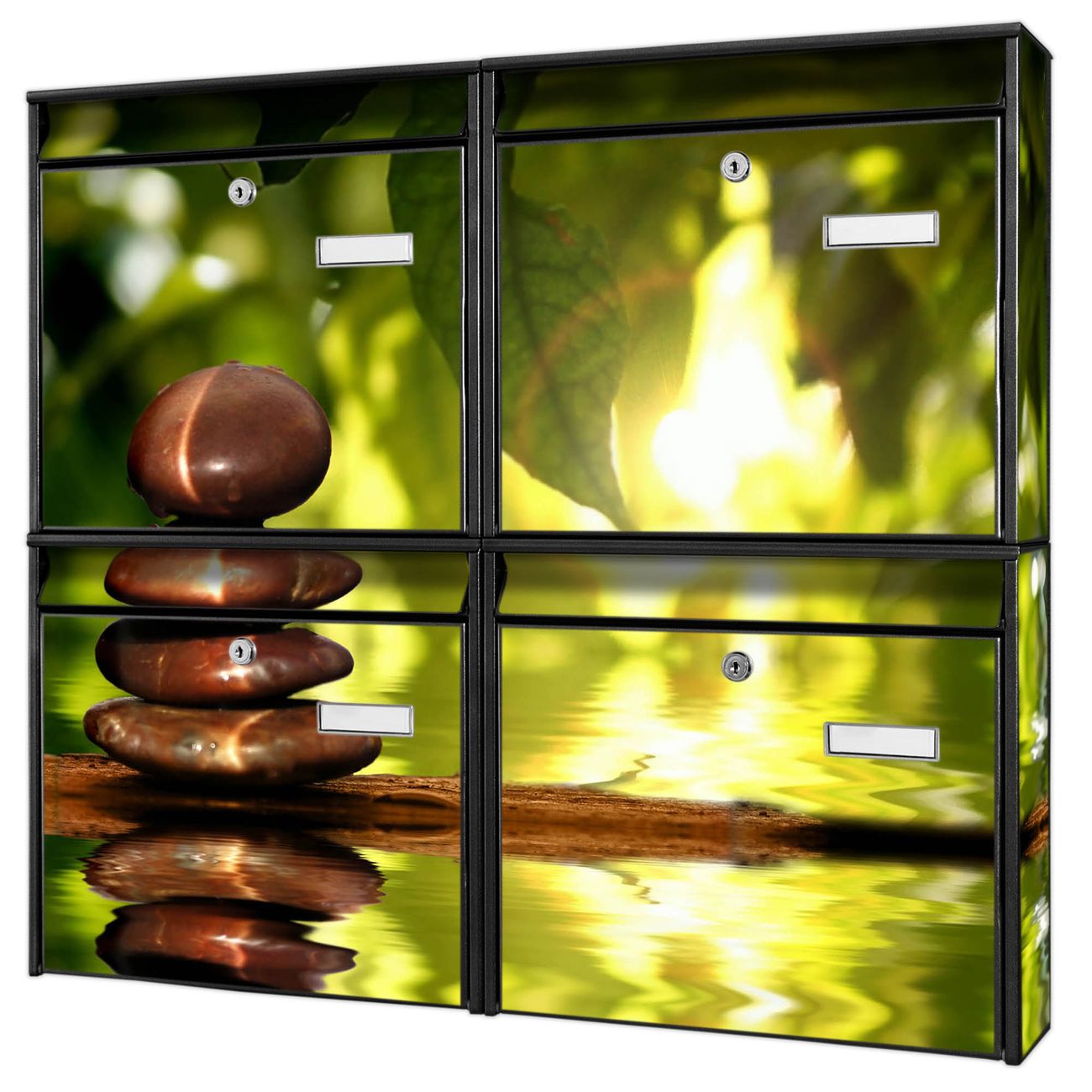 FUNKTION: Die Burg-Wächter Briefkastenanlage mit Motiv Feng Shui bietet Ihnen ausreichend Fassungsvermögen um auch A4 und C4 Sendungen zu empfangen. Das integrierte Namensschild lässt sich individuell beschriften. Wählen Sie aus den Grundfarben weiß, silber und schwarz. DESIGN: Die 4 Briefkästen haben ein ansprechendes und zeitloses Design, ohne dabei auf Funktionalität zu verzichten. Das Material ist sehr stabil, wetterfest und rostfrei. Durch das Motiv Feng Shui werden die Postkästen zu einem Blickfang. DETAILS: Die Postkästen bestehen aus verzinktem Stahl der zusätzlich mit Klarlack versiegelt wurde. Die Kästen sind gesamt 64,5cm hoch, 72,5cm breit und 10cm tief. Das Motiv besteht aus einer wetter- und UV-festen Folie, die Ihren Briefkasten zusätzlich vor Kratzern schützt. Die Postkästen werden mit Montagematerial, je einem Namensschild und je zwei Schlüsseln geliefert. NUTZEN: Das Briefkastenset eignet sich für die Wandmontage, die Größe bietet genügend Platz für Sendungen aller Art. Das zeitlose Design sowie die stabile Bauart bieten Ihnen einen treuen Begleiter für Ihre Post. BANJADO: