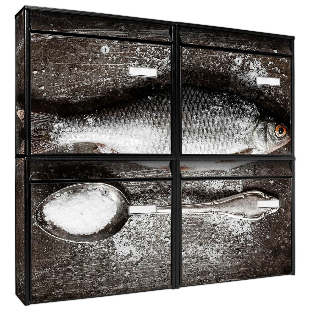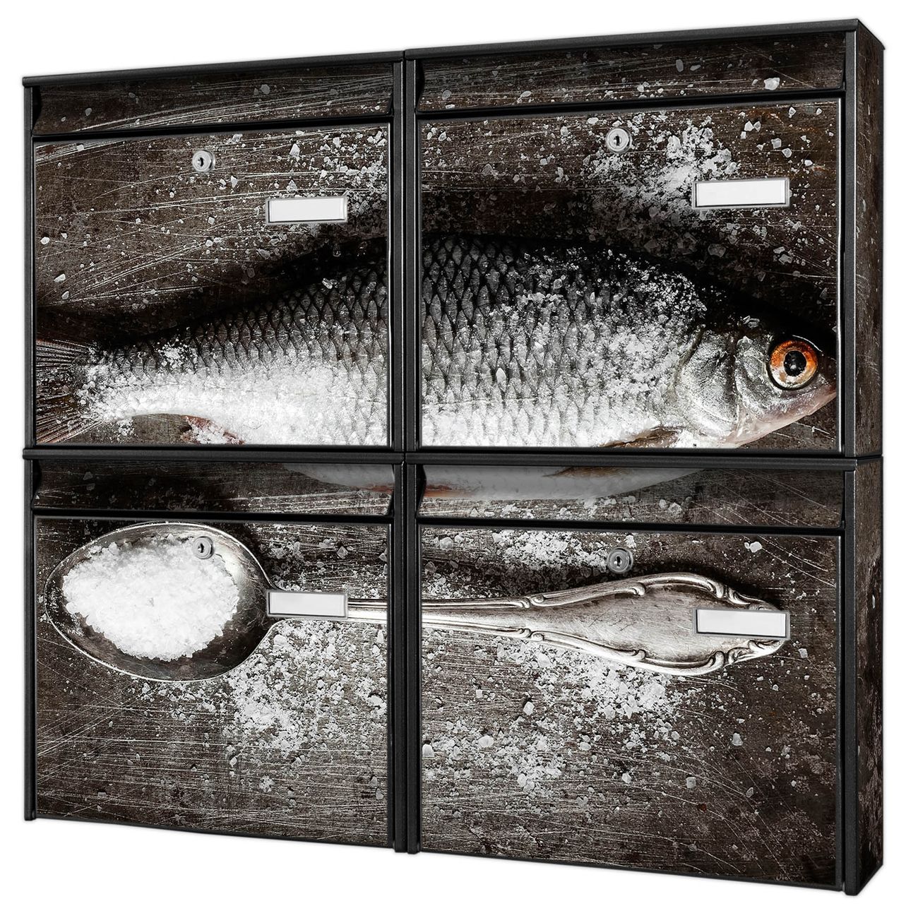 FUNKTION: Die Burg-Wächter Briefkastenanlage mit Motiv Fisch Und Salz bietet Ihnen ausreichend Fassungsvermögen um auch A4 und C4 Sendungen zu empfangen. Das integrierte Namensschild lässt sich individuell beschriften. Wählen Sie aus den Grundfarben weiß, silber und schwarz. DESIGN: Die 4 Briefkästen haben ein ansprechendes und zeitloses Design, ohne dabei auf Funktionalität zu verzichten. Das Material ist sehr stabil, wetterfest und rostfrei. Durch das Motiv Fisch Und Salz werden die Postkästen zu einem Blickfang. DETAILS: Die Postkästen bestehen aus verzinktem Stahl der zusätzlich mit Klarlack versiegelt wurde. Die Kästen sind gesamt 64,5cm hoch, 72,5cm breit und 10cm tief. Das Motiv besteht aus einer wetter- und UV-festen Folie, die Ihren Briefkasten zusätzlich vor Kratzern schützt. Die Postkästen werden mit Montagematerial, je einem Namensschild und je zwei Schlüsseln geliefert. NUTZEN: Das Briefkastenset eignet sich für die Wandmontage, die Größe bietet genügend Platz für Sendungen aller Art. Das zeitlose Design sowie die stabile Bauart bieten Ihnen einen treuen Begleiter für Ihre Post. BANJADO: