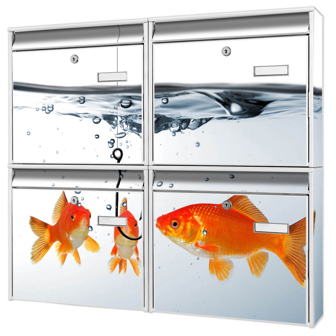 FUNKTION: Die Burg-Wächter Briefkastenanlage mit Motiv Fische bietet Ihnen ausreichend Fassungsvermögen um auch A4 und C4 Sendungen zu empfangen. Das integrierte Namensschild lässt sich individuell beschriften. Wählen Sie aus den Grundfarben weiß, silber und schwarz. DESIGN: Die 4 Briefkästen haben ein ansprechendes und zeitloses Design, ohne dabei auf Funktionalität zu verzichten. Das Material ist sehr stabil, wetterfest und rostfrei. Durch das Motiv Fische werden die Postkästen zu einem Blickfang. DETAILS: Die Postkästen bestehen aus verzinktem Stahl der zusätzlich mit Klarlack versiegelt wurde. Die Kästen sind gesamt 64,5cm hoch, 72,5cm breit und 10cm tief. Das Motiv besteht aus einer wetter- und UV-festen Folie, die Ihren Briefkasten zusätzlich vor Kratzern schützt. Die Postkästen werden mit Montagematerial, je einem Namensschild und je zwei Schlüsseln geliefert. NUTZEN: Das Briefkastenset eignet sich für die Wandmontage, die Größe bietet genügend Platz für Sendungen aller Art. Das zeitlose Design sowie die stabile Bauart bieten Ihnen einen treuen Begleiter für Ihre Post. BANJADO: